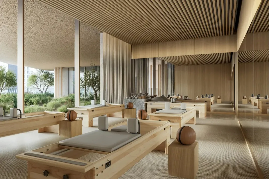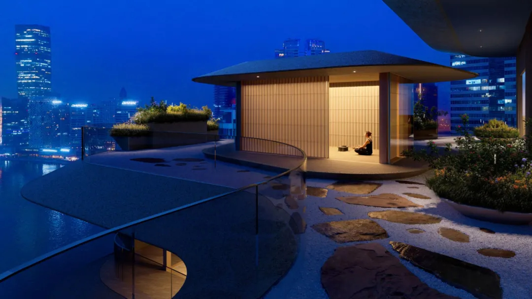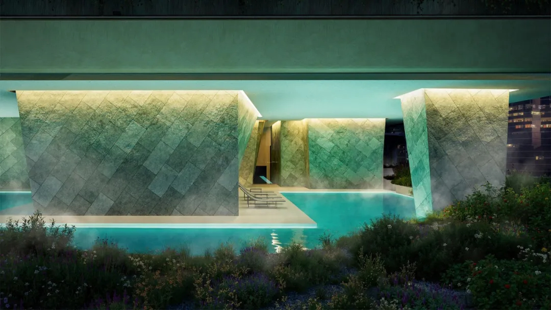 超过6000㎡的配套设施被创新地组织成一个“垂直山谷社区”。从地下1层以水景绿植营造归家宁静的“绿洲”,到2层适合社交庆祝的“山谷”餐饮区,再到3层灵感来自海岸线的活力泳池,以及17层专注于健康静修的“洞穴”和36层供私密思考的“山”,每一层都是一个主题鲜明的生活场景。全球知名景观事务所打造的立体绿化系统,与隈研吾设计的日式茶亭点缀其中,共同将整座塔楼变为一个与自然共呼吸的生命体。