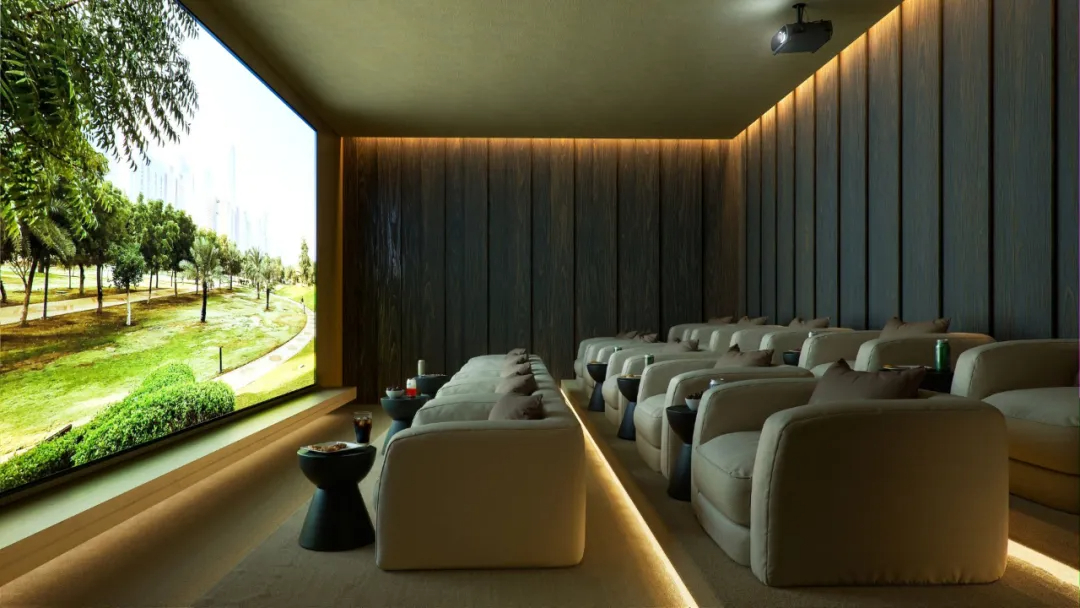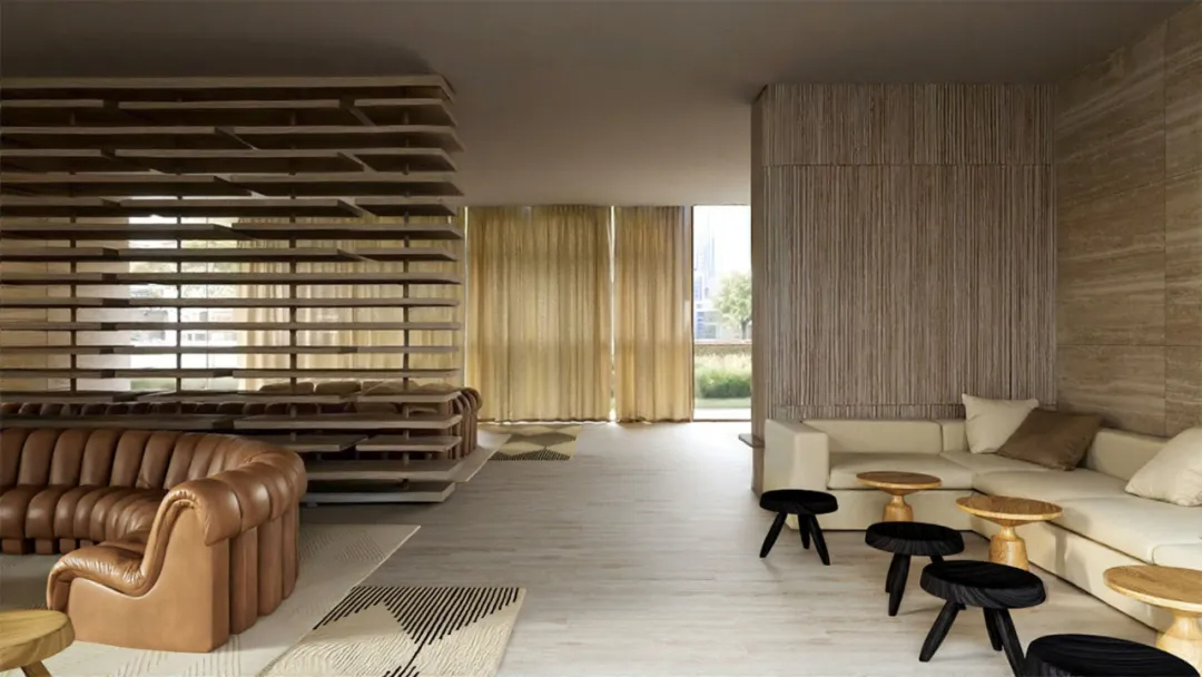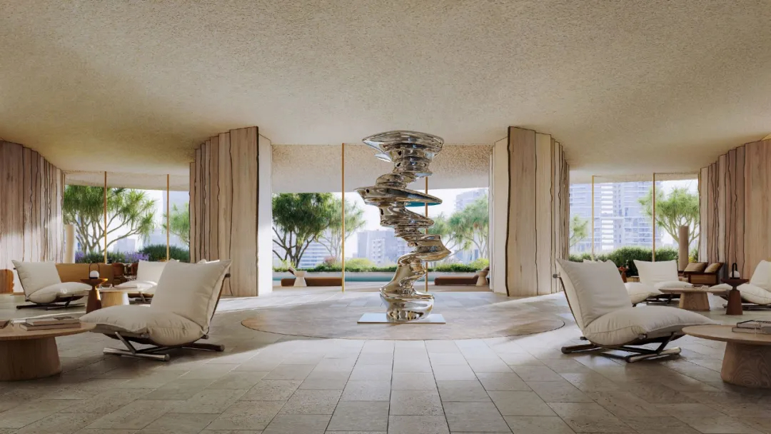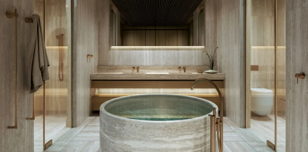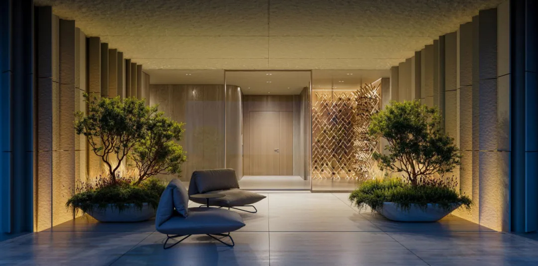 室内空间则贯彻“安静的奢华”。大堂公区在天然石材、暖色木饰面与金属细节间寻得平衡,隐性灯带营造出静谧递进的光影氛围。项目共规划149套住宅,户型从三居到顶层公寓,满足多元需求。特别是面积约4075㎡的空中别墅,以“垂直豪宅”理念打造,拥有专属电梯、私人泳池及独立生活楼层,宛若悬浮于空中的世外桃源。