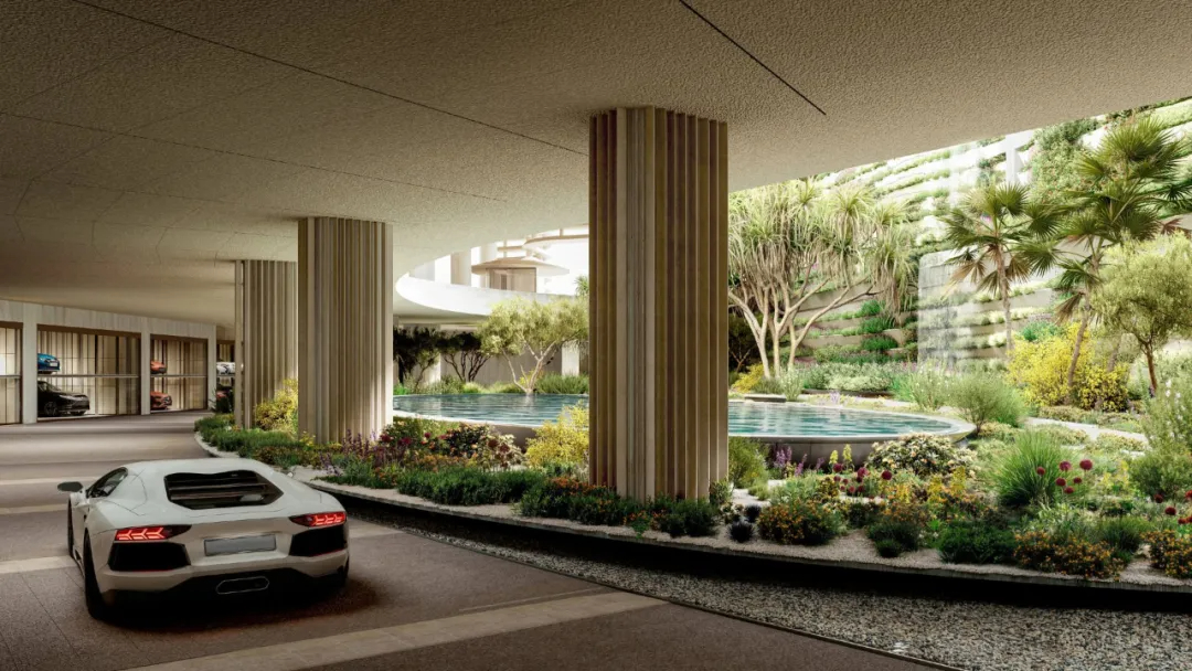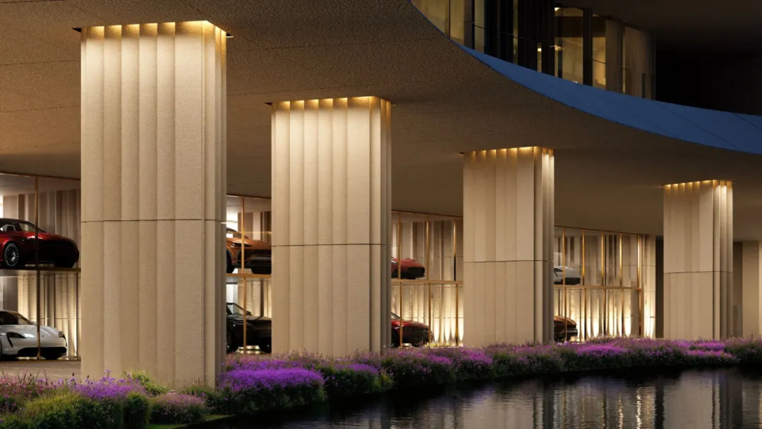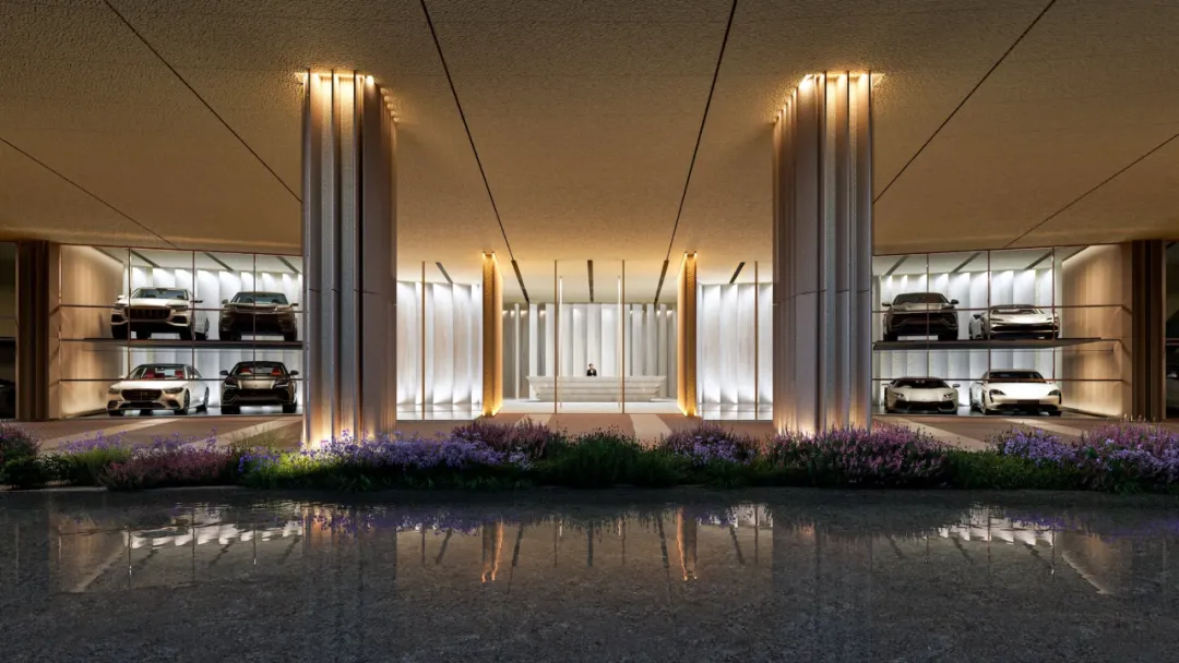 设计的巧思从抵达那一刻便开始上演。入口以“静谧抵达”为理念,通过水平延展的体量、细腻的材质与柔和光影,引导归家动线。而最颠覆传统的莫过于其“展陈式车廊”,它将住户的座驾如艺术品般层叠展示于下沉空间,结合智能导引与酒店级灯光,将日常停车转化为一场关于品位的生活仪式。