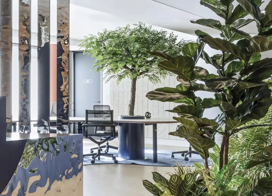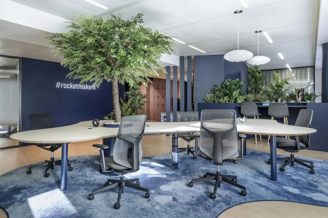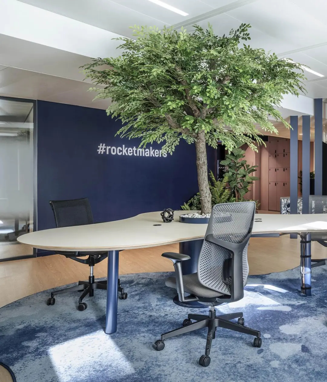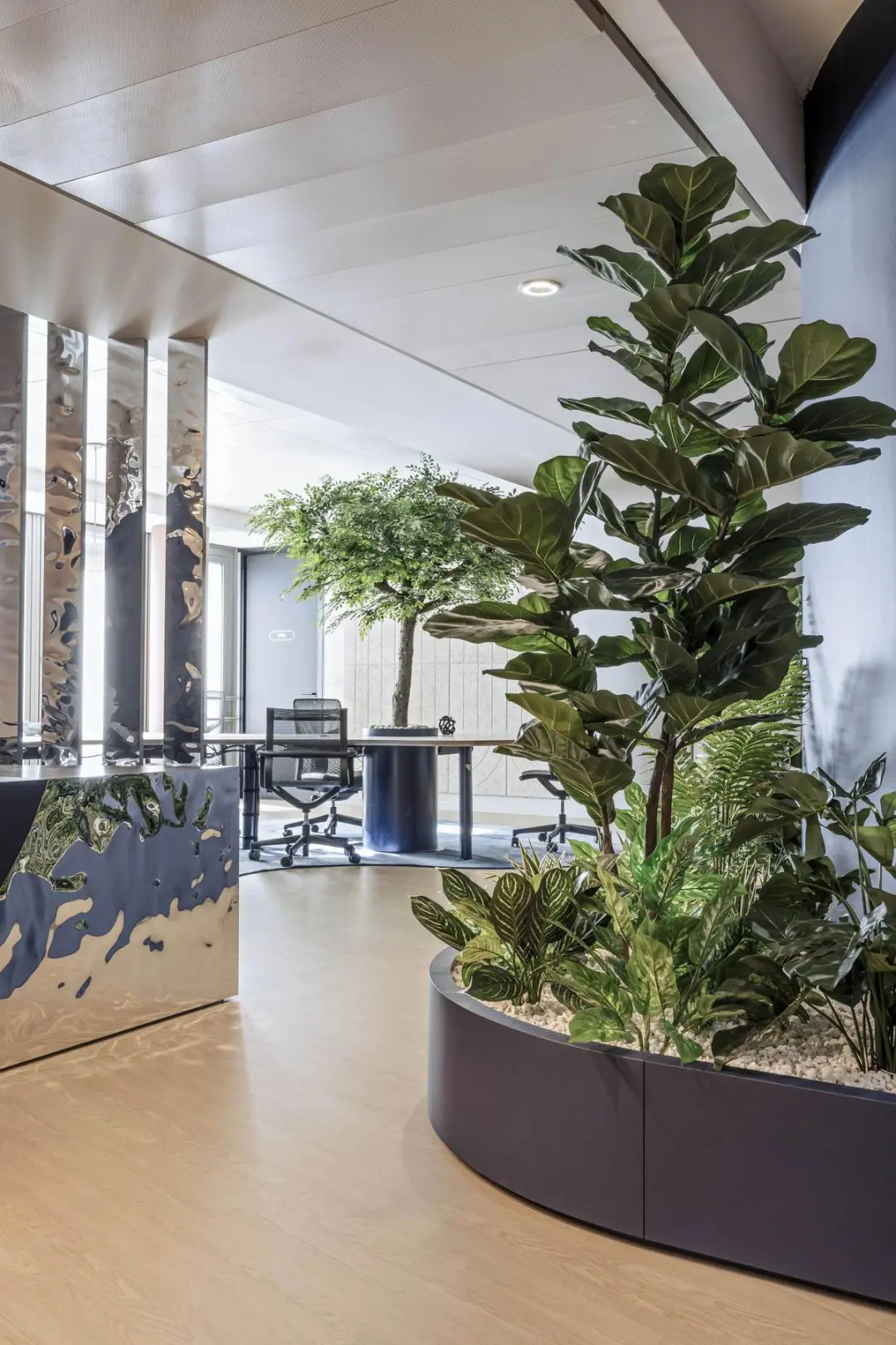 在材料与符号的转译上,设计呈现出精准的叙事性。象征火焰张力的 Alpi 木皮、呼应自然本真的再生涂料与地材、暗喻海洋通透的镜面元素,构成环保材料体系,践行可持续理念。空间视觉焦点则落在火箭造型装置上,它既锚定了企业的航天属性,传递着永不止步的创新精神,也承载着团队对浩瀚星海的无限向往。随处可见的绿植更是点睛之笔,将自然气息渗透至每个角落,强化了企业使命与自然的深层联结。