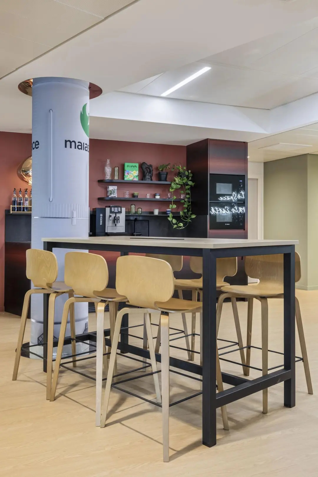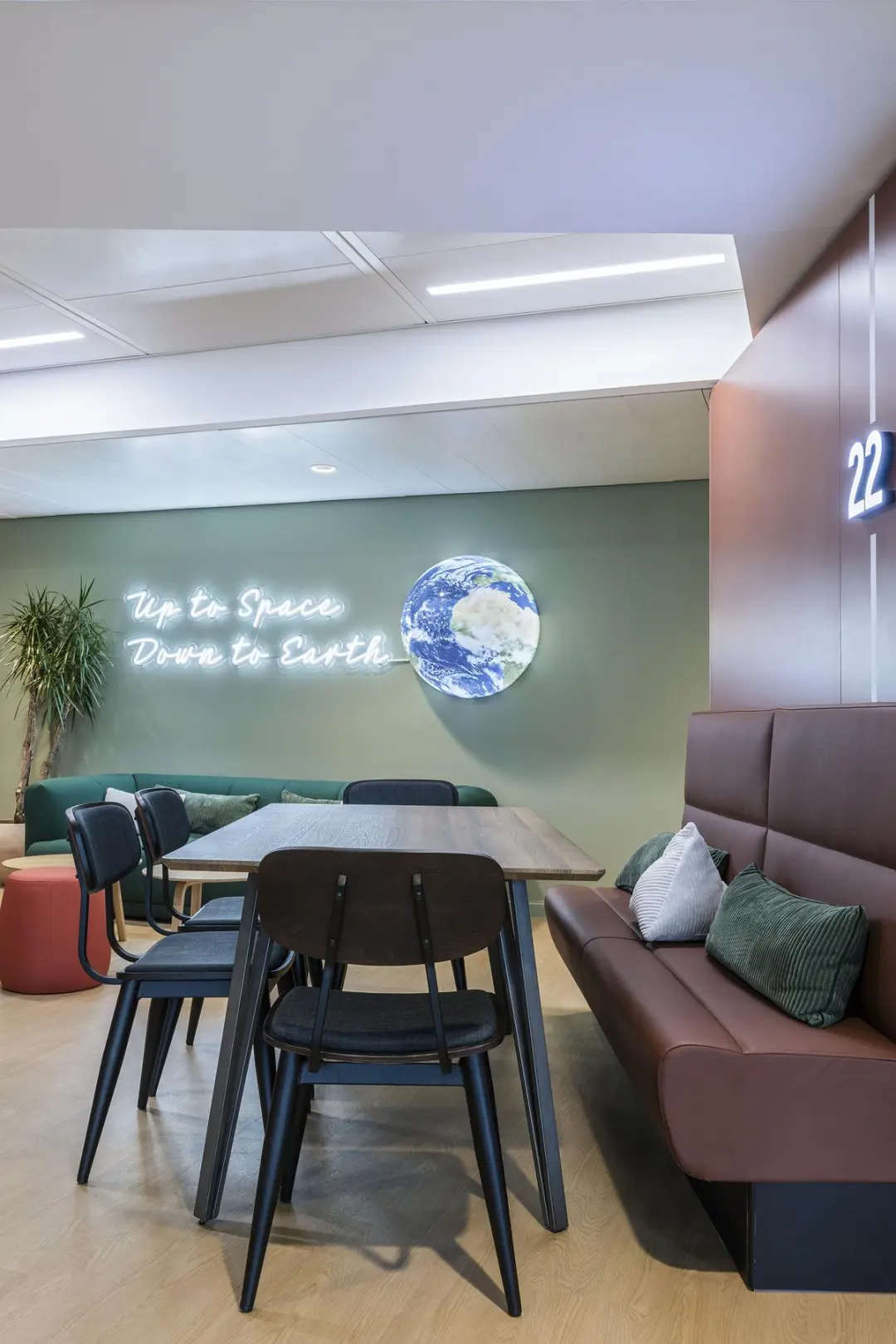 设计的创意脉络,源自“火、水、气、土”四大自然元素——这组承载着万物本源的符号,恰好与 Ariane Group 探索宇宙的企业基因相契合。Sowen 并未将元素符号化堆砌,而是将其转化为贯穿设计全程的逻辑线索,从空间布局的功能划分,到材料肌理的触感表达,再到视觉符号的精神传递,每一处细节都围绕这一核心展开,最终构建出兼具协作活力与身心舒适的和谐场域。