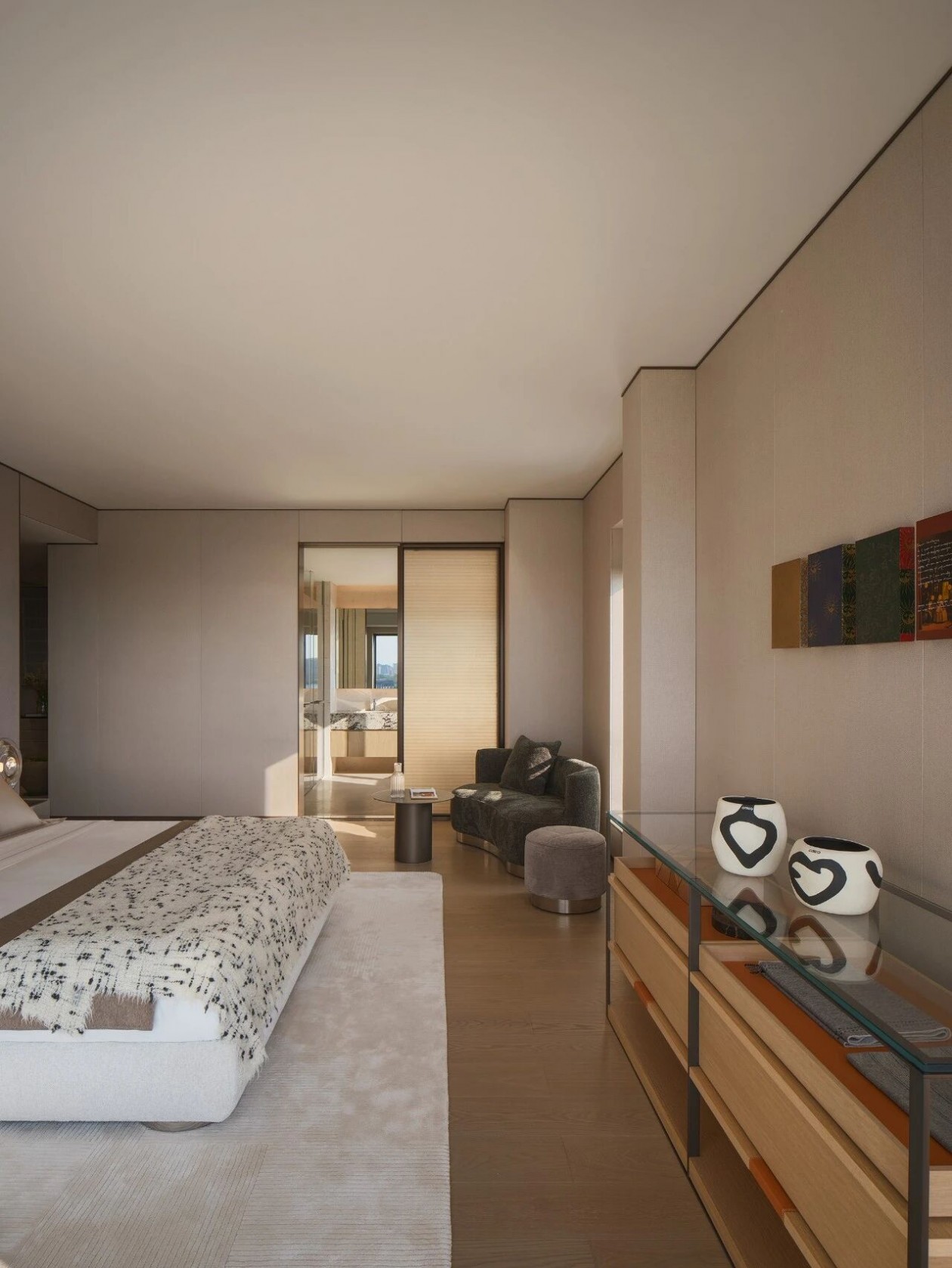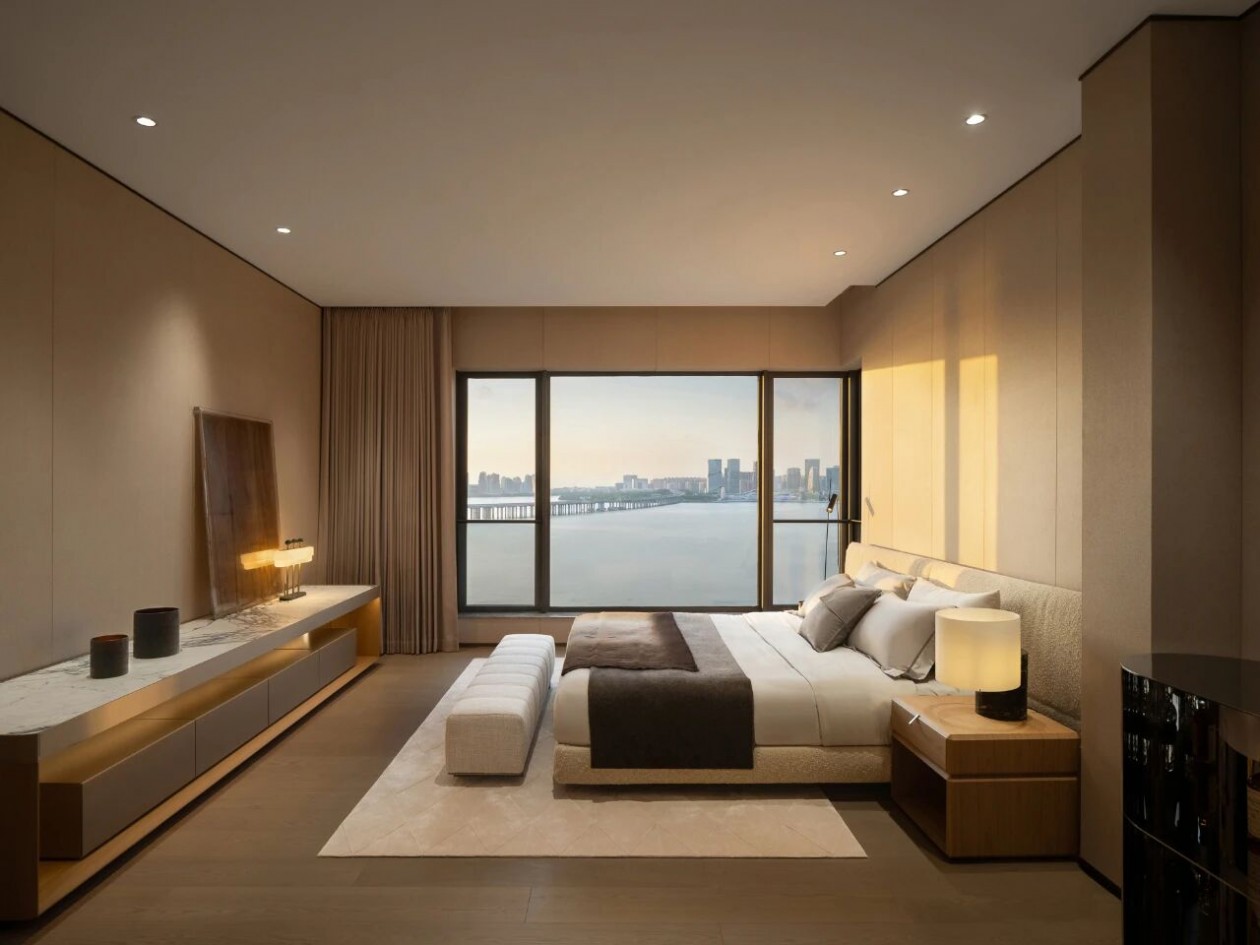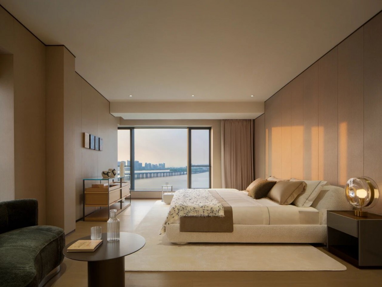 女主卧如温柔港湾:Minotti圆润床体裹着绒感面料,似拥抱般予人安全感;窗边深草绿Lounge Sofa如苔痕漫入。