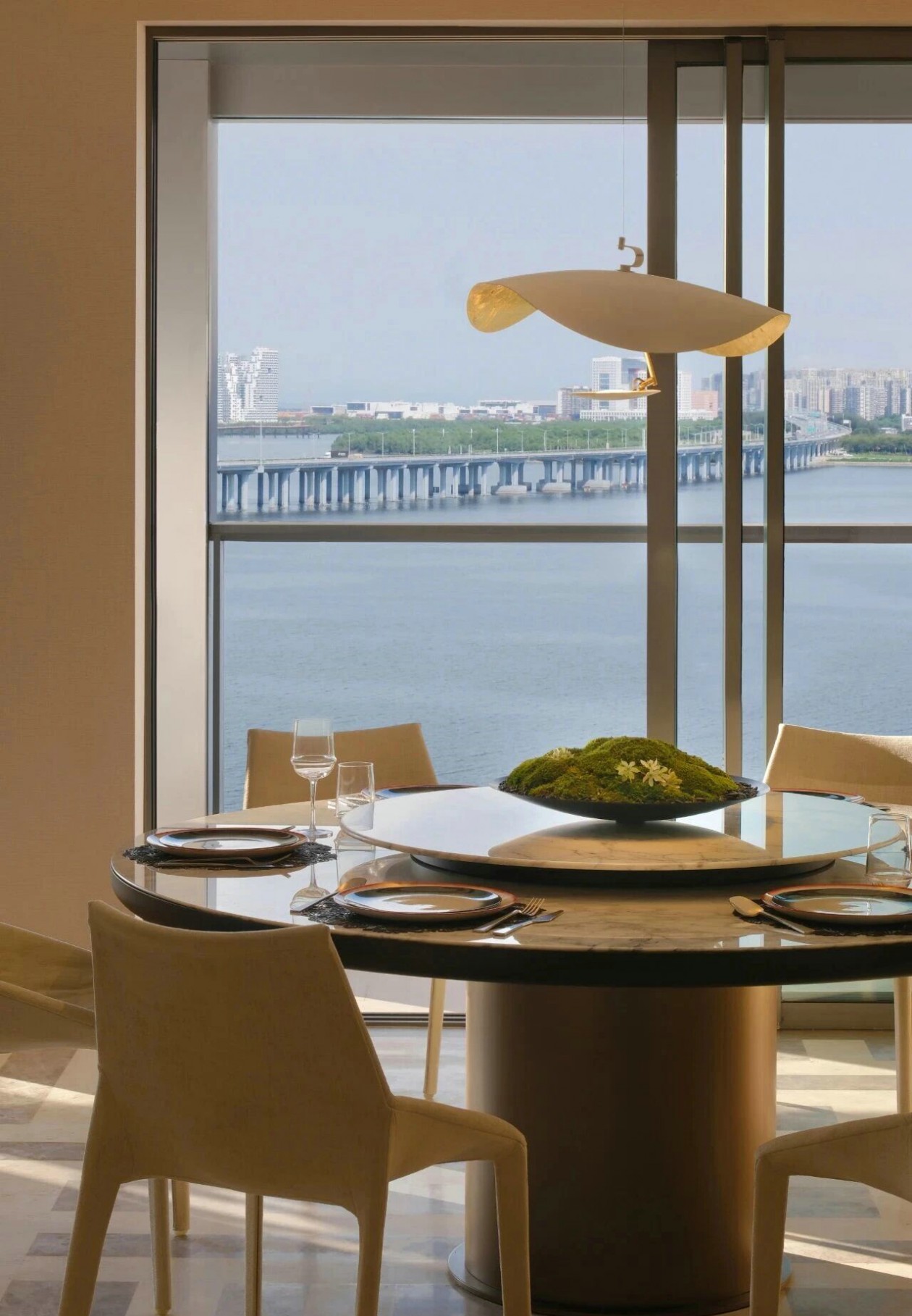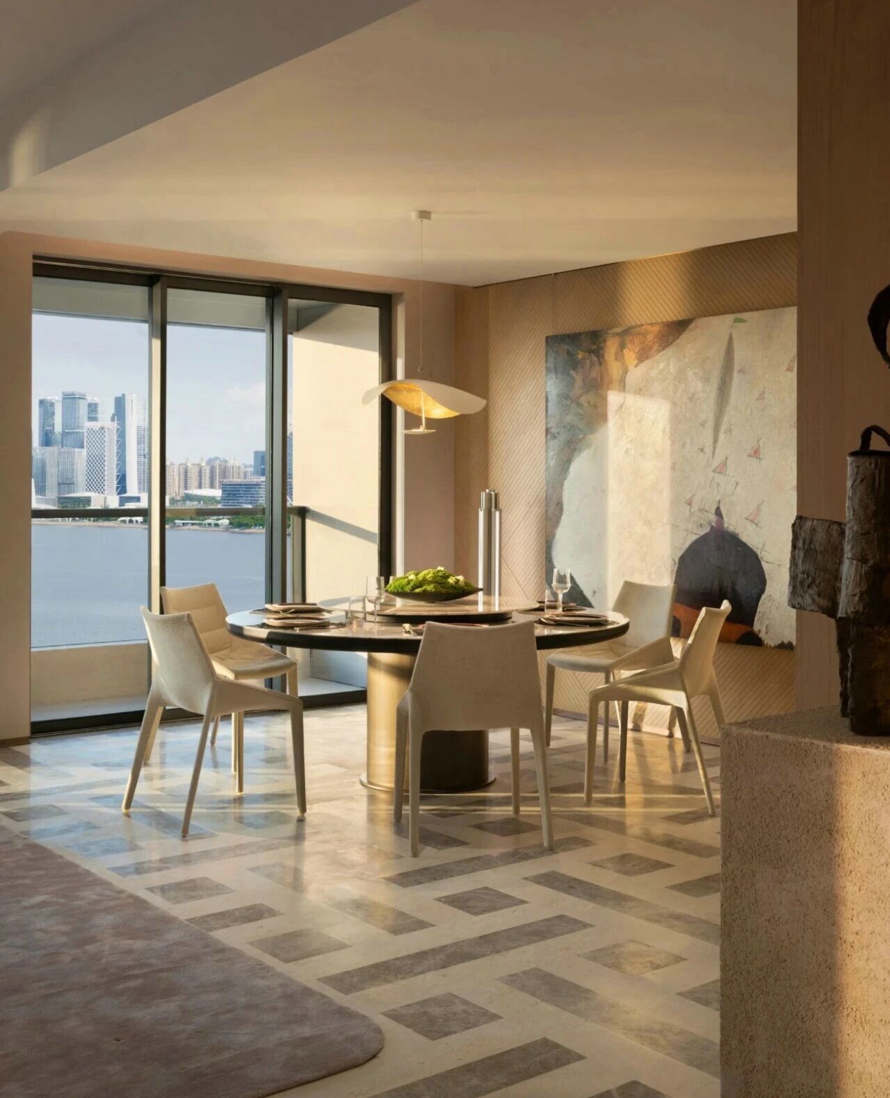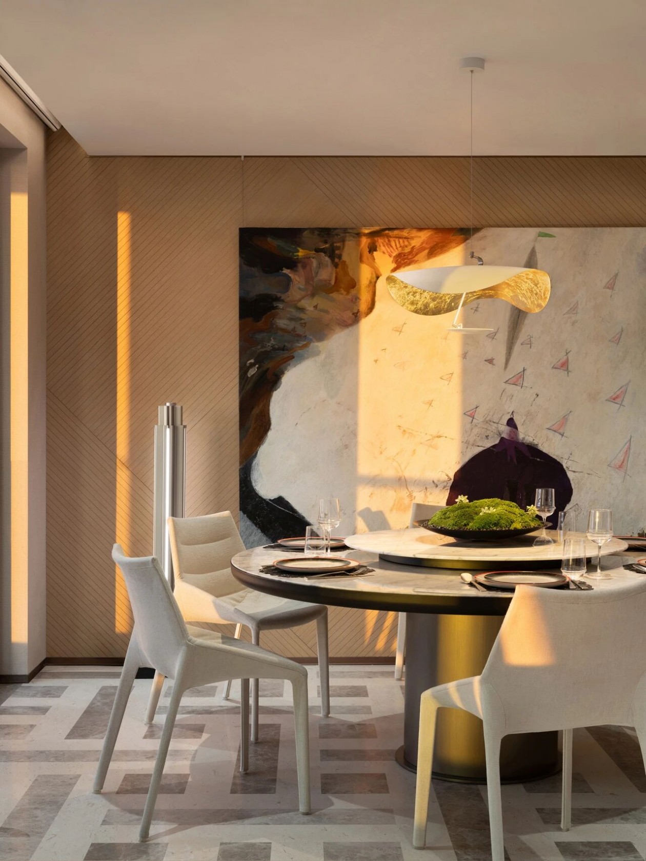 ▲餐厅|Minotti大理石餐桌如月初升,古铜桌腿托举出仪式感;餐椅围合出温厚弧度,与浅金几何吊灯共舞。