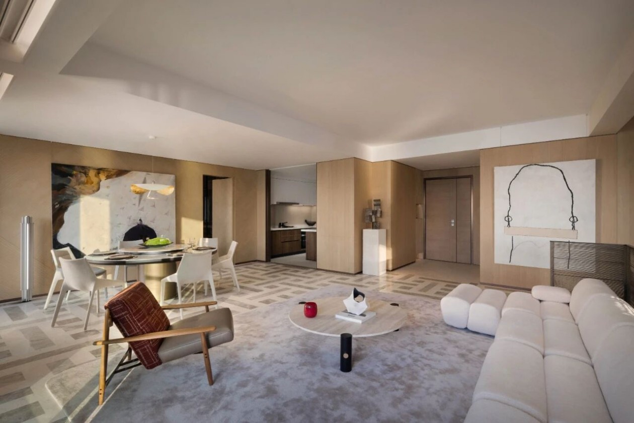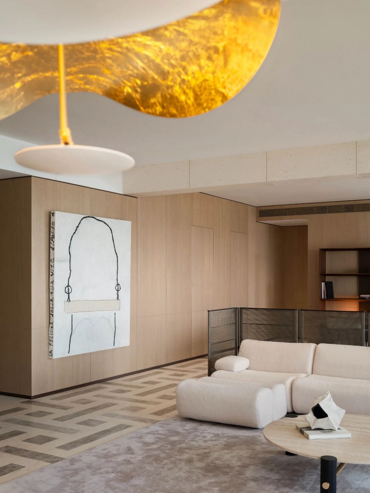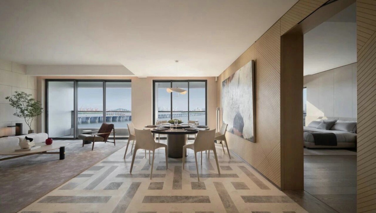 ▲餐厅|Minotti大理石餐桌如月初升,古铜桌腿托举出仪式感;餐椅围合出温厚弧度,与浅金几何吊灯共舞。
