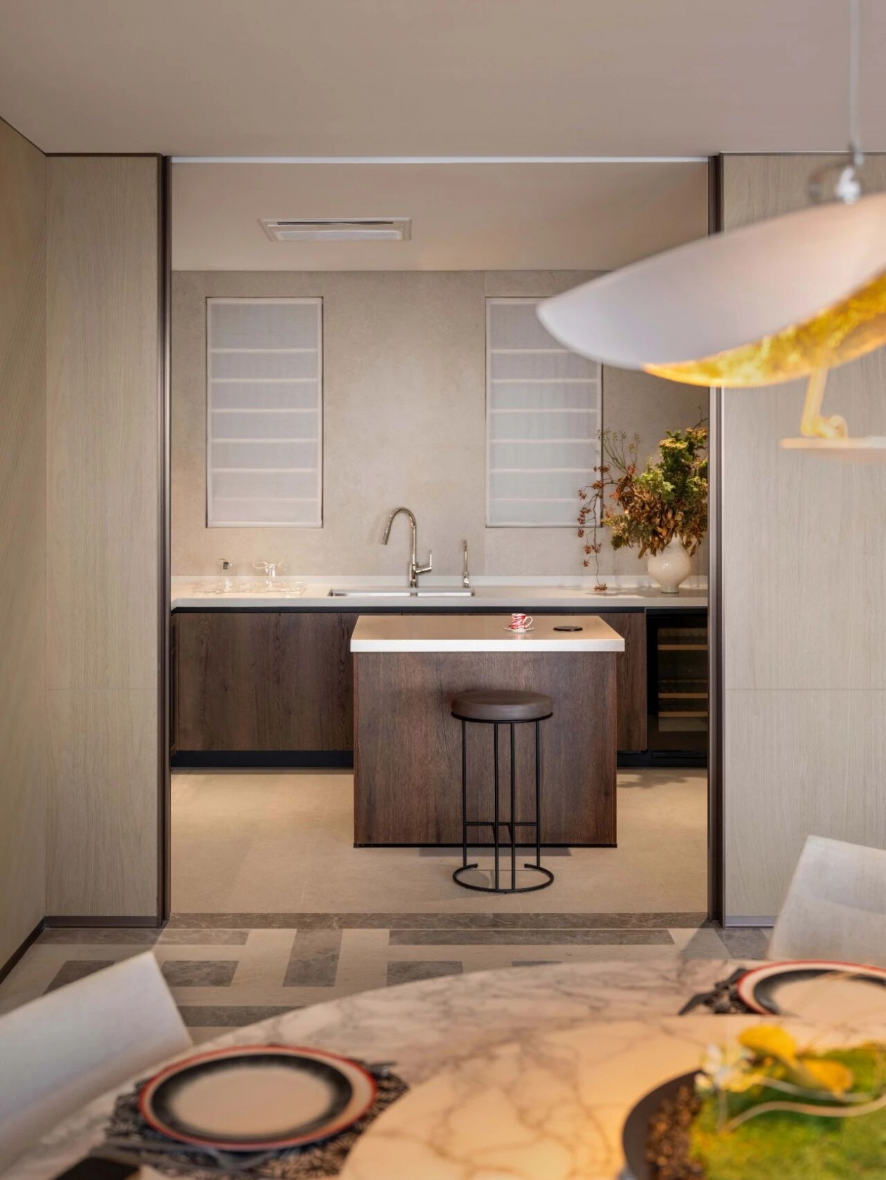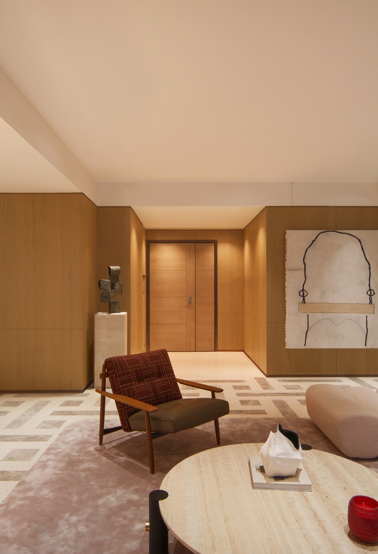视线随屏风通往茶室,延续“设计与生活共生”的理念,茶室以当代东方美学织就雅集之韵:不追浮华,只让艺术与日常均衡相拥,于无声处生温。