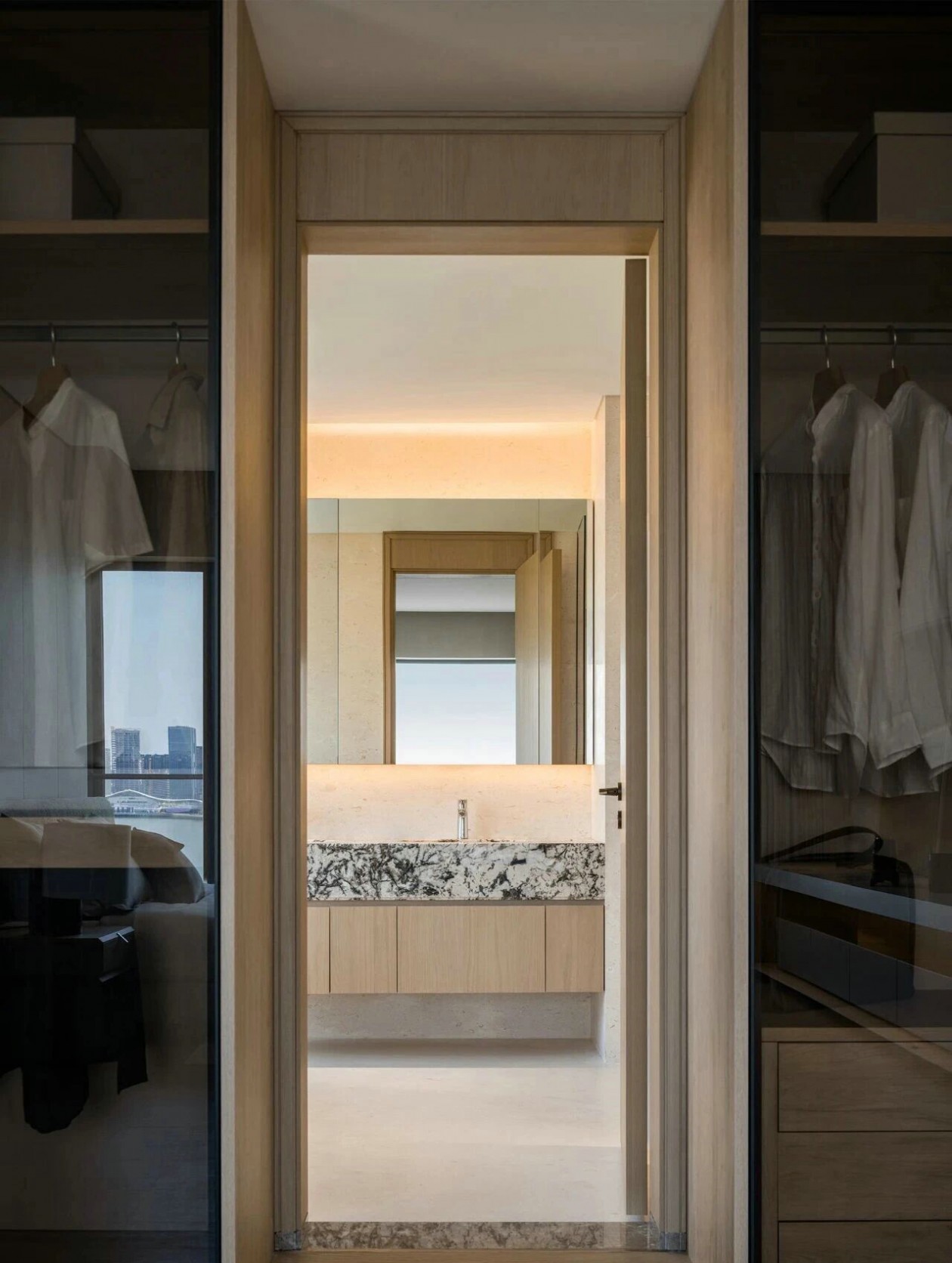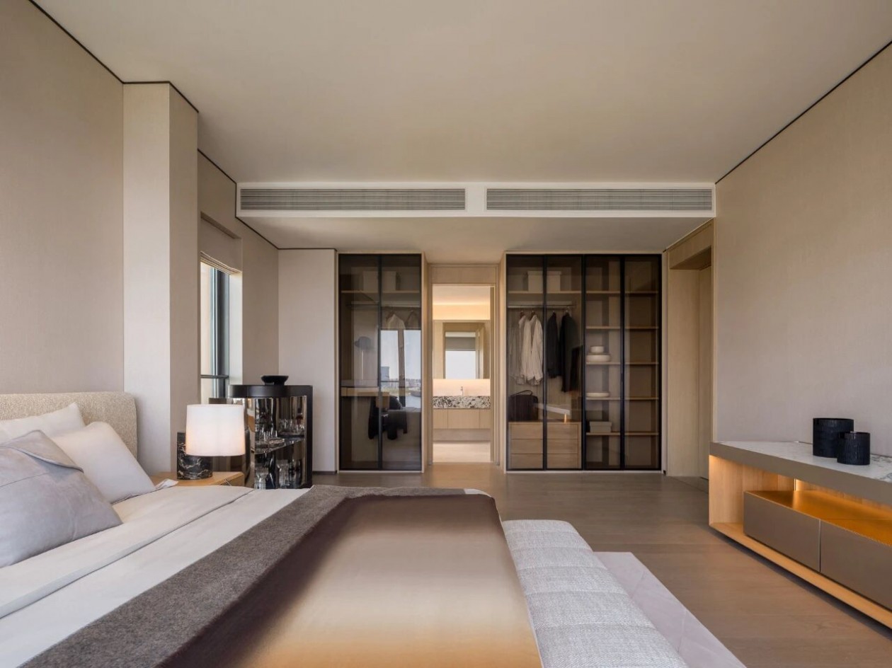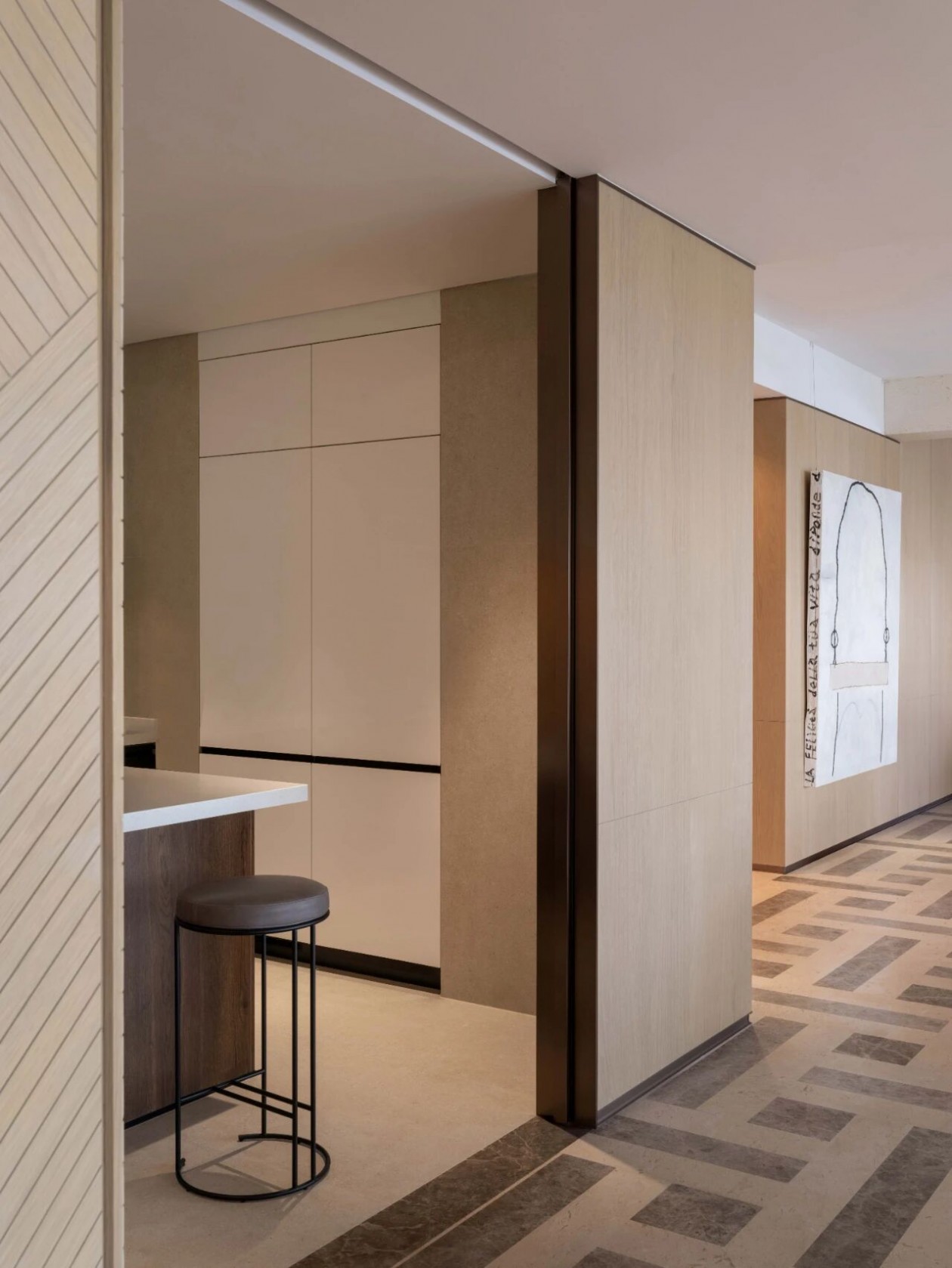 男主卧以“率直与松弛”平衡刚柔:Poliform床与Monlteni&C电视柜线条呼应,如松枝挺括,如云絮柔若;Baxter皮质酒柜斜置一角,添三分雅痞趣味。