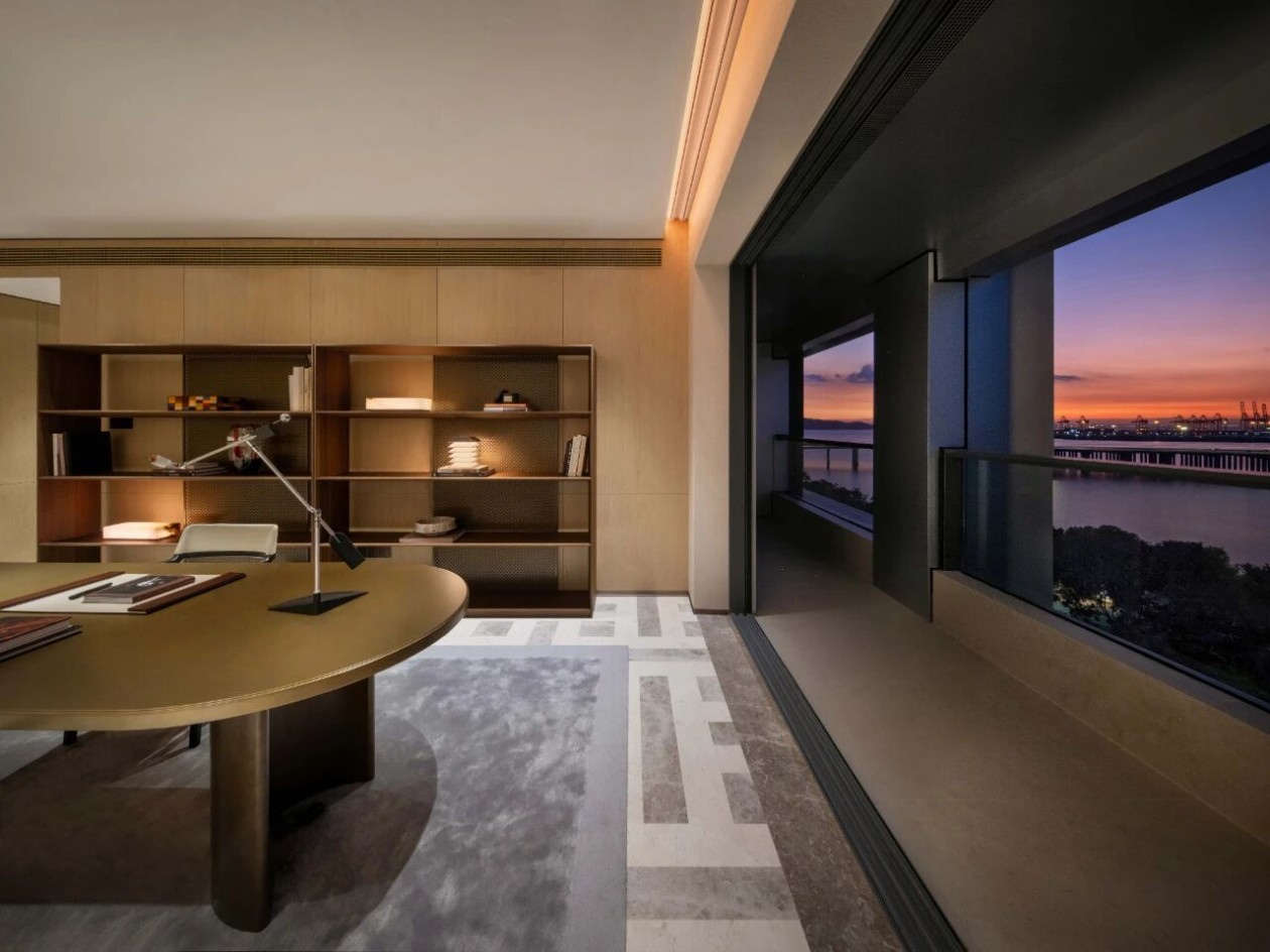 次卧空间,艺术家时天一的限量台灯置于案头,搭配B&B Italia书桌与Molteni&C的暗红书椅,那抹深邃朱红与客厅形成微妙视觉纽带。