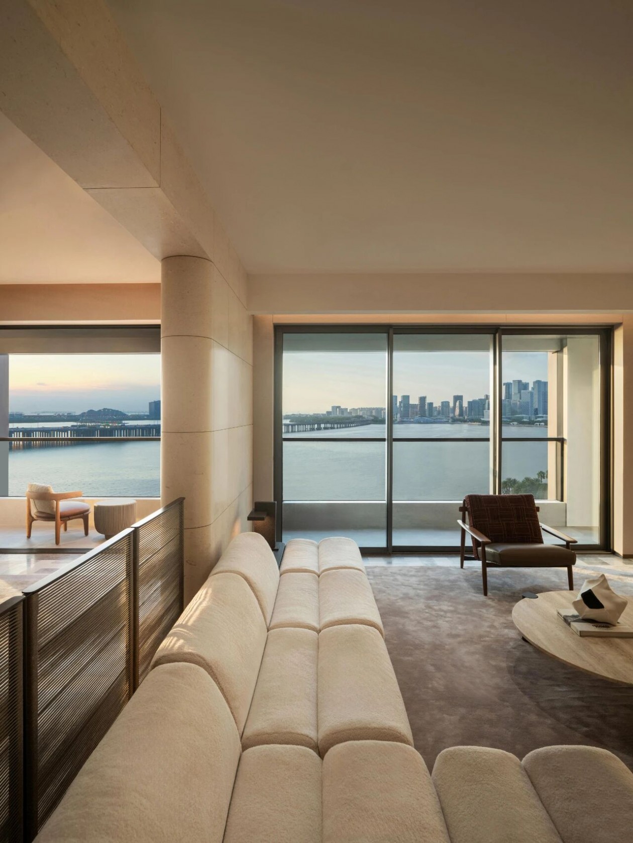 客厅|Minotti扶手椅与坐墩的一抹红如晨曦跃出海面,为素净空间添几分鲜活贵气,恰当地平衡海景的辽阔与居所的温情。