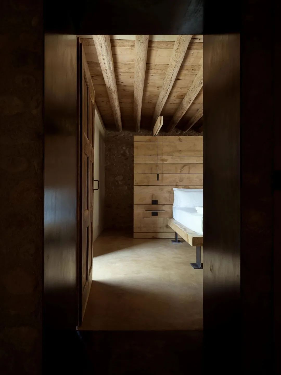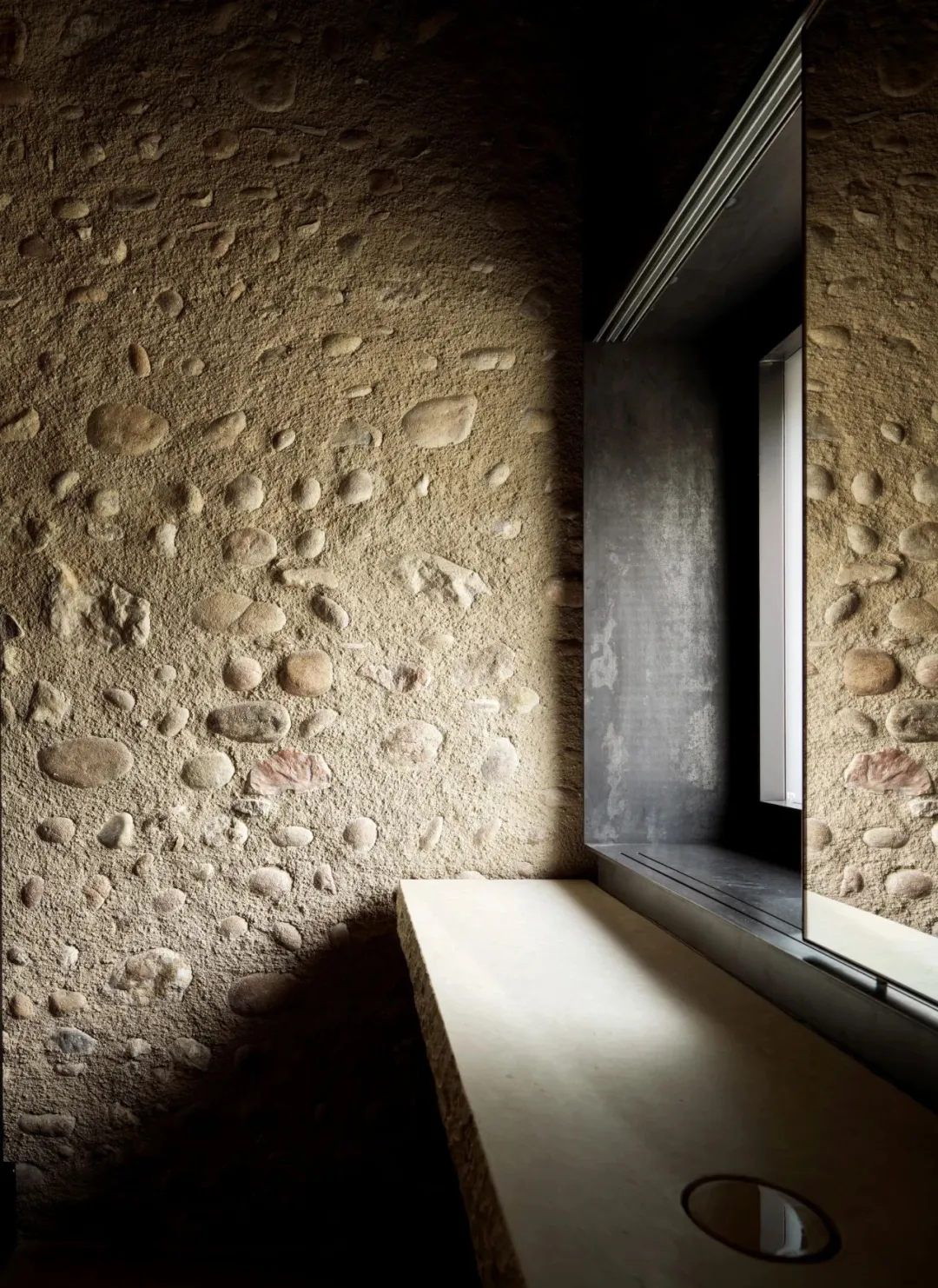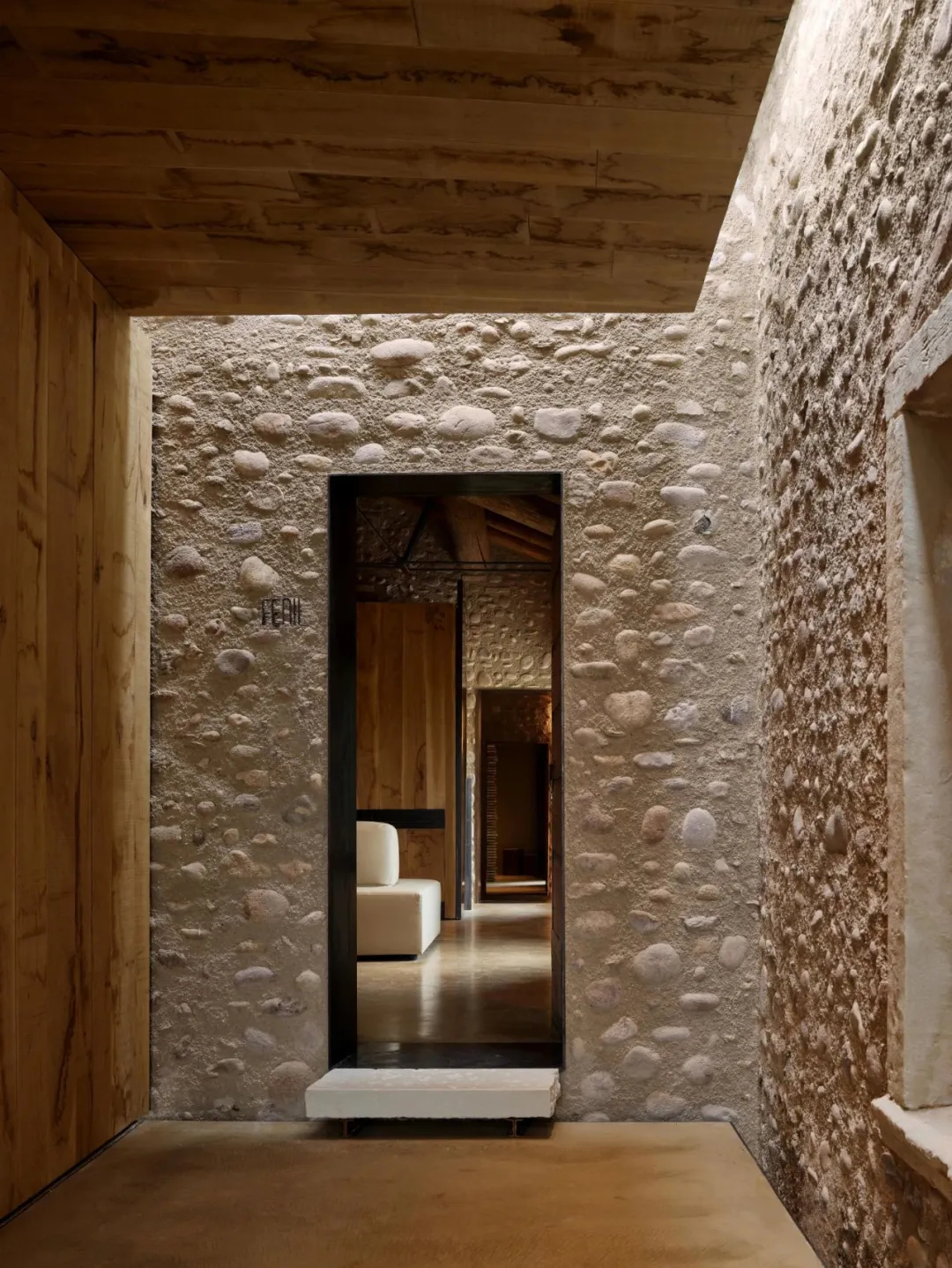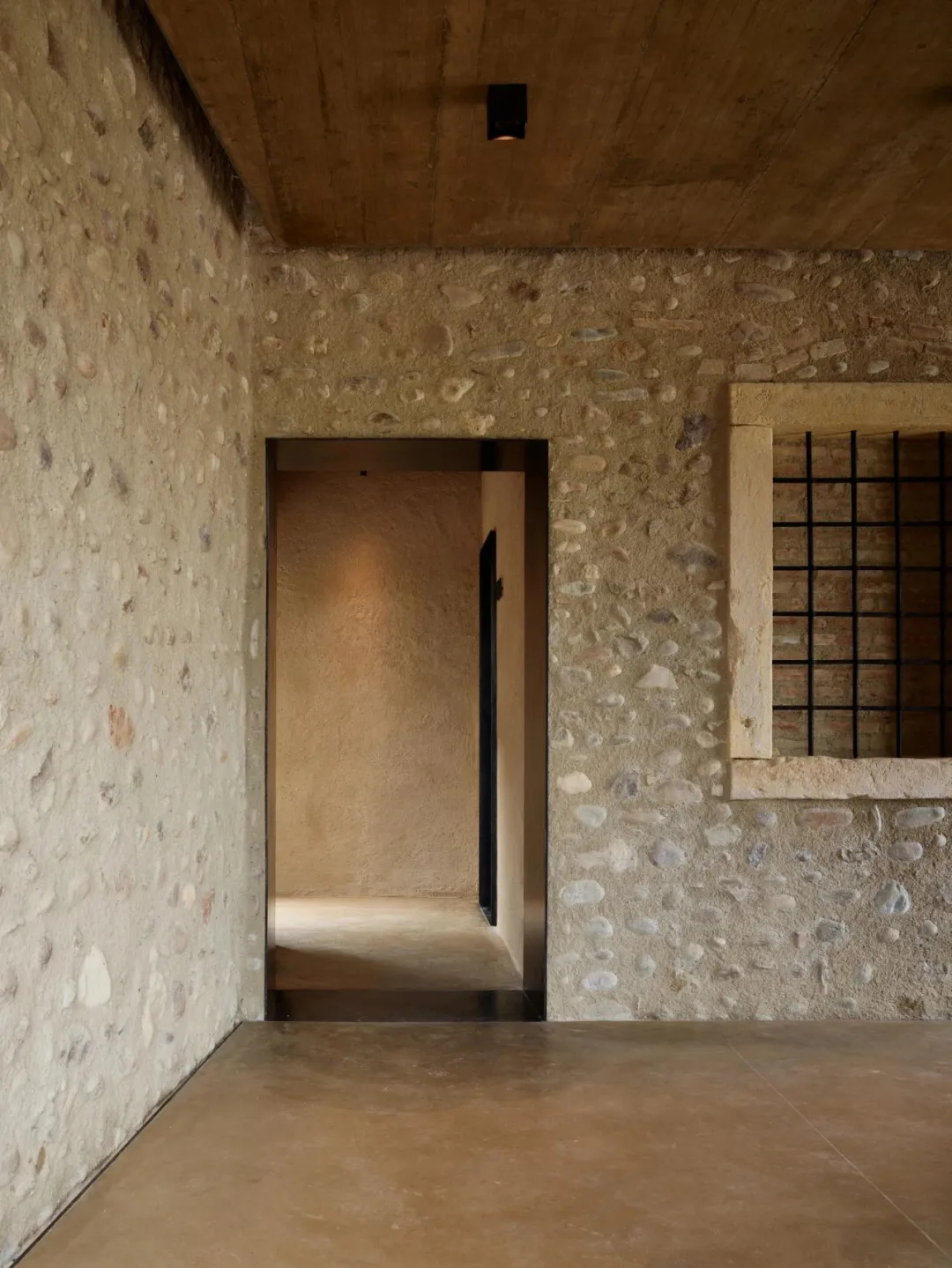 石墙、木质天花板及混凝土地面相得益彰,既保留古朴质感,又融入现代元素,营造出和谐且富有韵味的空间氛围。