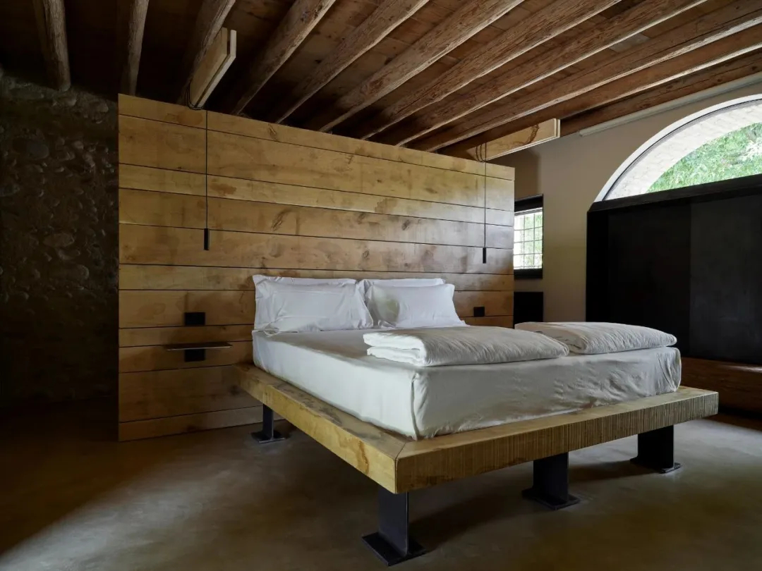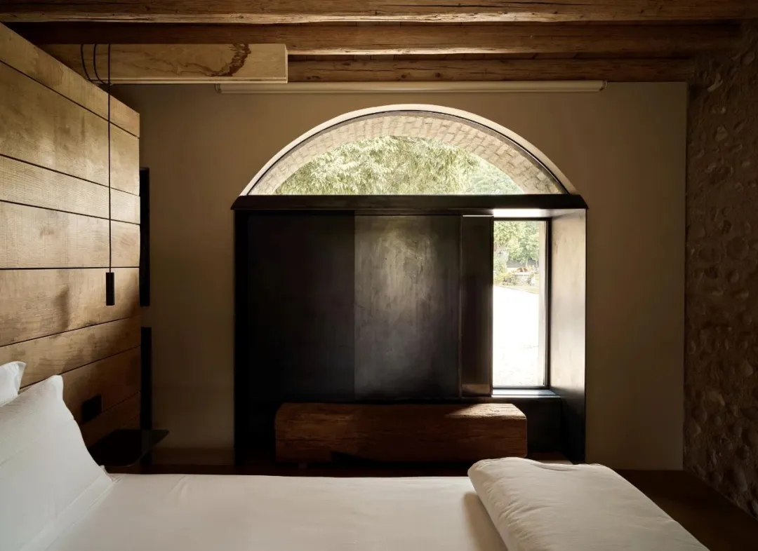 卧室质朴自然,石墙搭配木质天花板与床具,营造温馨氛围。拱形窗引入绿意,光线柔和,尽显简约舒适之美。