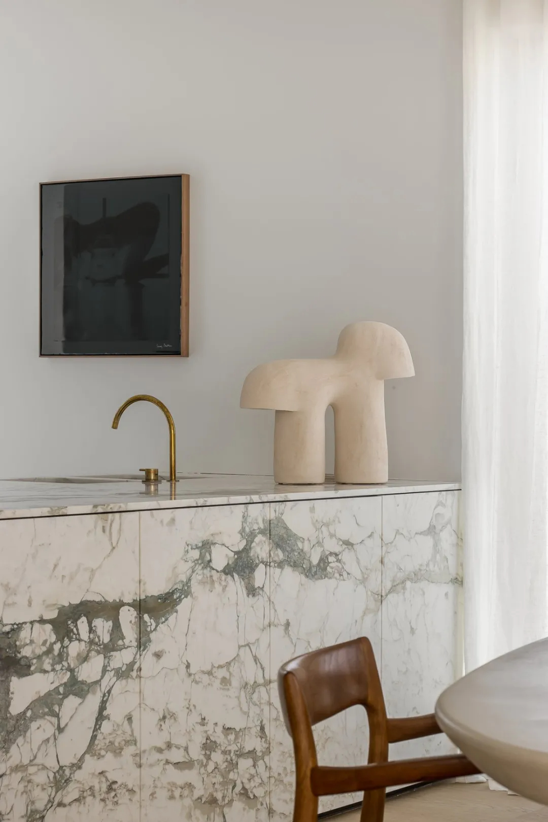 室内摩洛哥风格的Tadelakt防水石膏,在潮湿的房间和浴室中用作为瓷砖的触感替代品,在整个公寓转换过程中占据了中心位置。Tadelakt覆盖了许多表面——墙壁、地板、橱柜,甚至厨房橱柜。