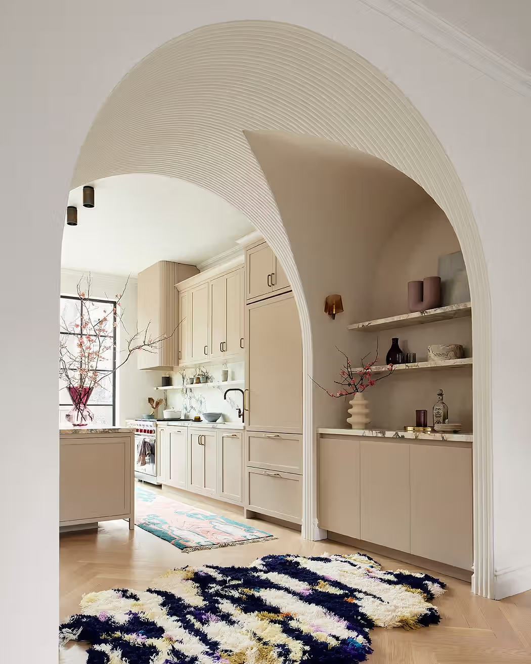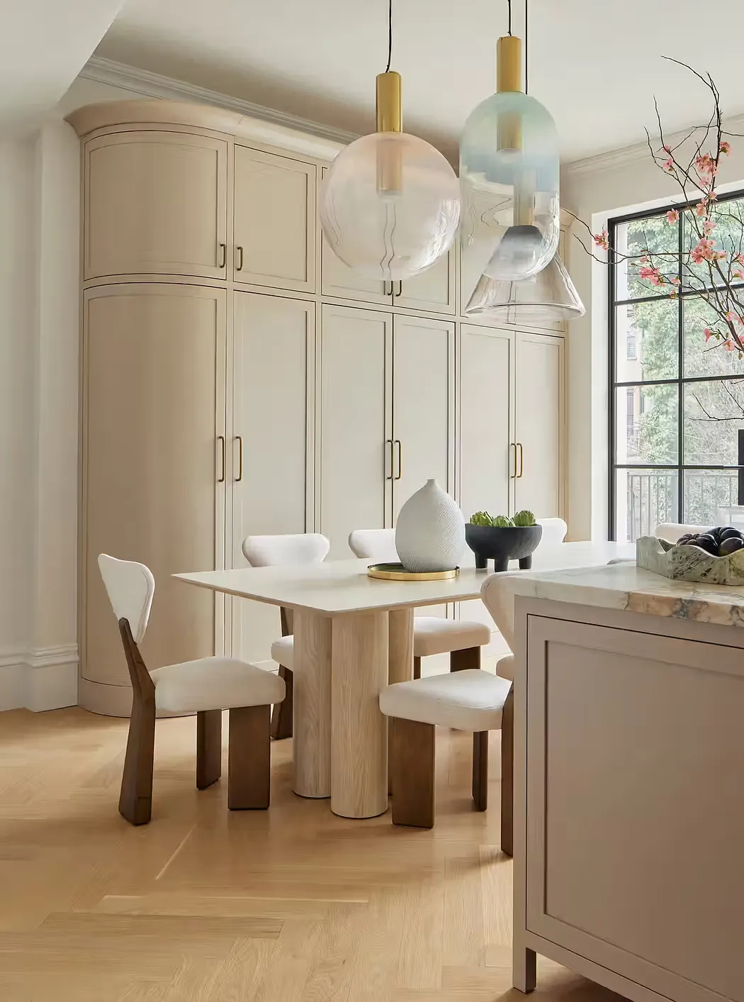厨房通过一座大理石岛台与蘑菇色调定制橱柜,将极简风格与低调奢华完美融合。弧形橱柜侧面与淡橡木餐桌、软软垫椅相辅相成,上方悬挂的手工吹制玻璃灯具,为空间注入轻盈灵动的气息。