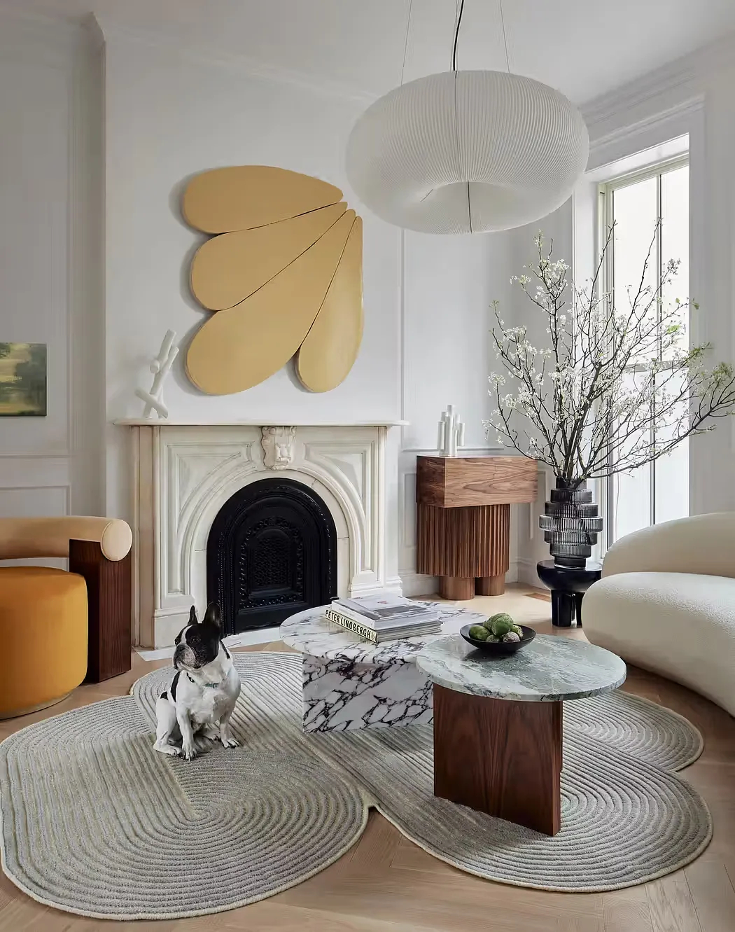 客厅内,弧形沙发与扶手椅环抱着大理石茶几,勾勒出流畅的空间动线。一侧是定制胡桃木餐边柜,墙上的金色浮雕与原始大理石壁炉彼此映衬,营造出静中有动的氛围。