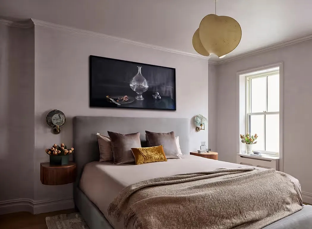 主卧室选用薰衣草灰色灰泥与染色橡木元素,亚麻壁灯与定制壁挂侧桌和谐搭配,床头墙上静谧的静物画更添优雅韵味。