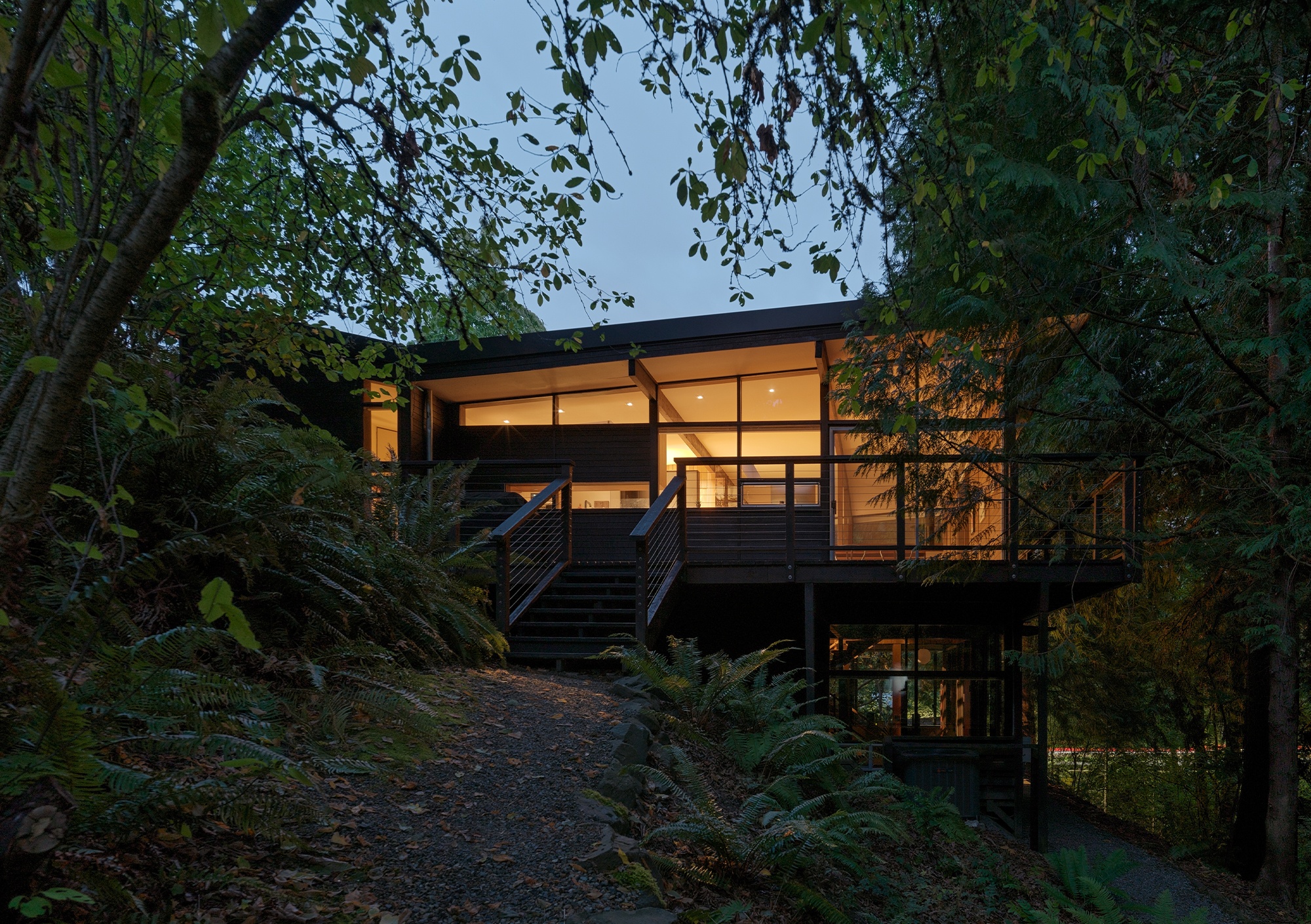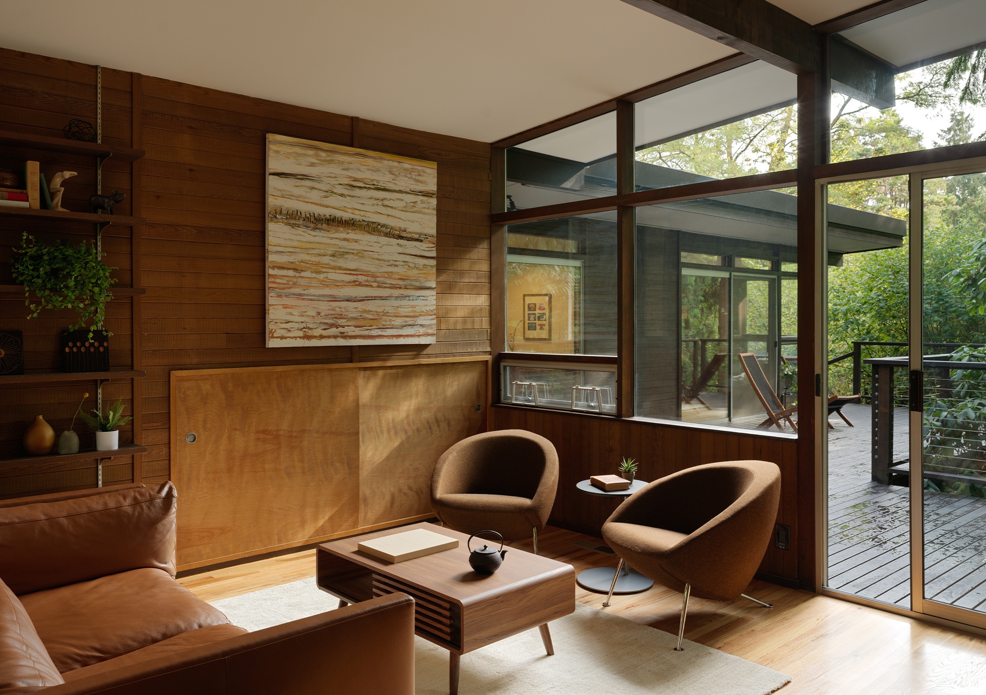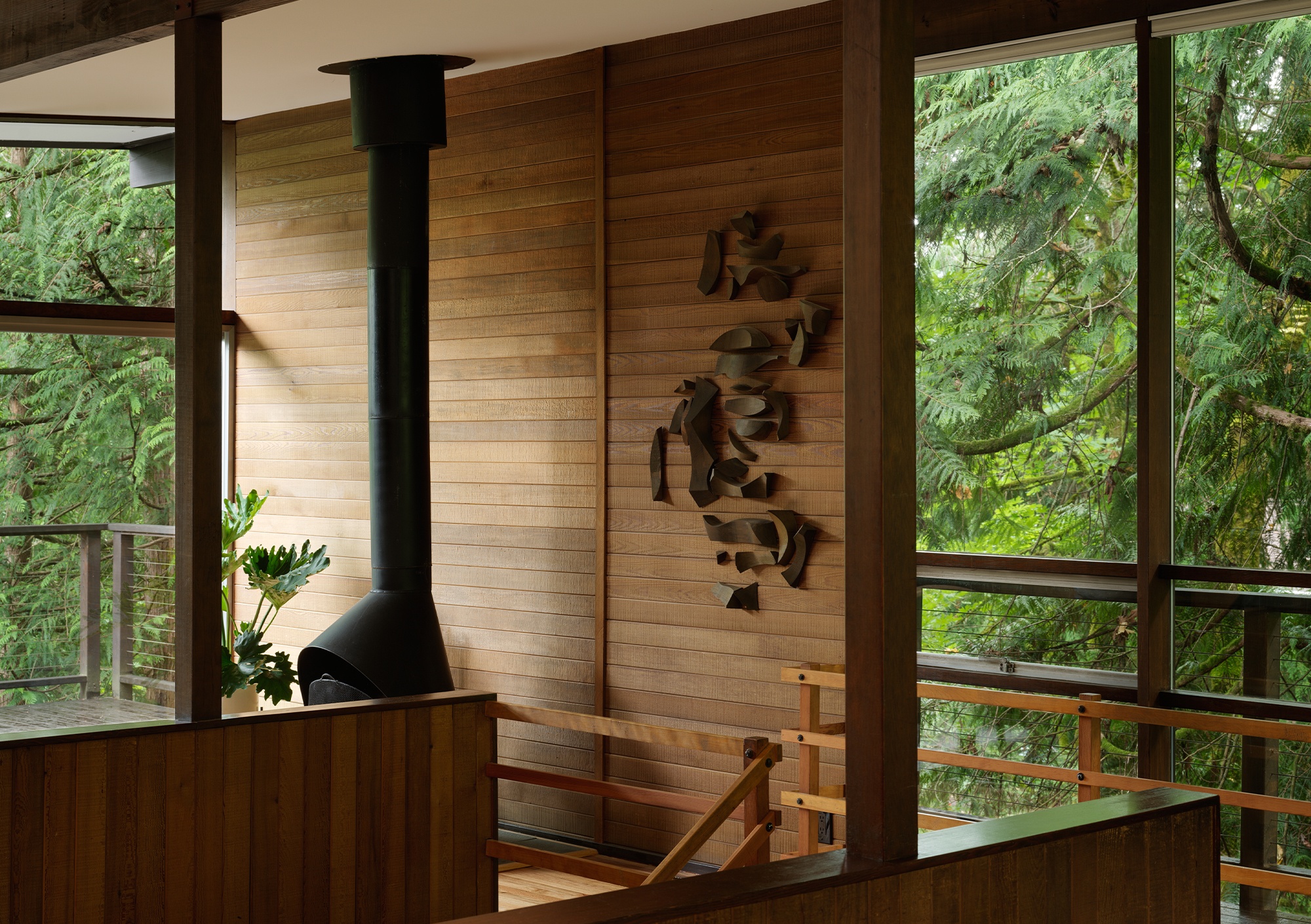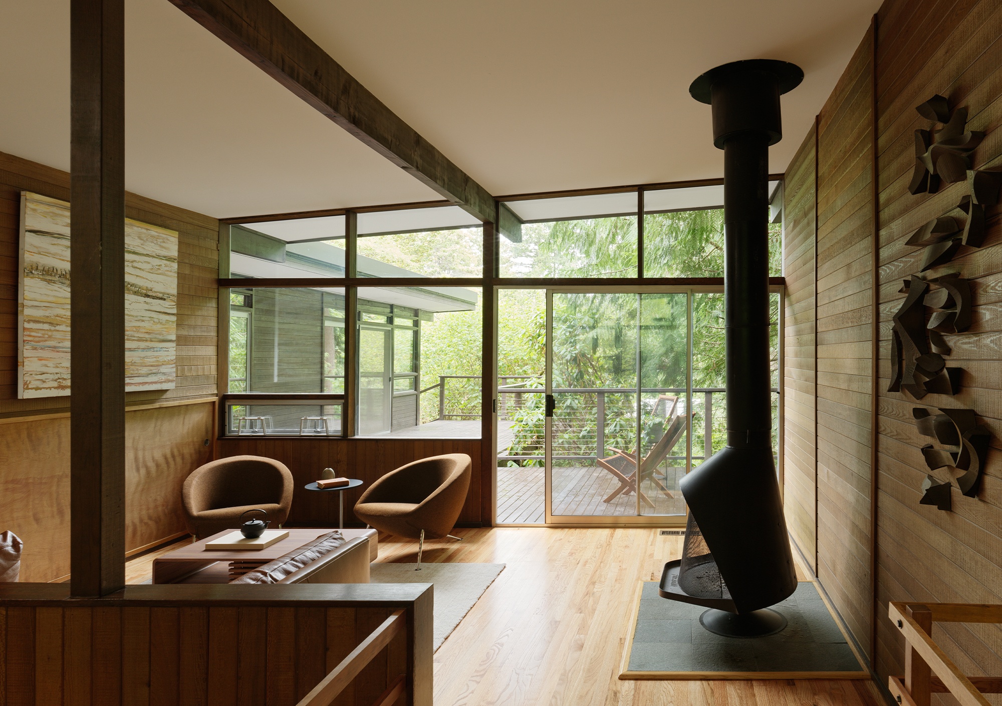 Alden Mason House,一座诞生于1958年的建筑佳作,由建筑师Charles A. Marsh Jr.与建造者Tom Paulsen共同为西雅图艺术家Alden Mason精心打造。它不仅是典型的西北地区中世纪现代风格典范,更是一座隐于都市边缘、栖于溪流与林木之间的静谧“树屋”。毗邻华盛顿湖的这片葱茏之地,将城市喧嚣温柔隔离,唯留自然私语环绕。房屋本身即是艺术家热爱自然的宣言,其灵魂与周遭的宁静永续共生。步入其中,阳光经枝叶滤成光斑,溪声低吟,风动叶响,天窗下光影翩跹——每一刻都沉浸于与自然无界的安宁体验。