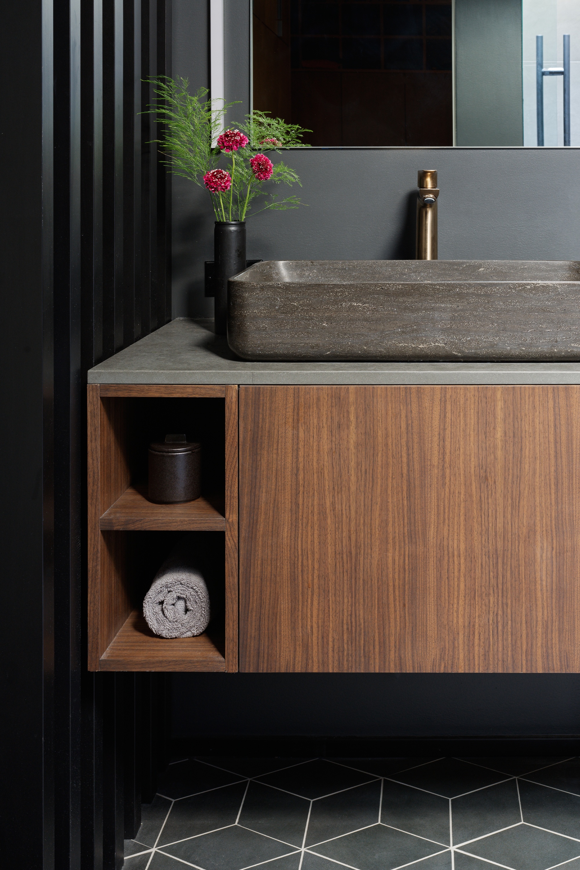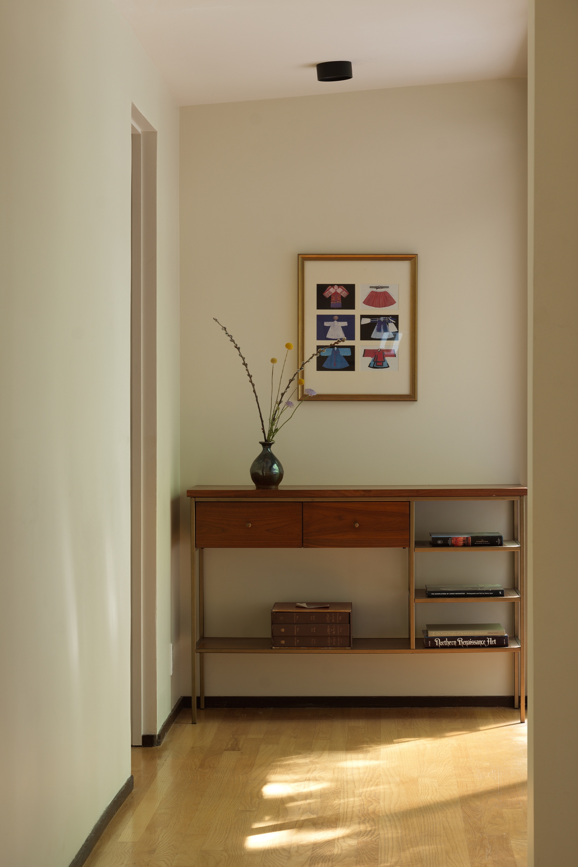 一条沿溪小径如自然序曲,将访客悄然引至家门。入口处,开放式踏步楼梯以优雅线条迎候。为化解原门厅储物之困,满足四口之家所需,设计团队巧妙将鞋柜与衣帽间嵌入原有墙体。选用贴近原质的材料,使新增功能低调融入建筑肌理,毫不突兀,反与旧有气质和谐共鸣。