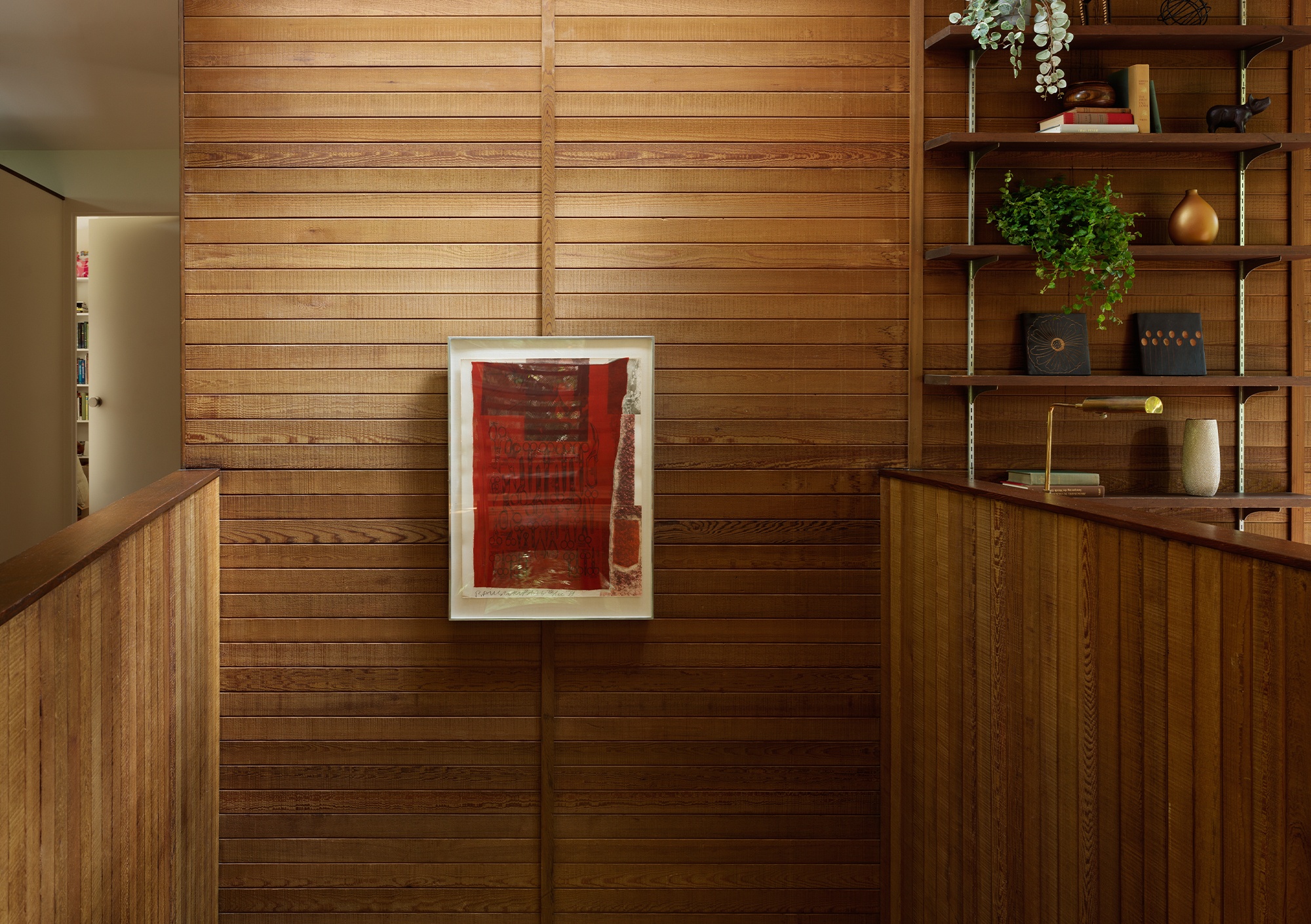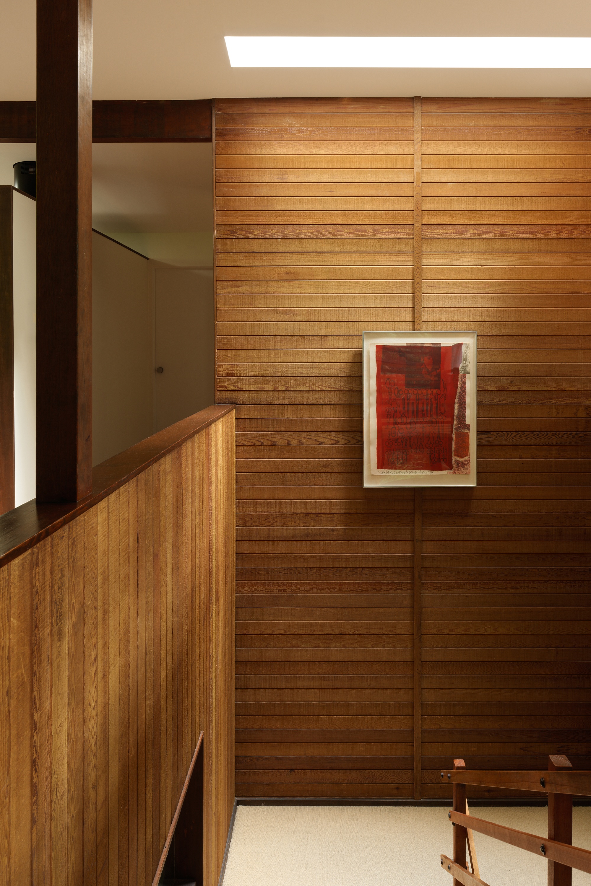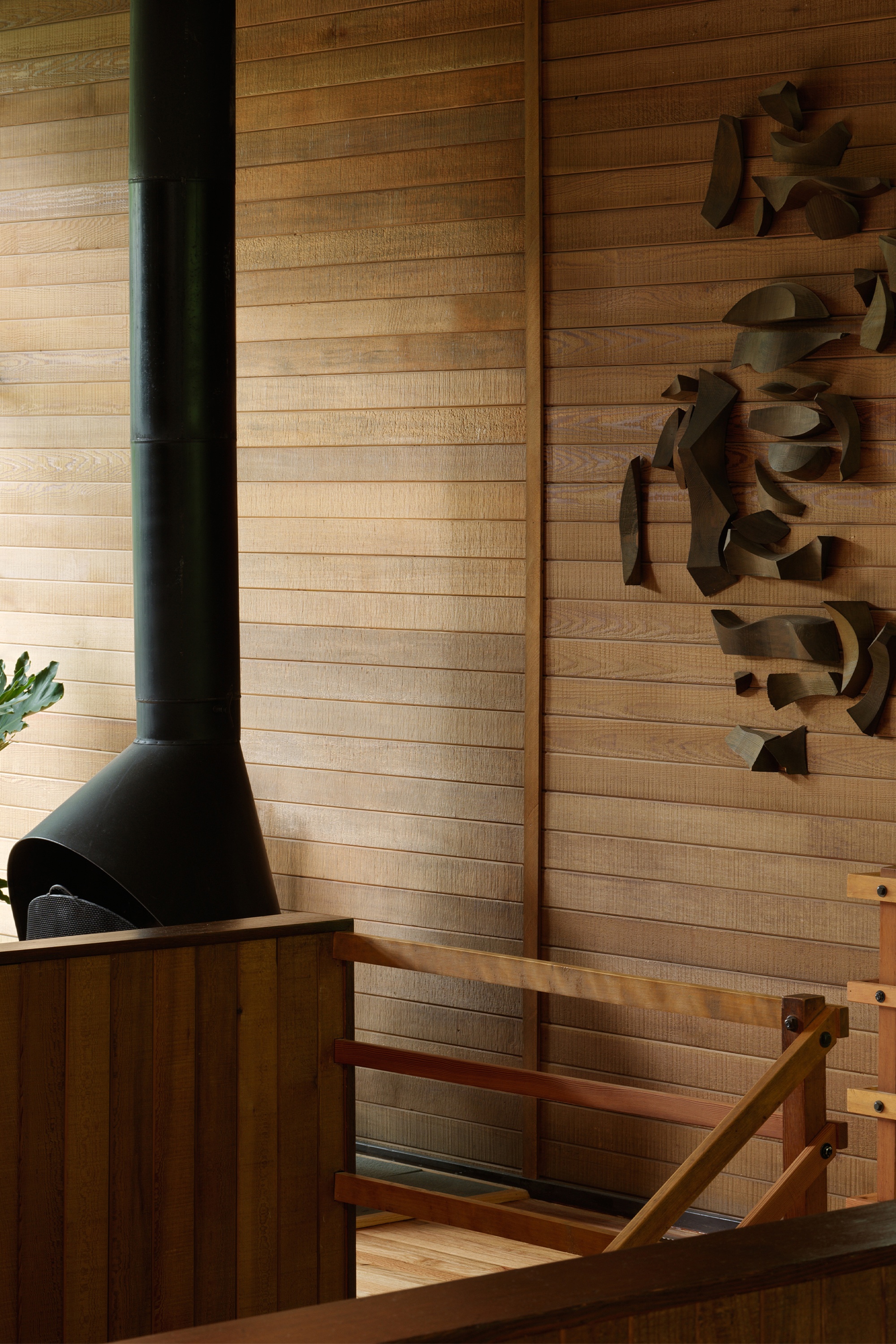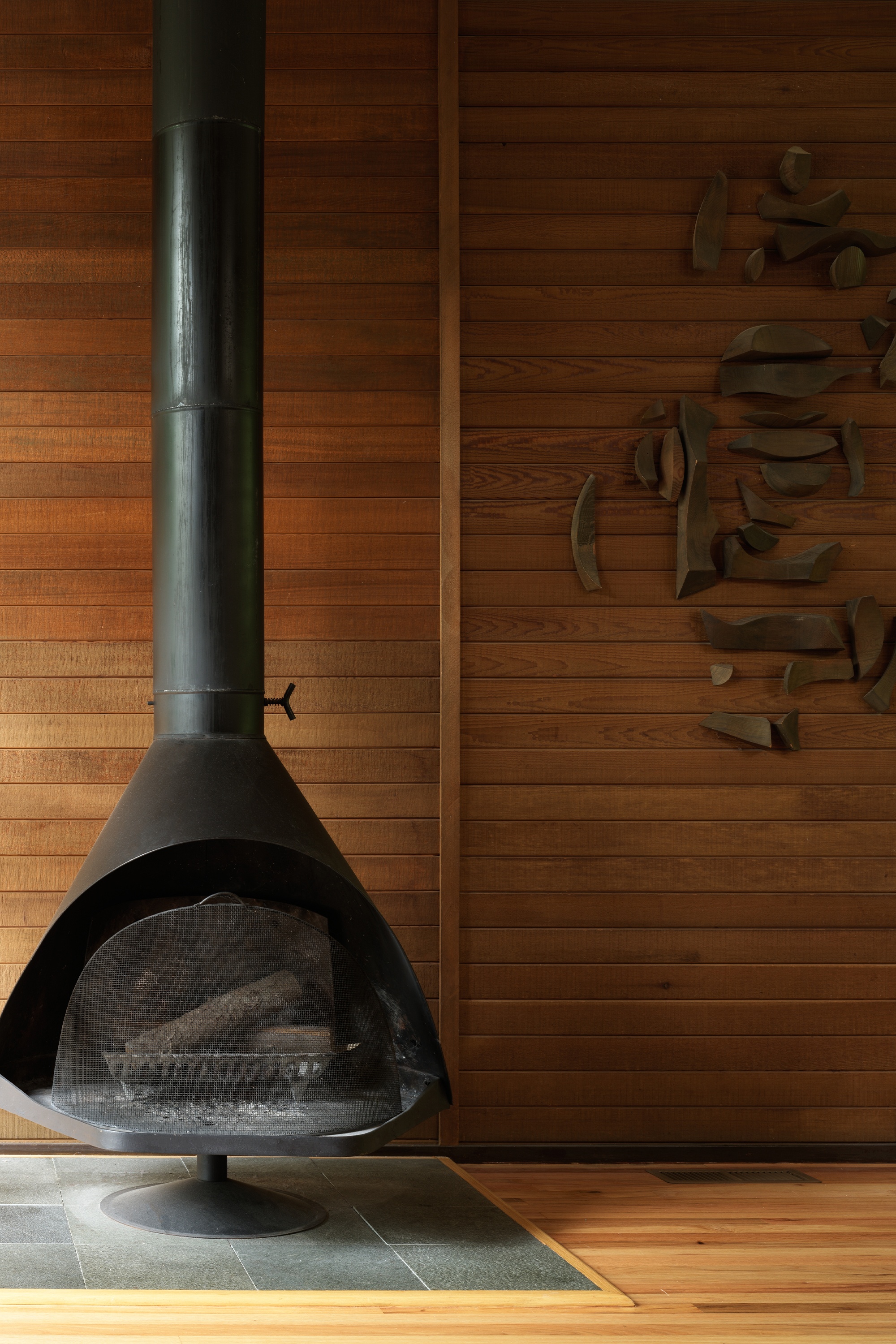 沿楼梯步入主层,天窗慷慨引入丰沛天光。首先映入眼帘的,是Alden Mason创作的墙面雕塑,它如同一句无声却有力的艺术问候。窗外,绿意翻涌,水声潺潺,为这件作品构筑了生动而永恒的自然画框。