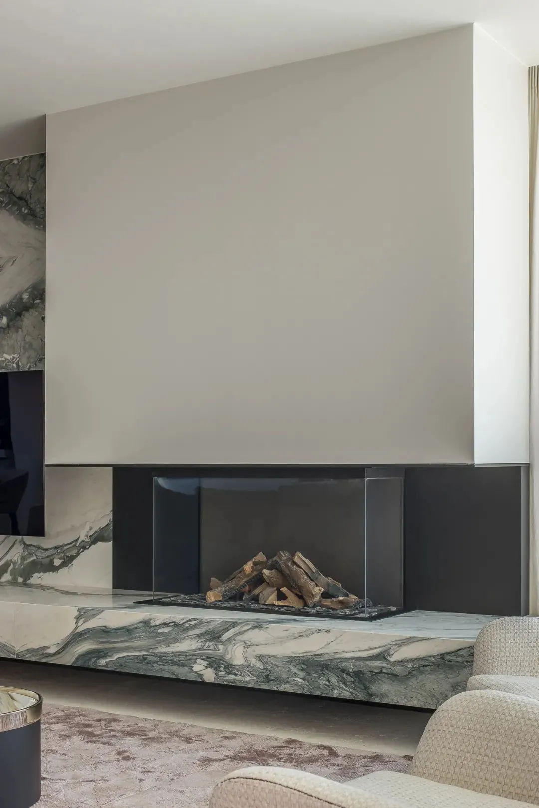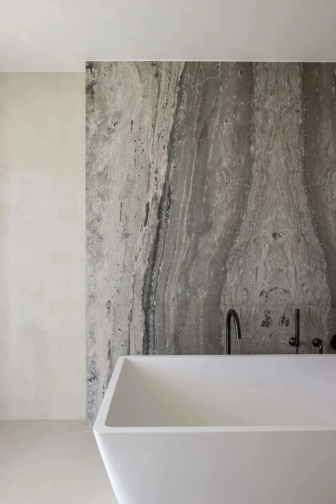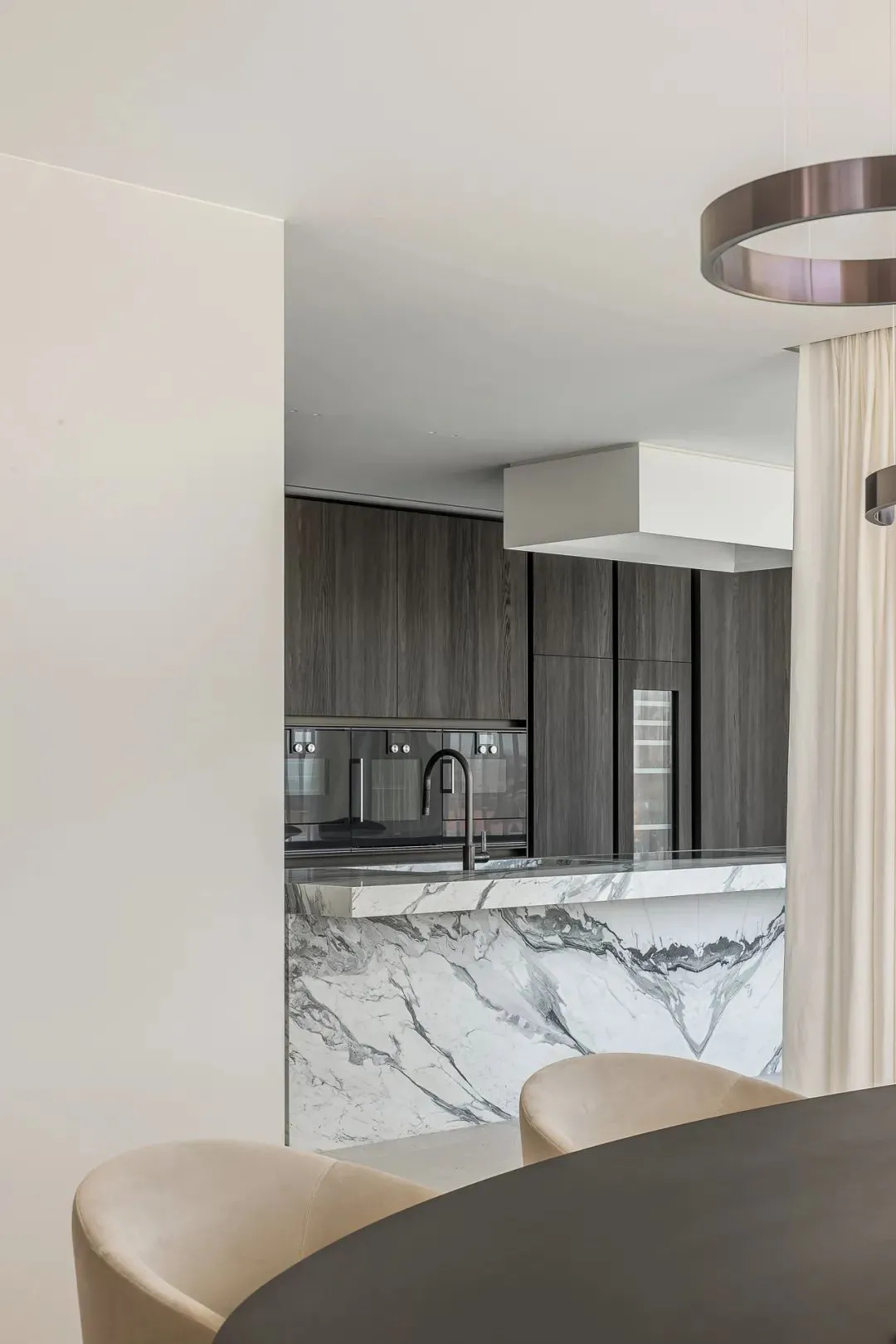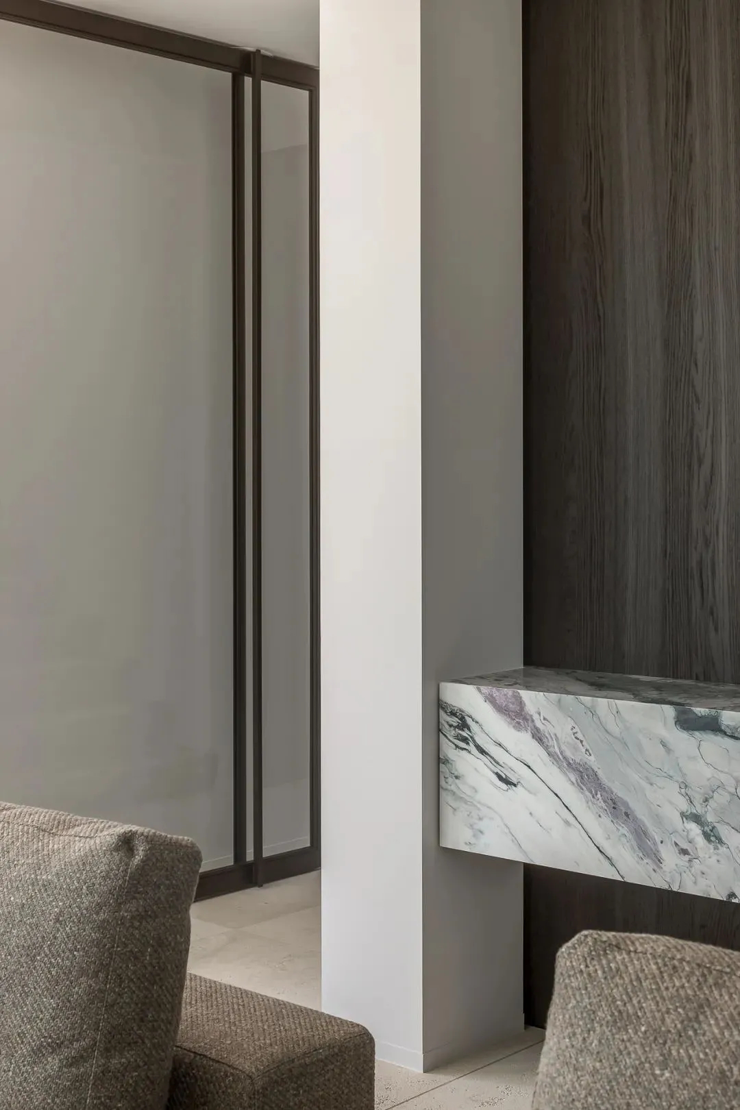 水墨色大理石的细腻纹理,将视线缓缓引向一处静谧空间。冰粉色缎面地毯铺陈脚下,为这里增添清冷而空灵的气息。