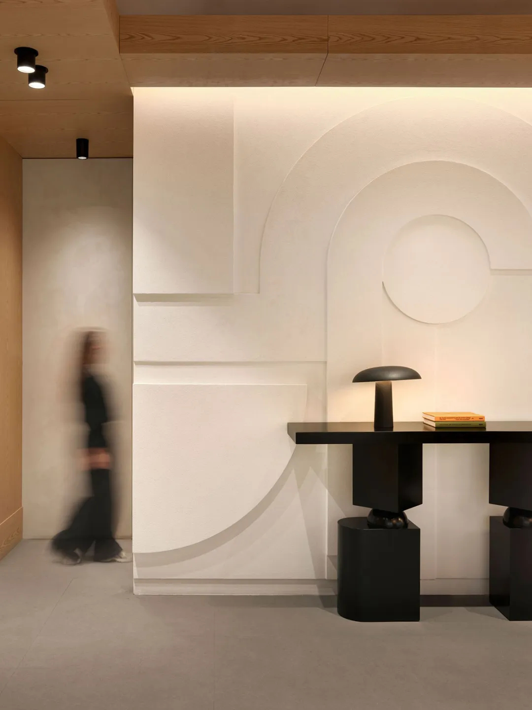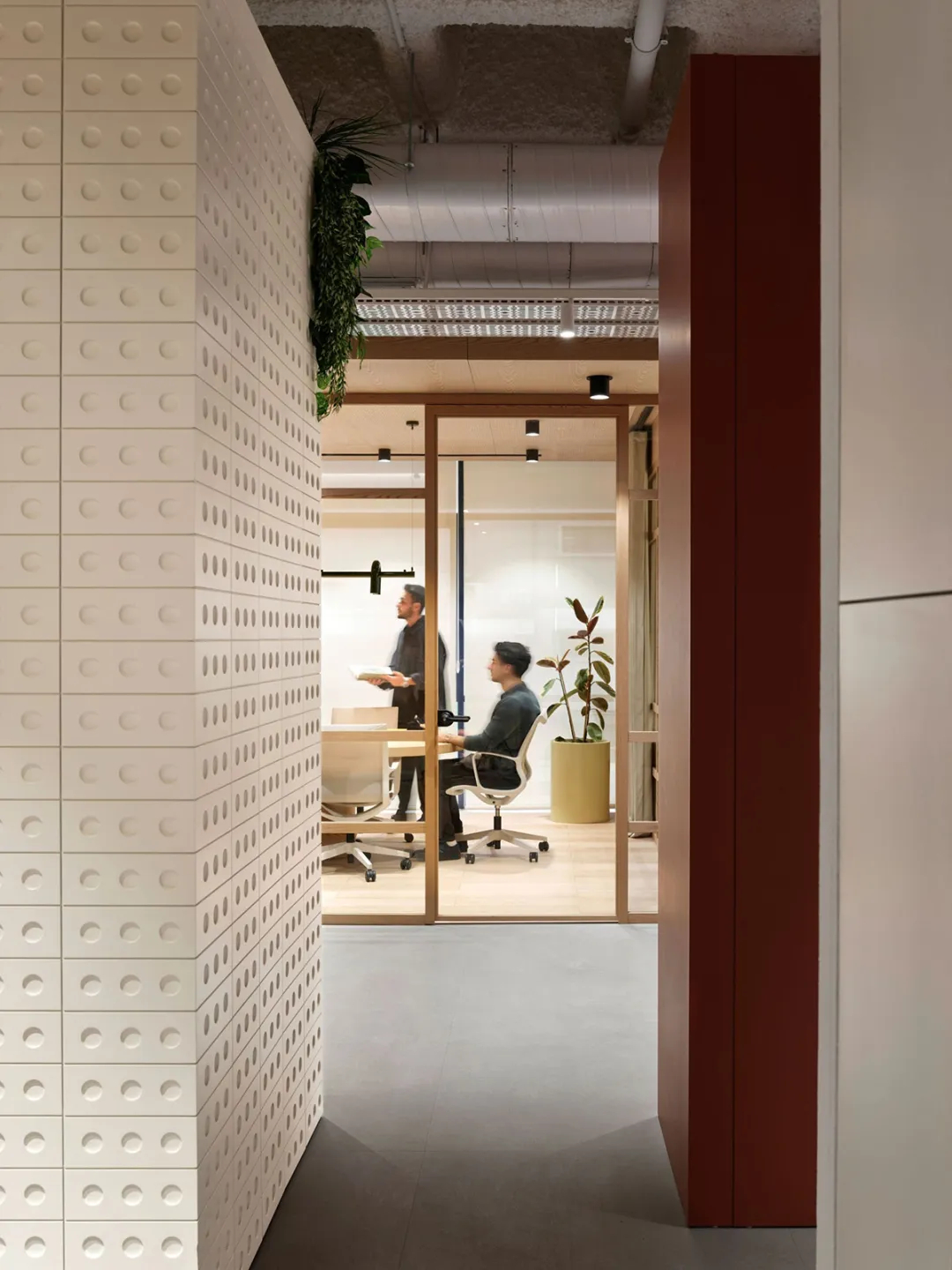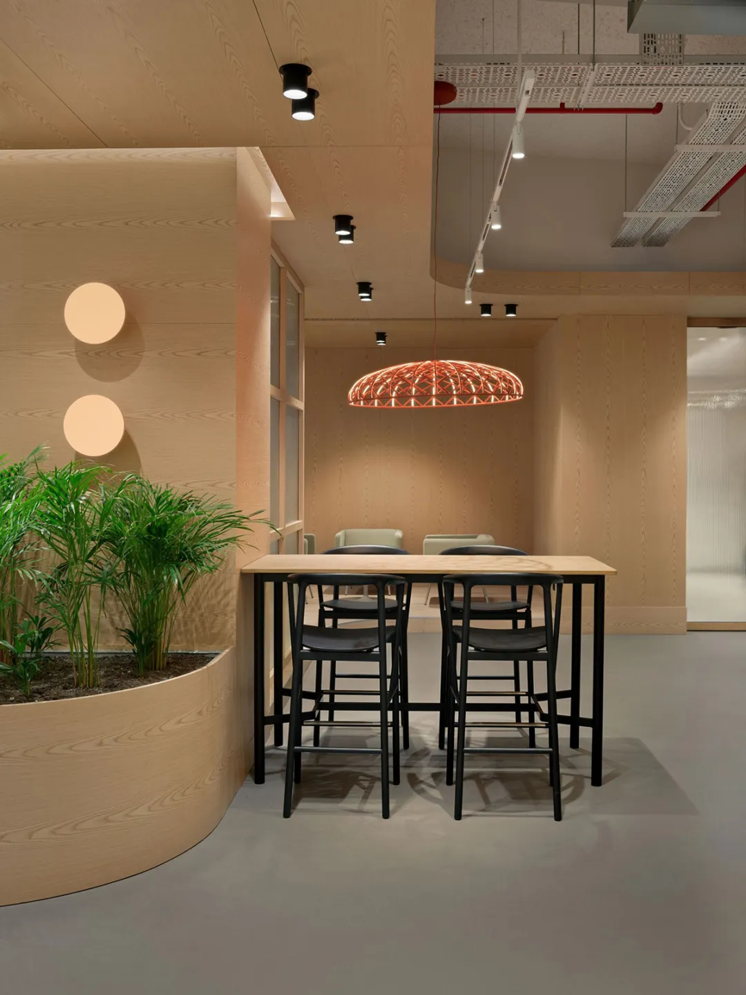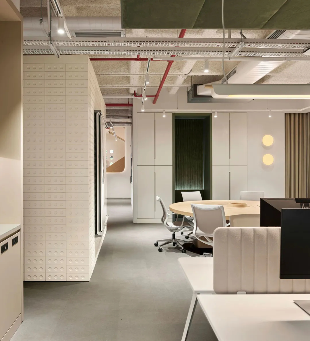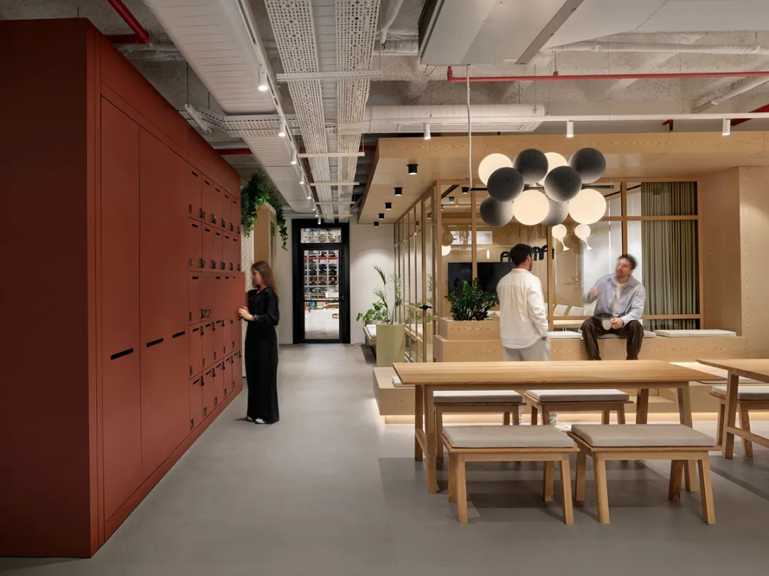 这处全新办公空间,是UCGE从一间朴素工坊起步,逐步成长为全球零售设备与仓储系统行业引领者的辉煌见证。设计并未直白复刻工业元素,而是将深厚的工业基因进行当代转译——裸露的混凝土梁柱勾勒出空间骨架,搭配温润的原木饰面与金属线条,在粗犷与细腻的材质碰撞中,完成了从传统制造到现代创新的气质过渡。作为面向未来的新一代办公场域,项目更以空间为载体重新诠释了企业“力量、信任、卓越”的核心价值观,从低碳材料的甄选到功能区域的科学布局,每一处细节都暗藏巧思。入口处的品牌展示墙以UCGE标志性的仓储系统结构为灵感,用模块化格栅构建视觉焦点,既呼应了企业主业,也让工业传承与可持续理念的共生融合一目了然。