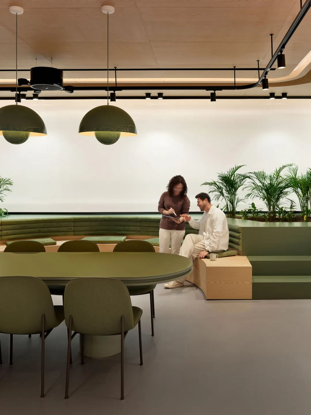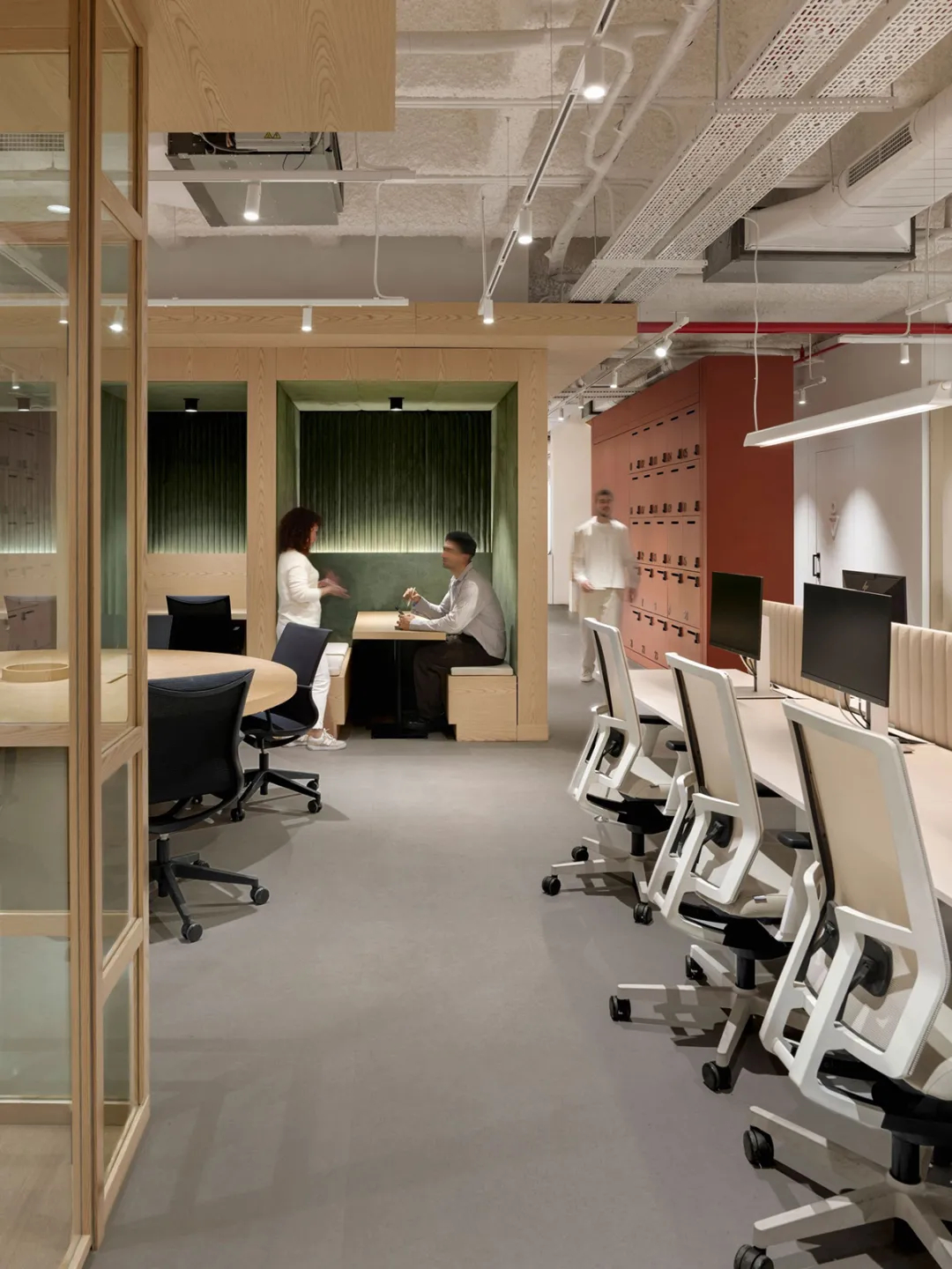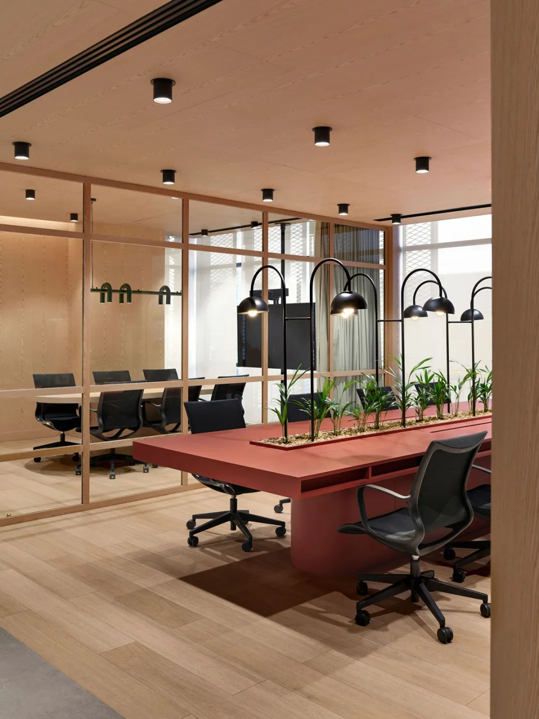 设计以可持续性、科技融合与员工福祉为三大核心要务,构建起有温度、负责任的办公空间体系。大面积的玻璃幕墙引入充沛自然采光,让阳光漫洒空间的每一个角落,搭配高效节能系统与低碳环保材料,构成了可持续设计的坚实基石。随处可见的绿植景观与亲自然元素穿插其间,不仅净化了空气,更柔化了办公空间的硬朗质感,让舒适感渗透日常工作的每一刻。为适配多元工作模式,空间更被精准划分:灵活排布的开放式工位促进团队协作,独立的弧形玻璃专注舱则为深度工作提供静谧港湾,两者在开放与私密的平衡中,实现了高效产出与个人健康的双赢。符合人体工学的升降办公桌与舒适座椅,搭配专业的声学优化设计,从生理到心理全方位保障工作舒适度与专注力;而精心打造的社交枢纽与咖啡角,以温暖的木色家具与柔和灯光营造惬意氛围,成为激发社群归属感与创意灵感的活力场域。