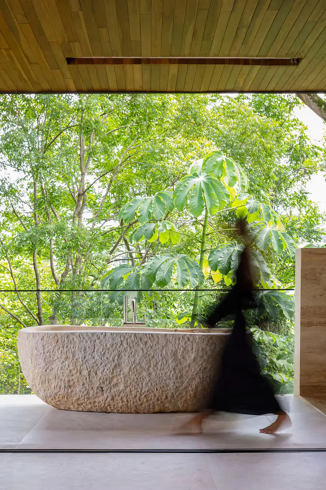 房间连通阳台,透明栏杆保障视野,屋檐下设独立石浴缸,让沐浴融入自然。窗帘、木屏风与挑檐兼顾私密与通风。