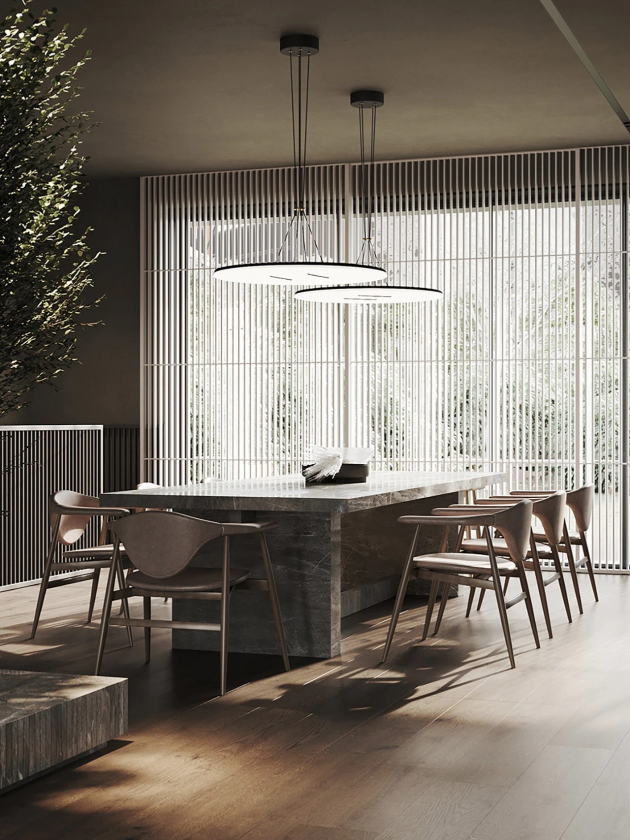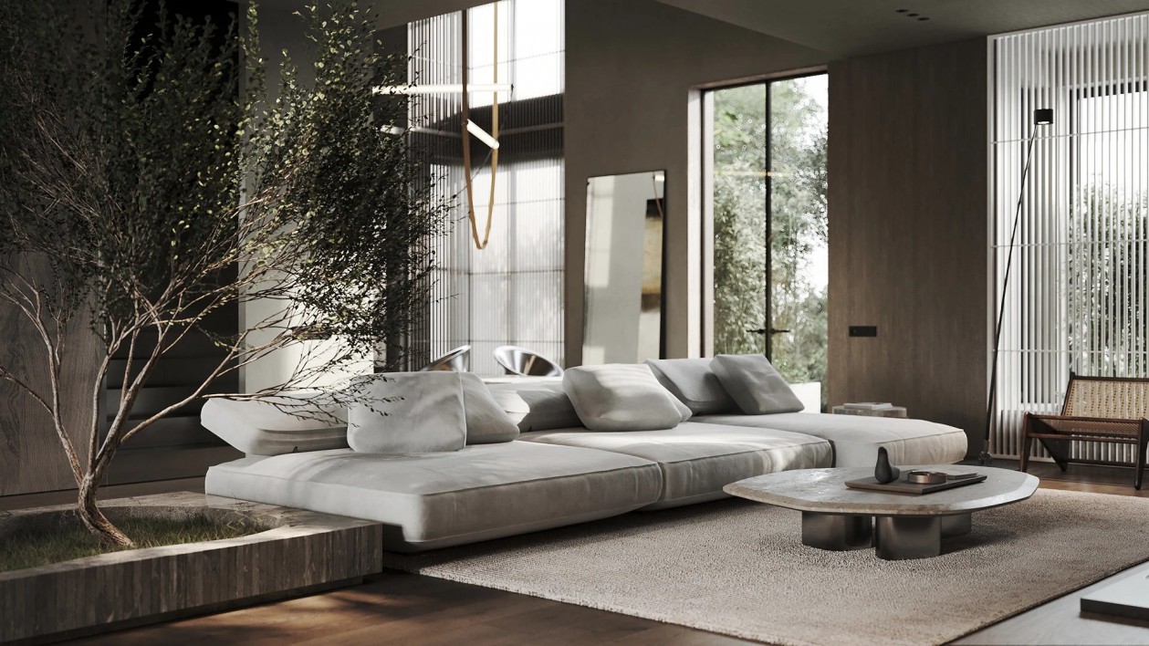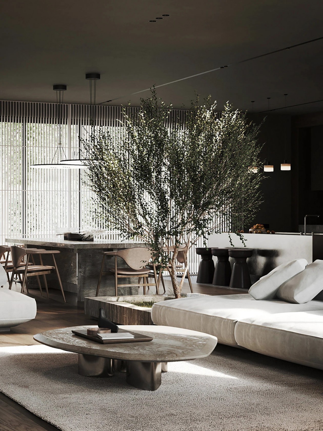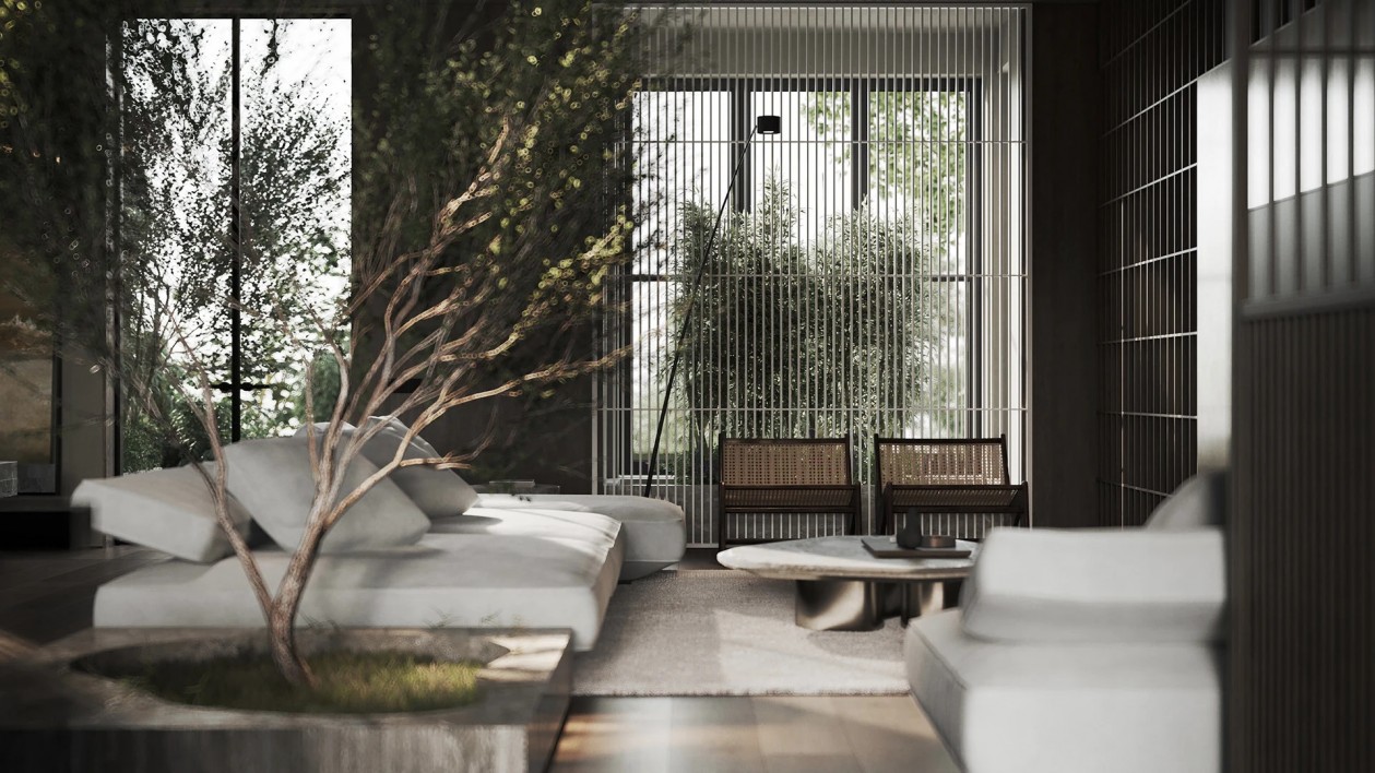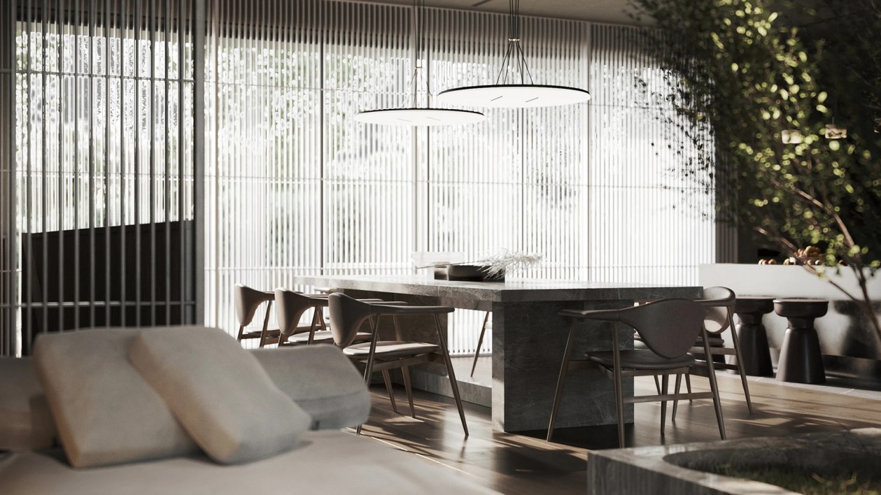 设计采用自然色调、极简家具与木质窗板,材质搭配营造丰富光影层次。