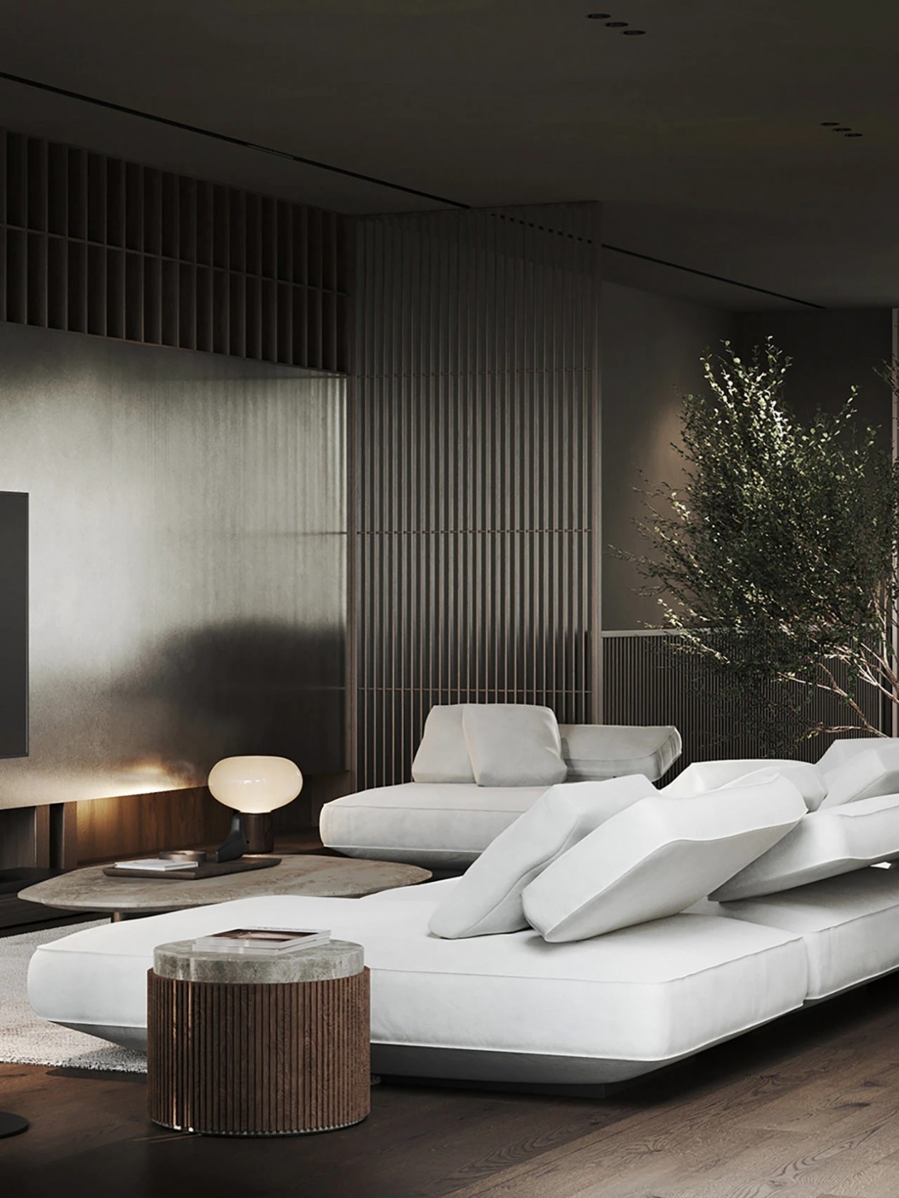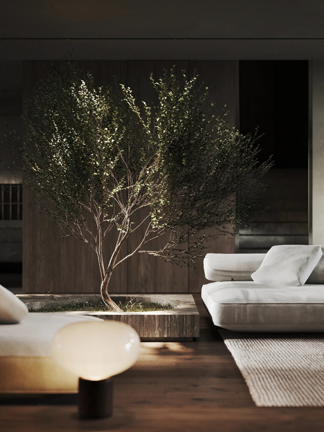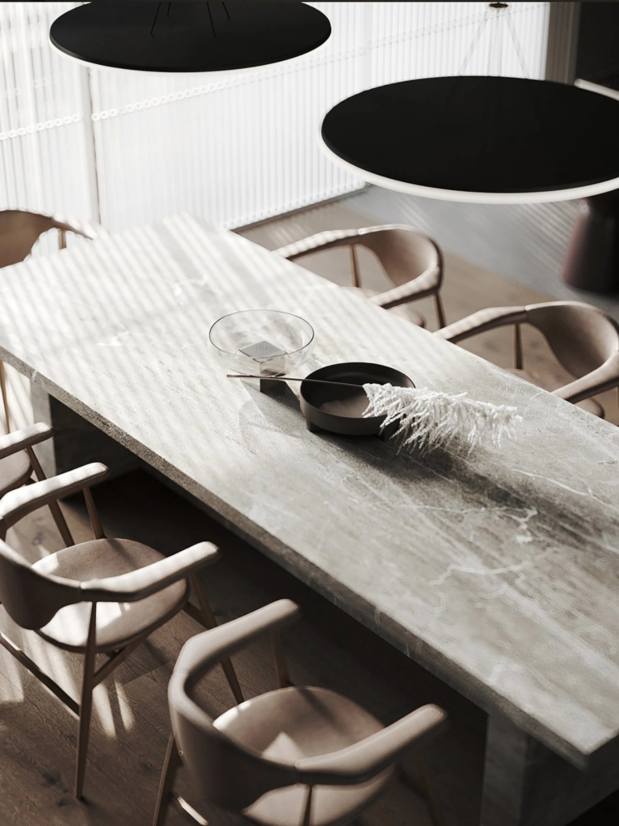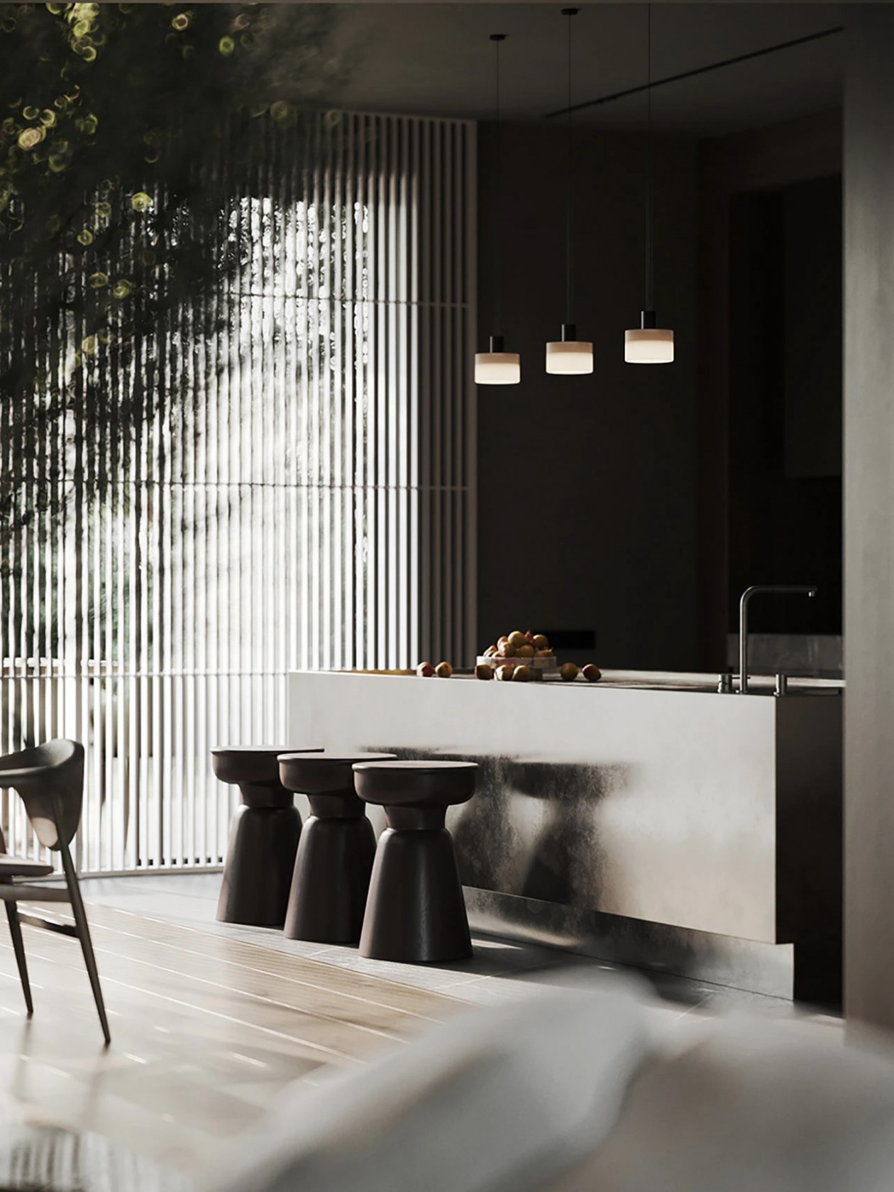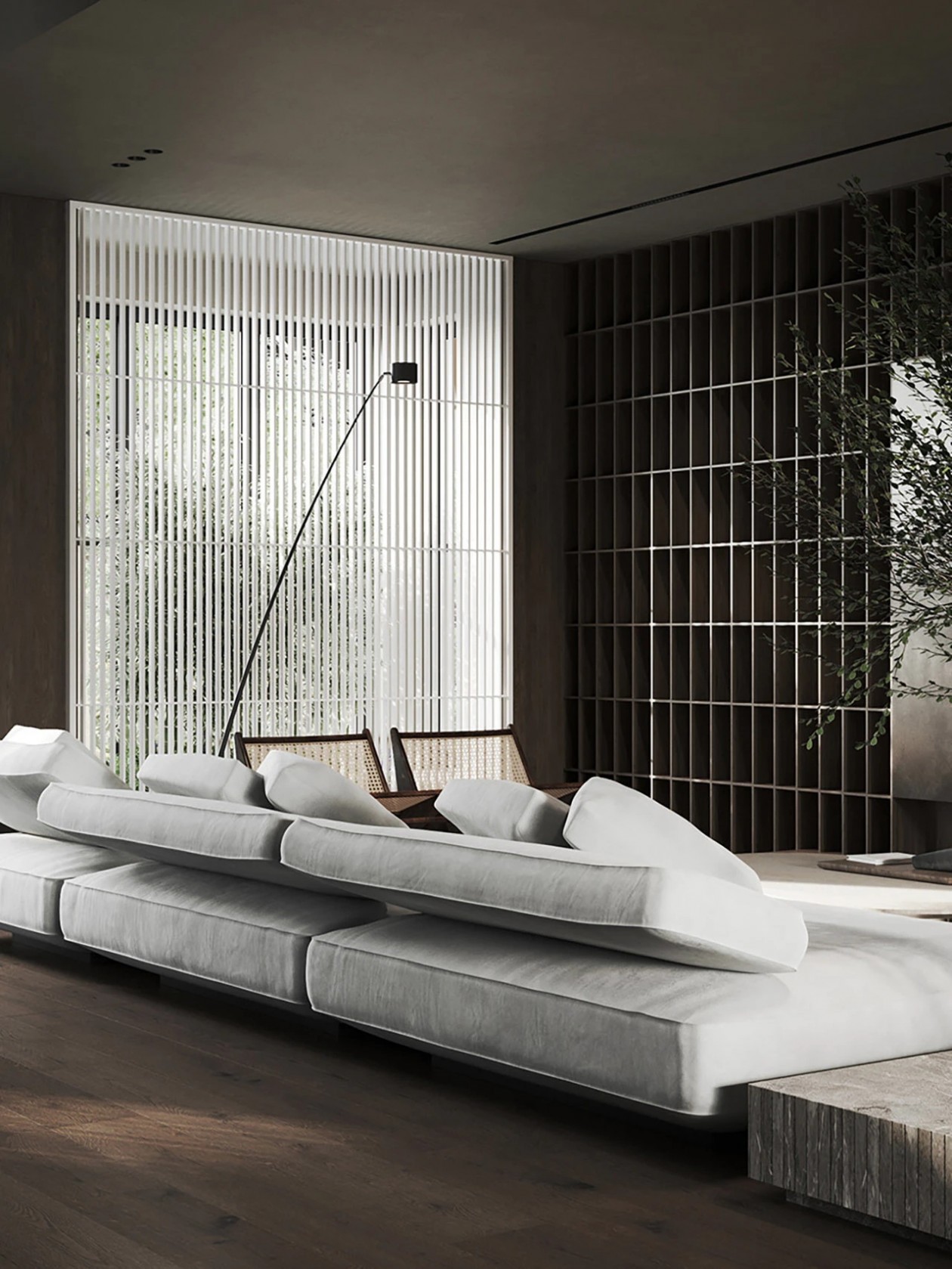设计采用自然色调、极简家具与木质窗板,材质搭配营造丰富光影层次。