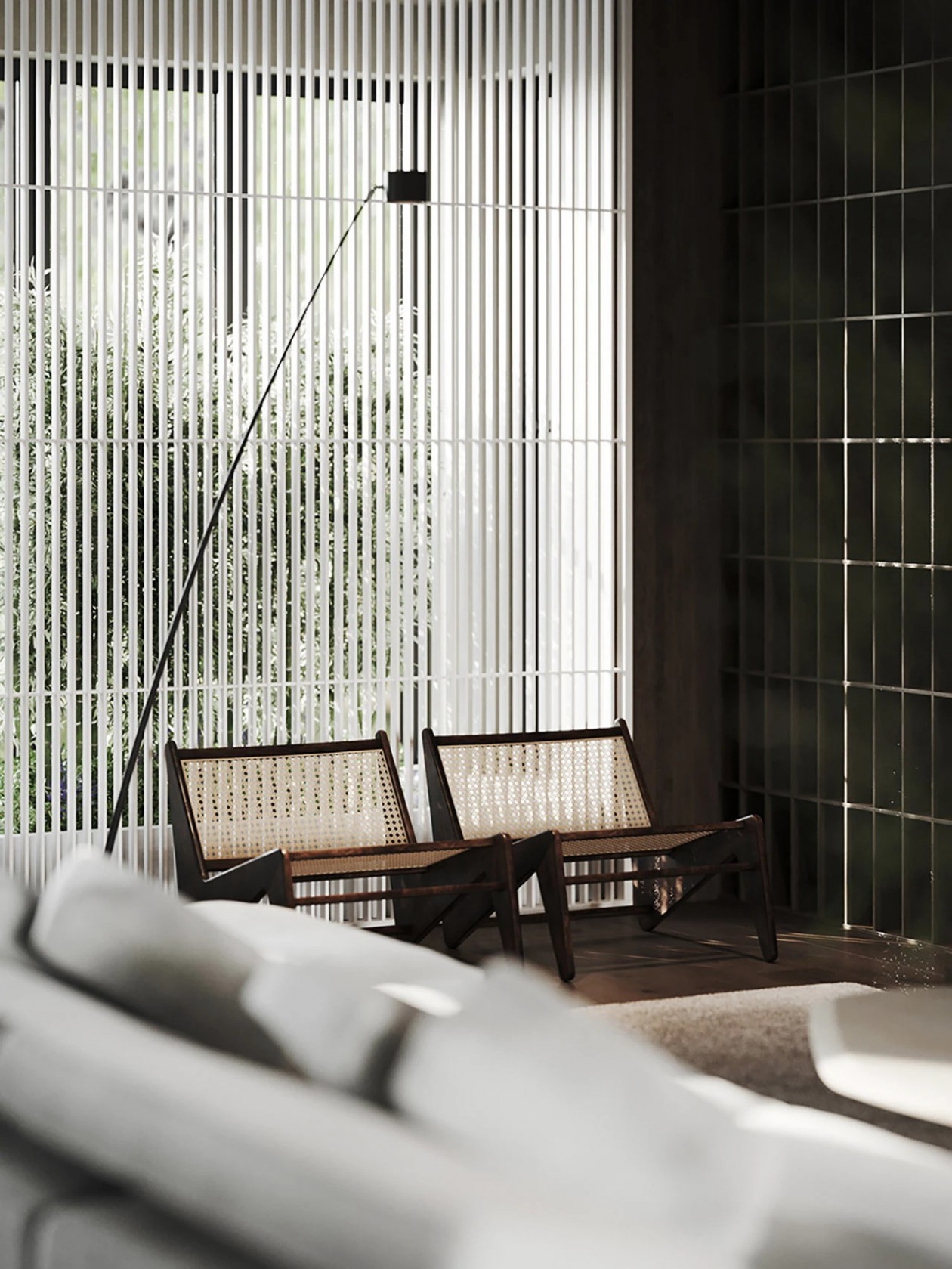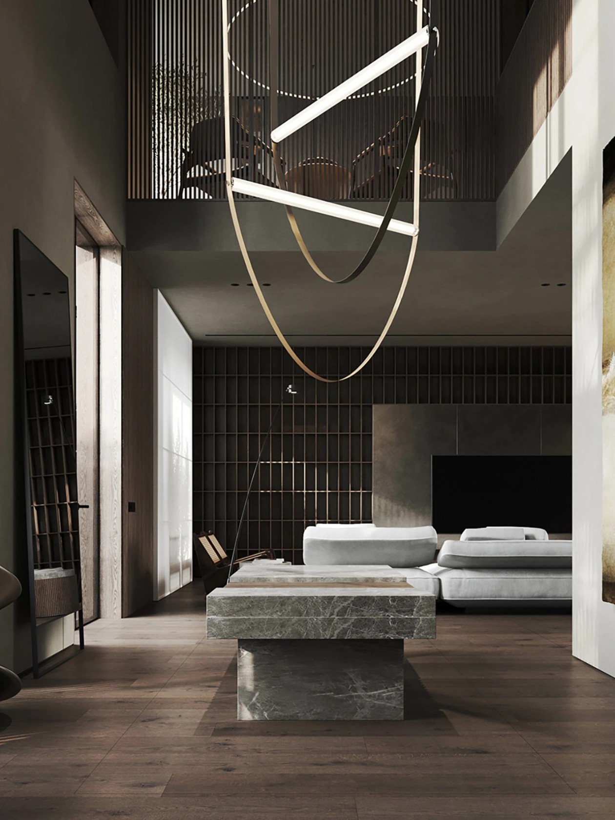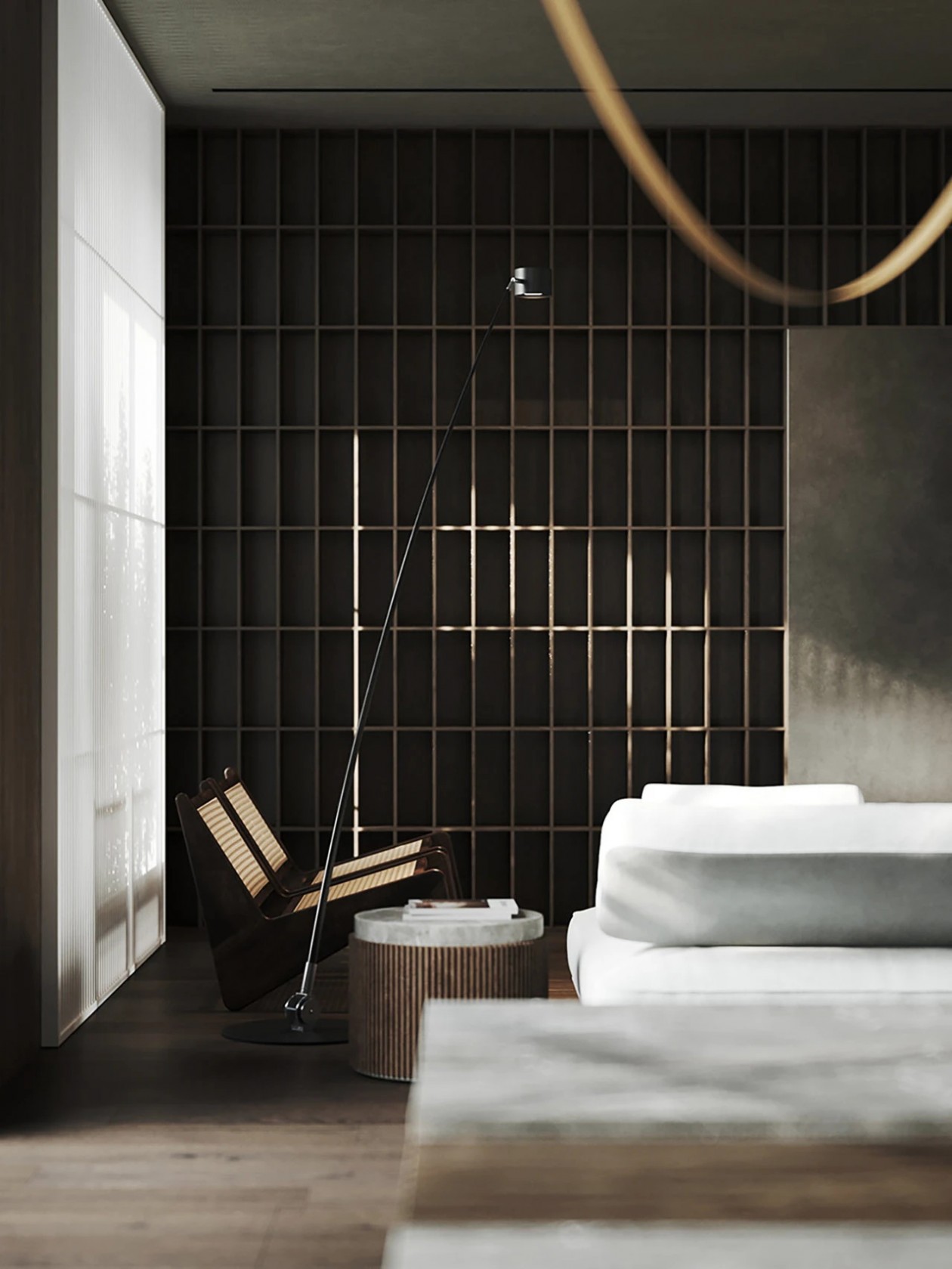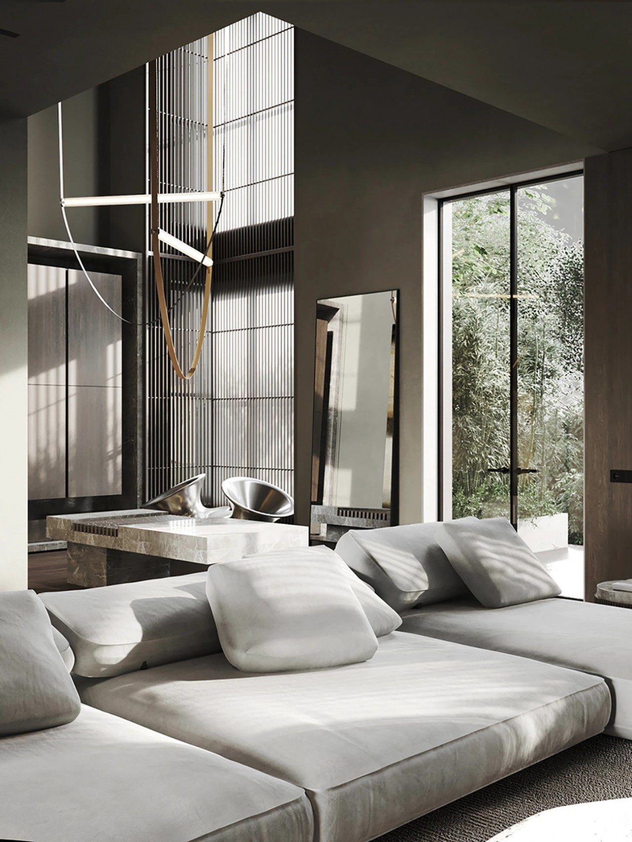 设计采用自然色调、极简家具与木质窗板,材质搭配营造丰富光影层次。