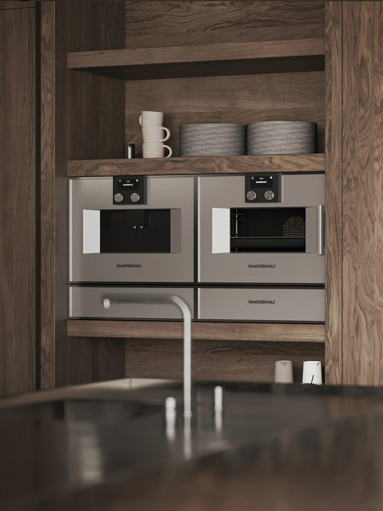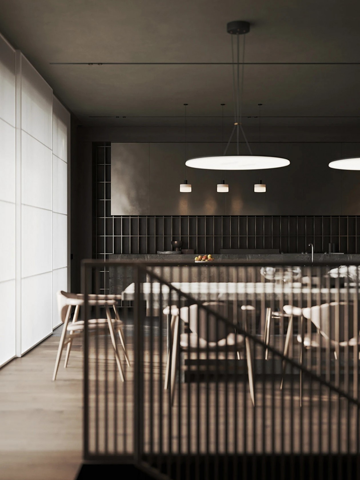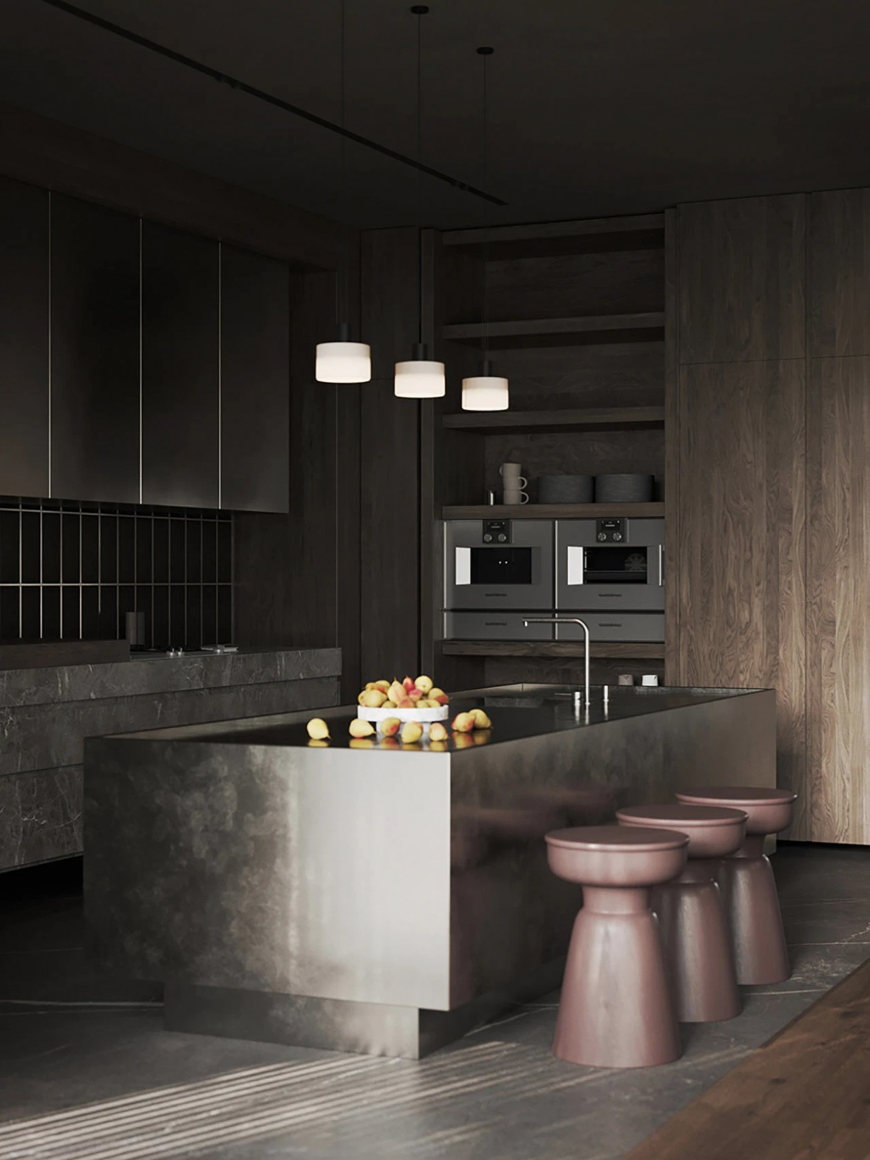 厨房橱柜采用金属包覆,形成微妙视觉对比并增添设计深度;厨房直通露台、泳池及篝火区。
