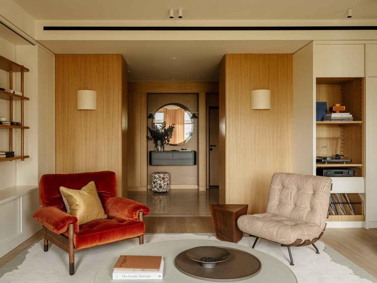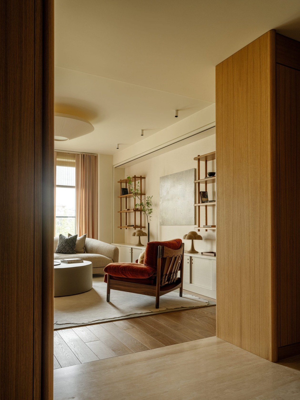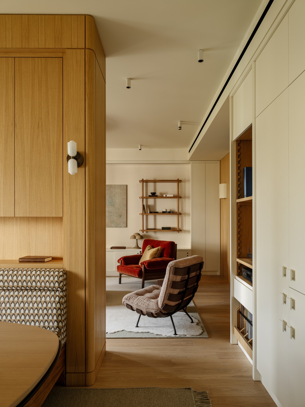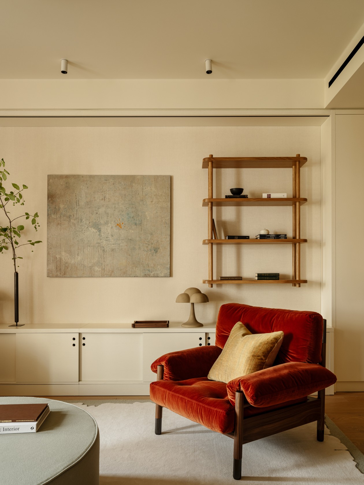 布局沿轴线展开:木饰面玄关如沉静方匣,其后是开阔的客厅。一把色调鲜明的扶手椅成为视觉焦点,其色彩在米褐基调中犹如一片枫红,搭配零星碧绿,形成温和的对比。