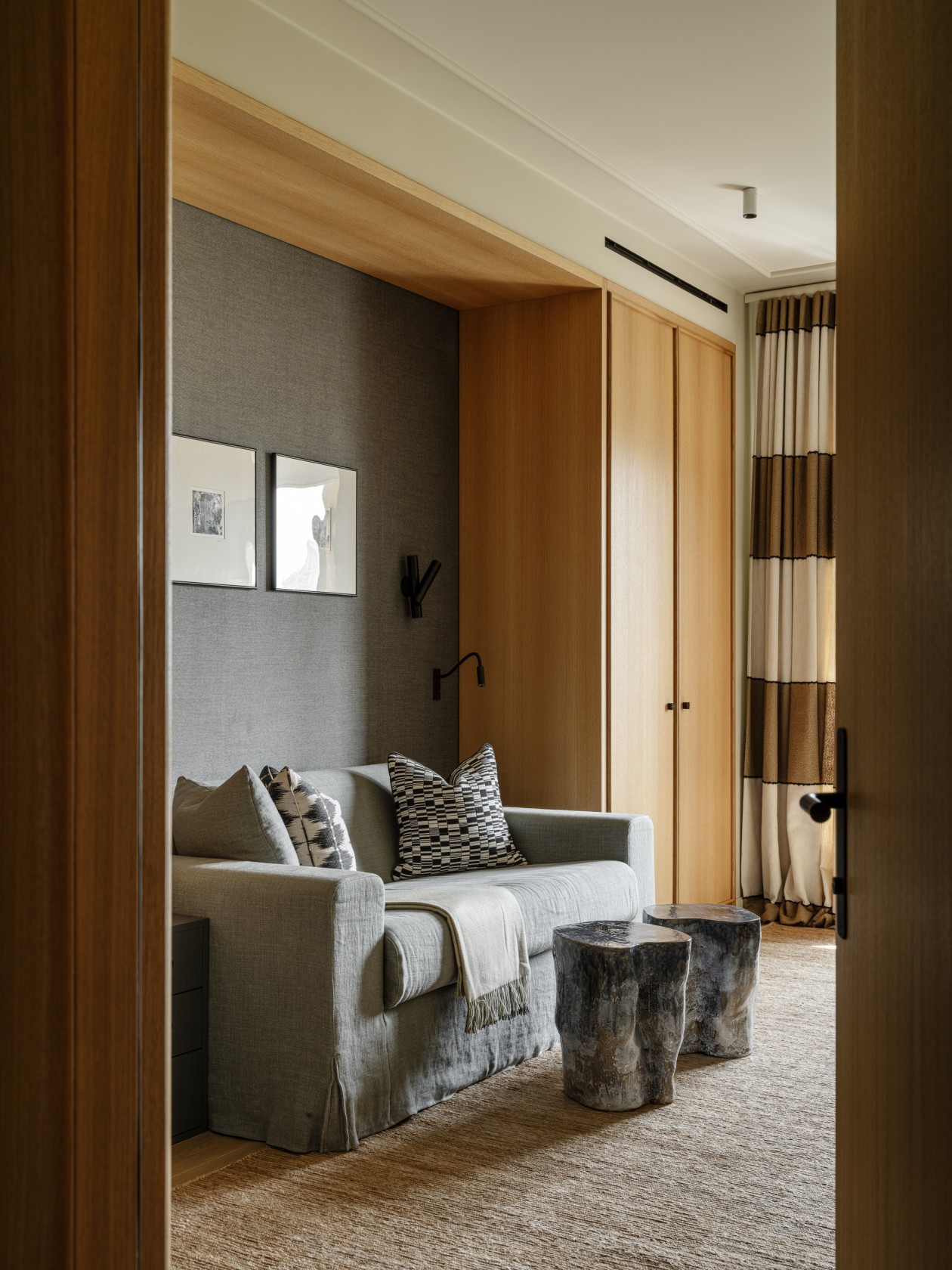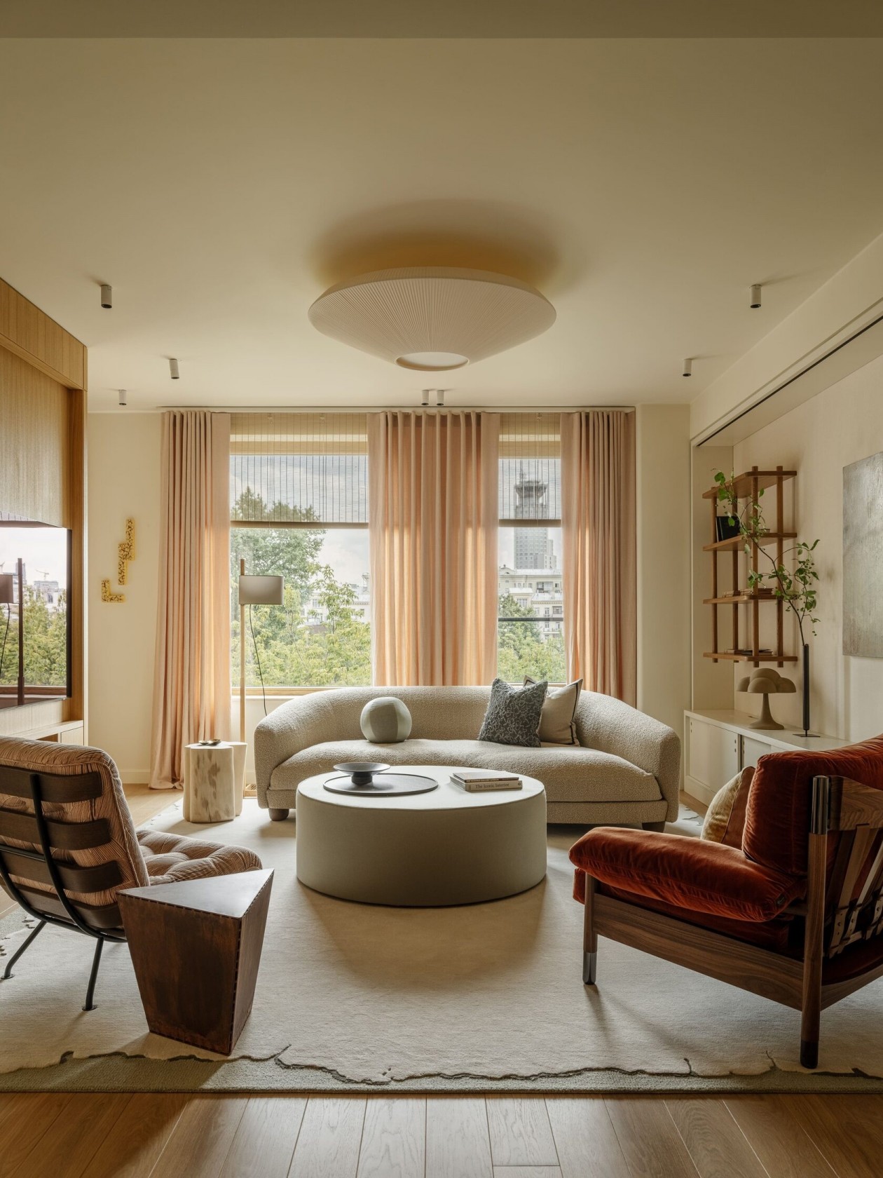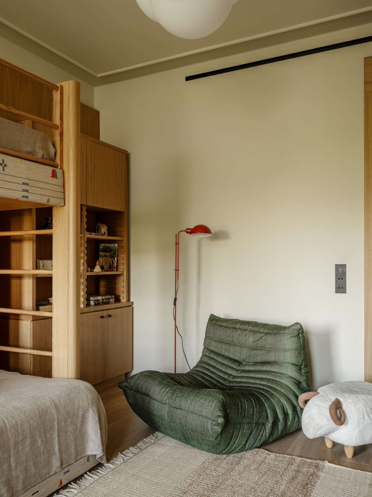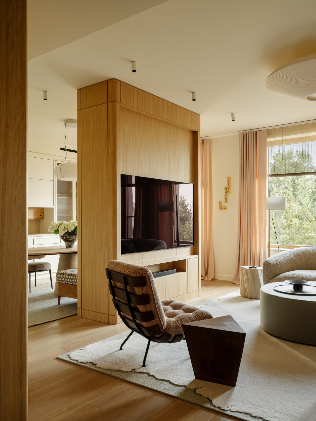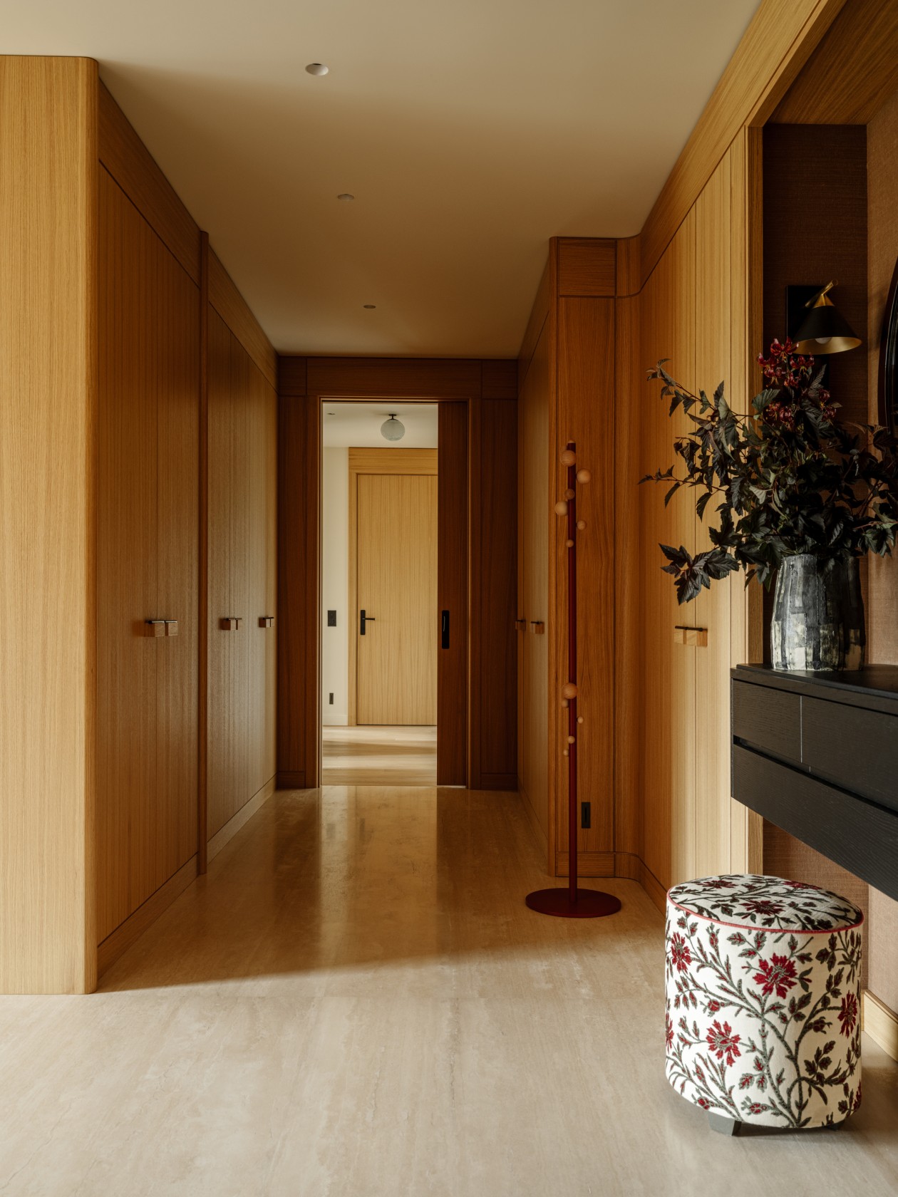 布局沿轴线展开:木饰面玄关如沉静方匣,其后是开阔的客厅。一把色调鲜明的扶手椅成为视觉焦点,其色彩在米褐基调中犹如一片枫红,搭配零星碧绿,形成温和的对比。