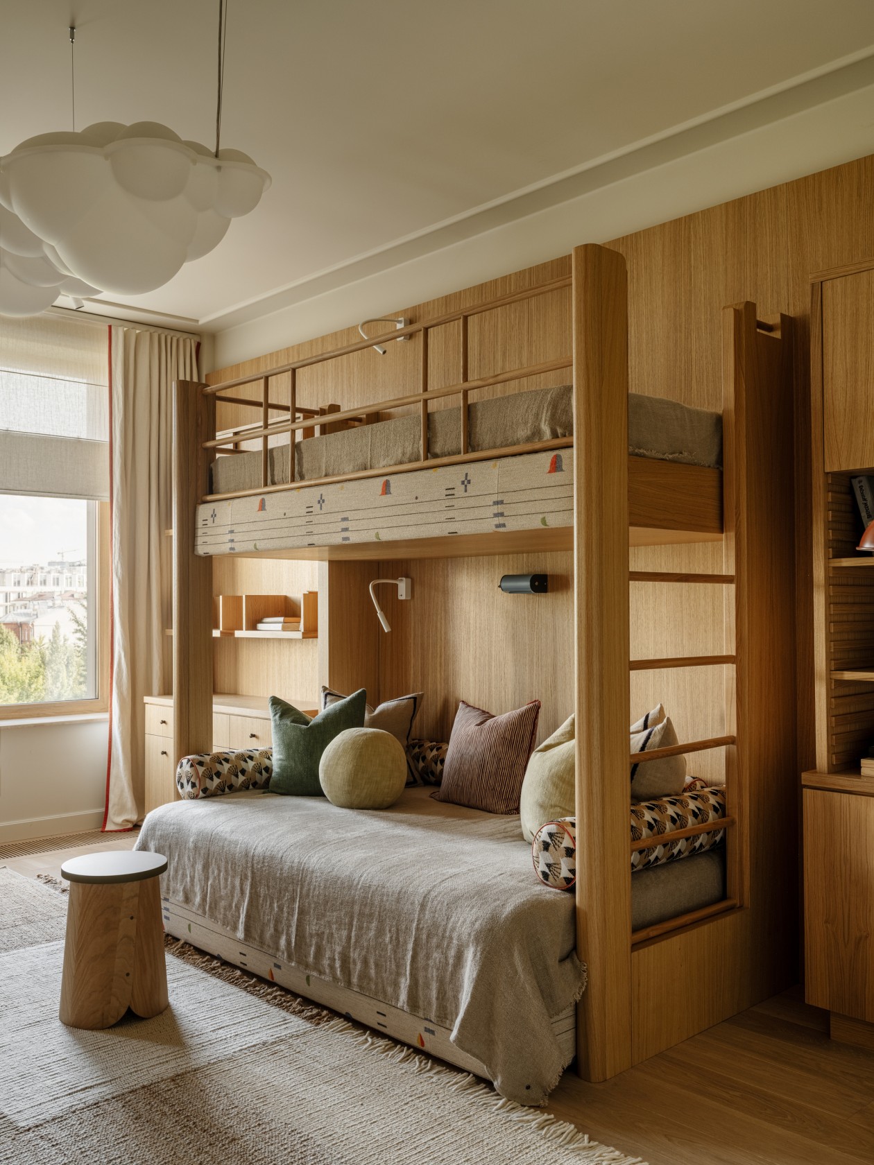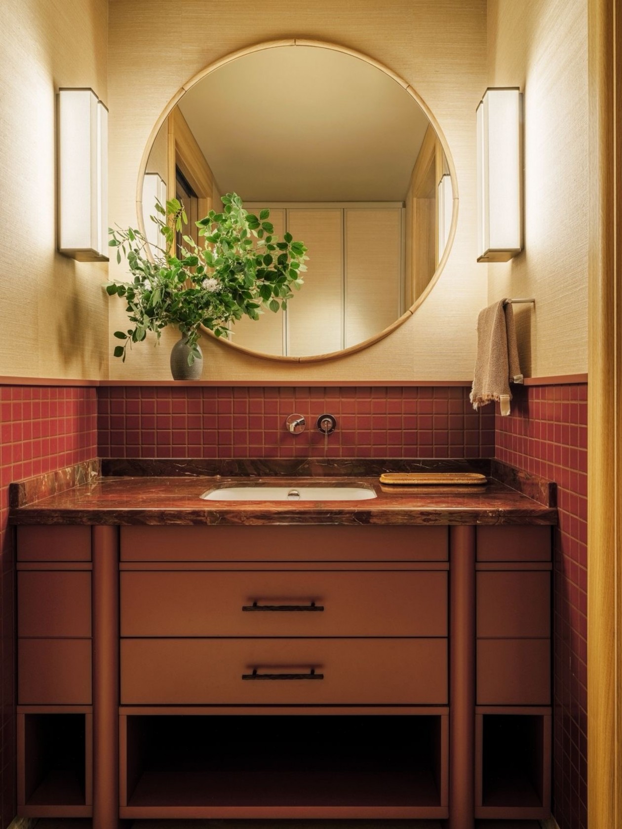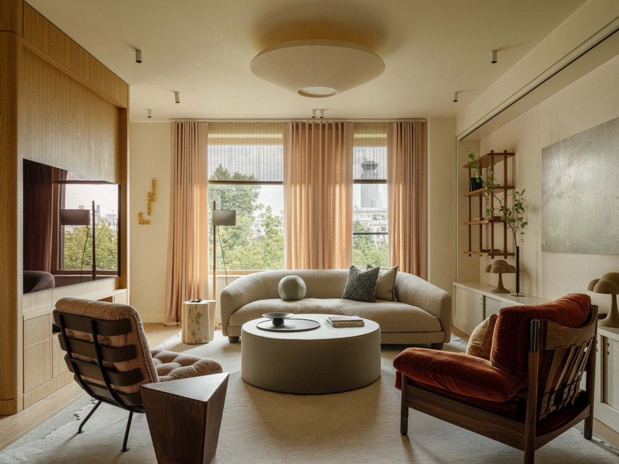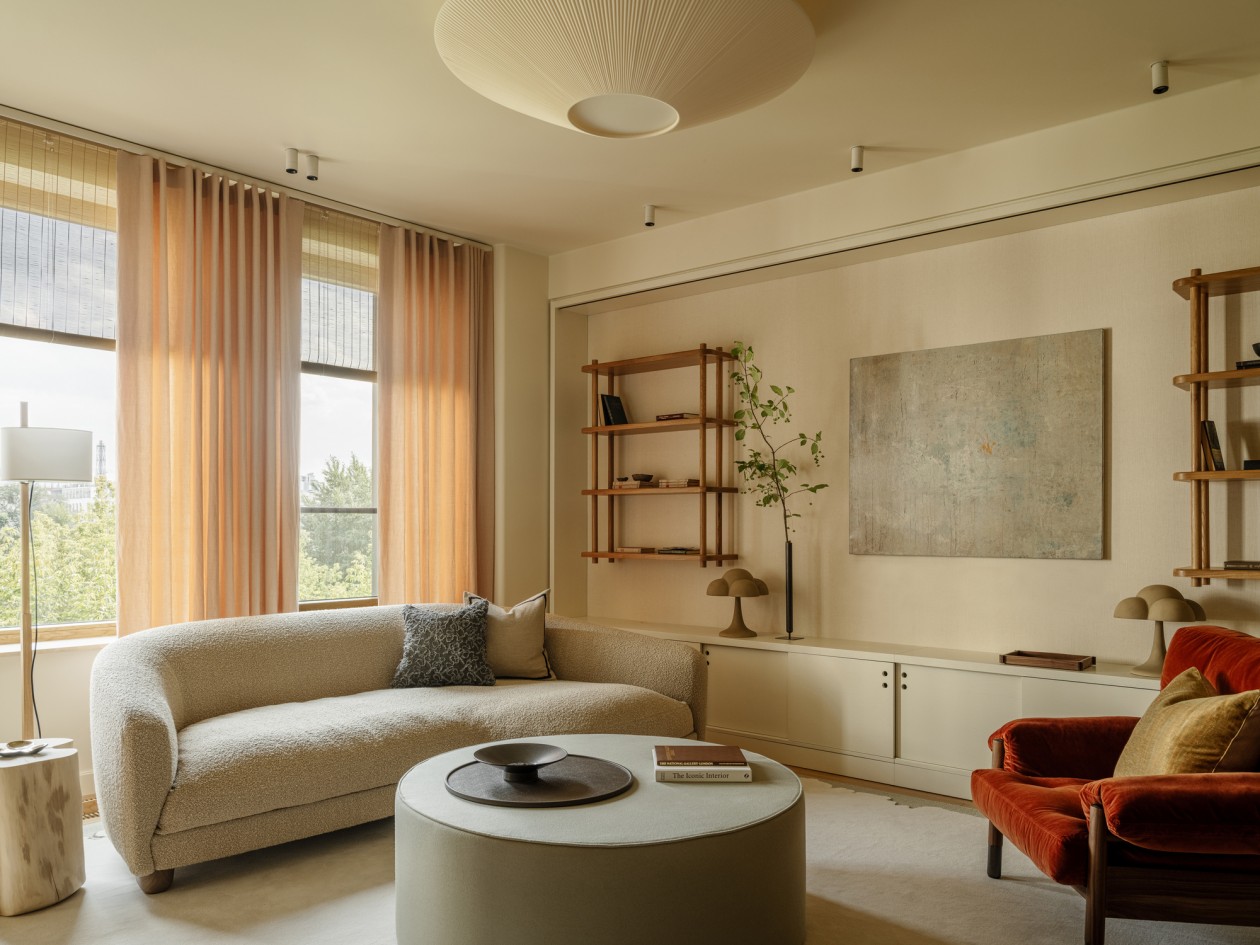 布局沿轴线展开:木饰面玄关如沉静方匣,其后是开阔的客厅。一把色调鲜明的扶手椅成为视觉焦点,其色彩在米褐基调中犹如一片枫红,搭配零星碧绿,形成温和的对比。