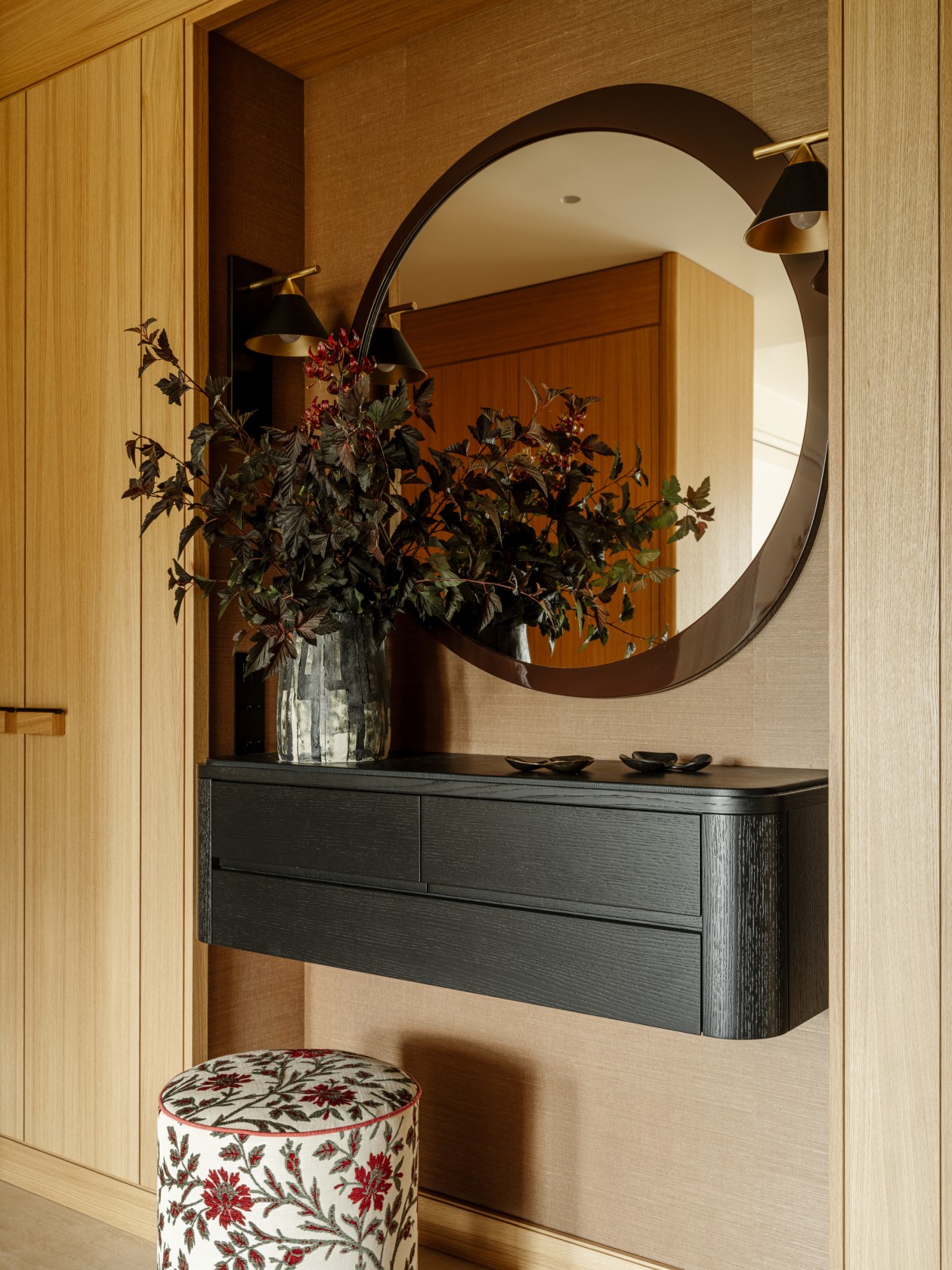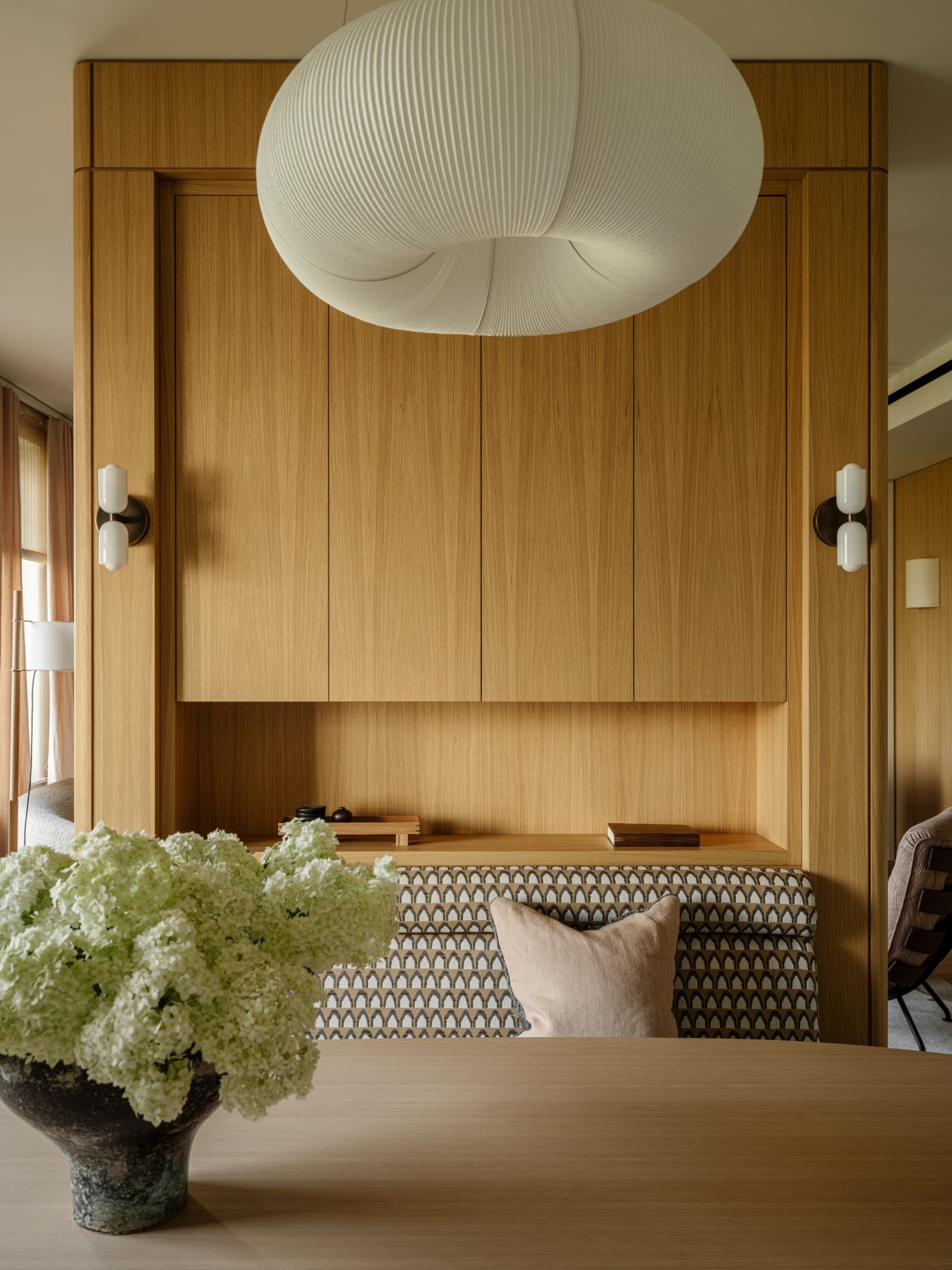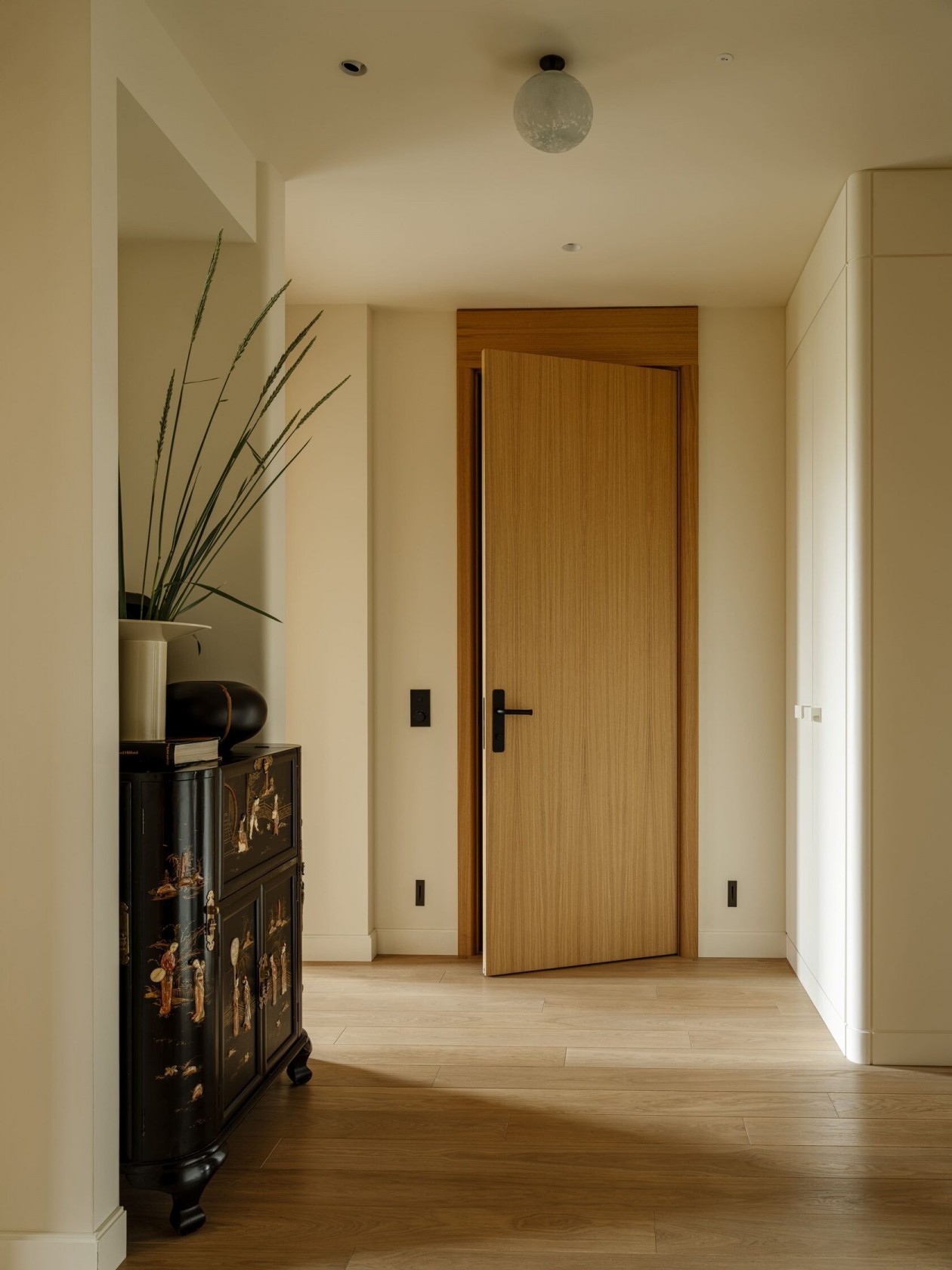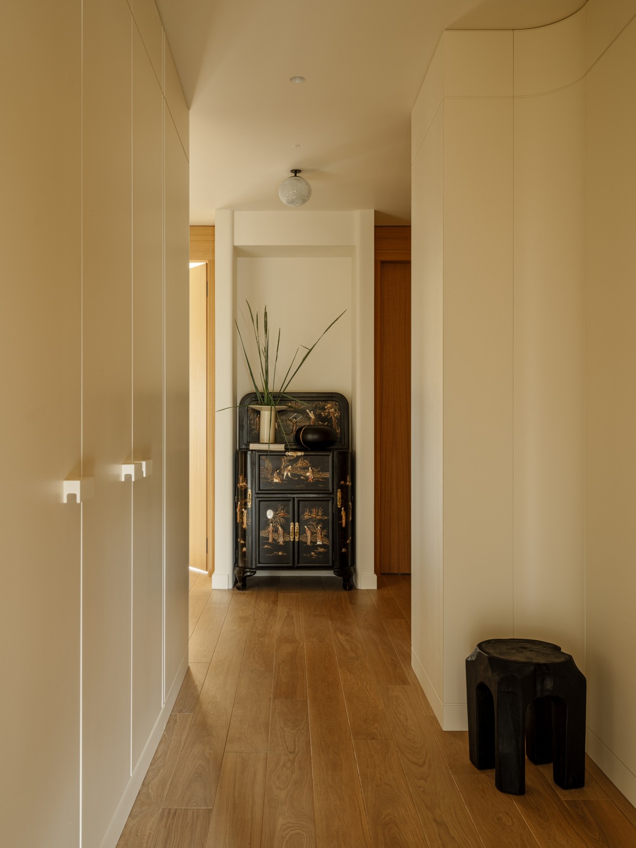 所有家具均为定制,陈设精心挑选,追求和谐而非炫耀。真正赋予空间灵魂的,是一件旧物:女主人继承自祖母的柜子。它并非价值连城的古董,却因其情感记忆,悄然引导了整体空间的东方意蕴。
