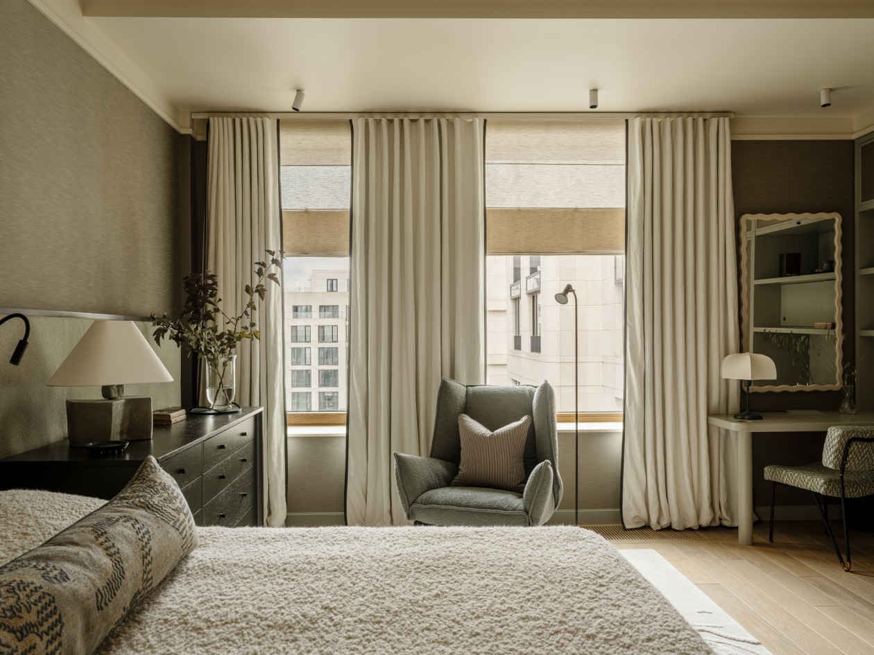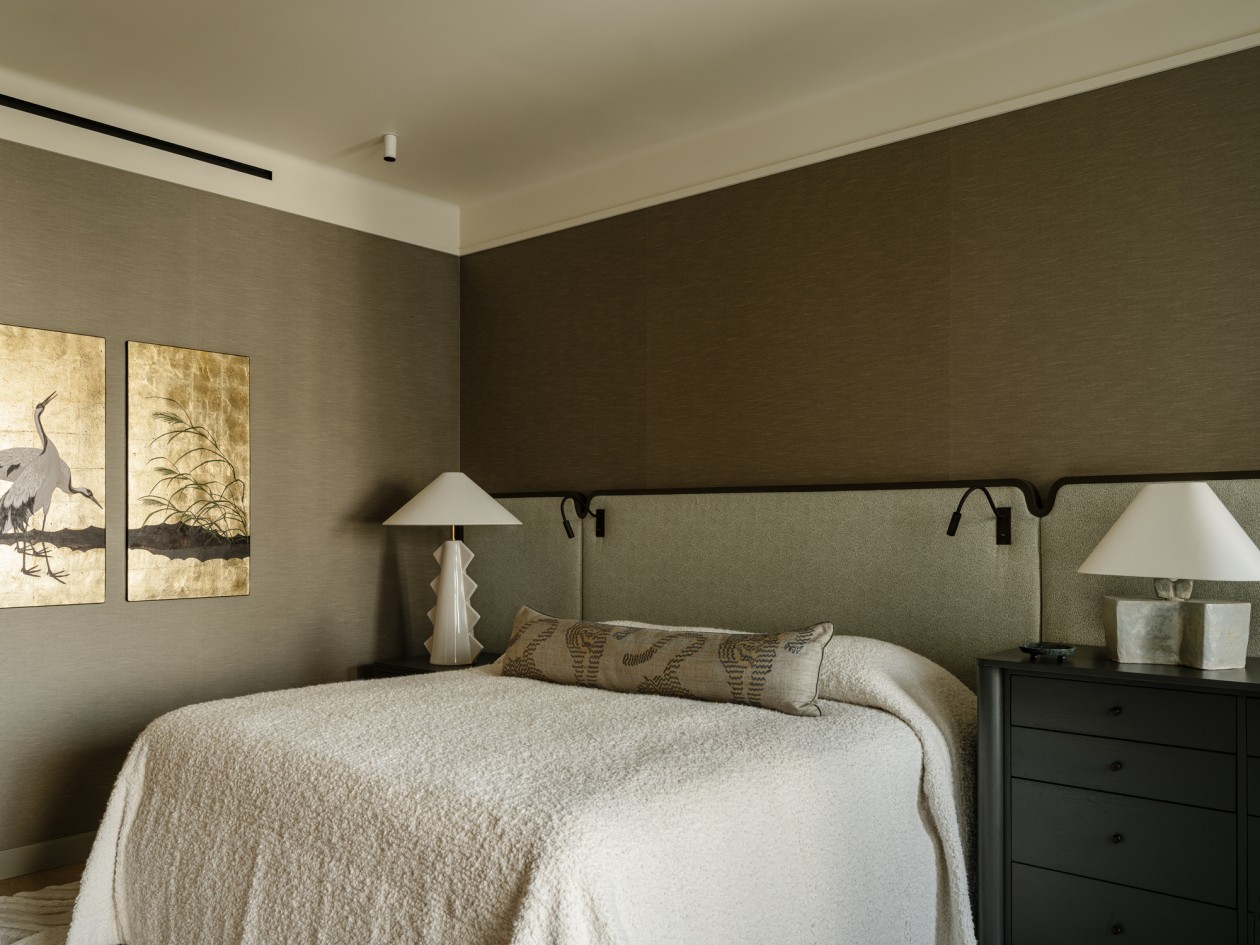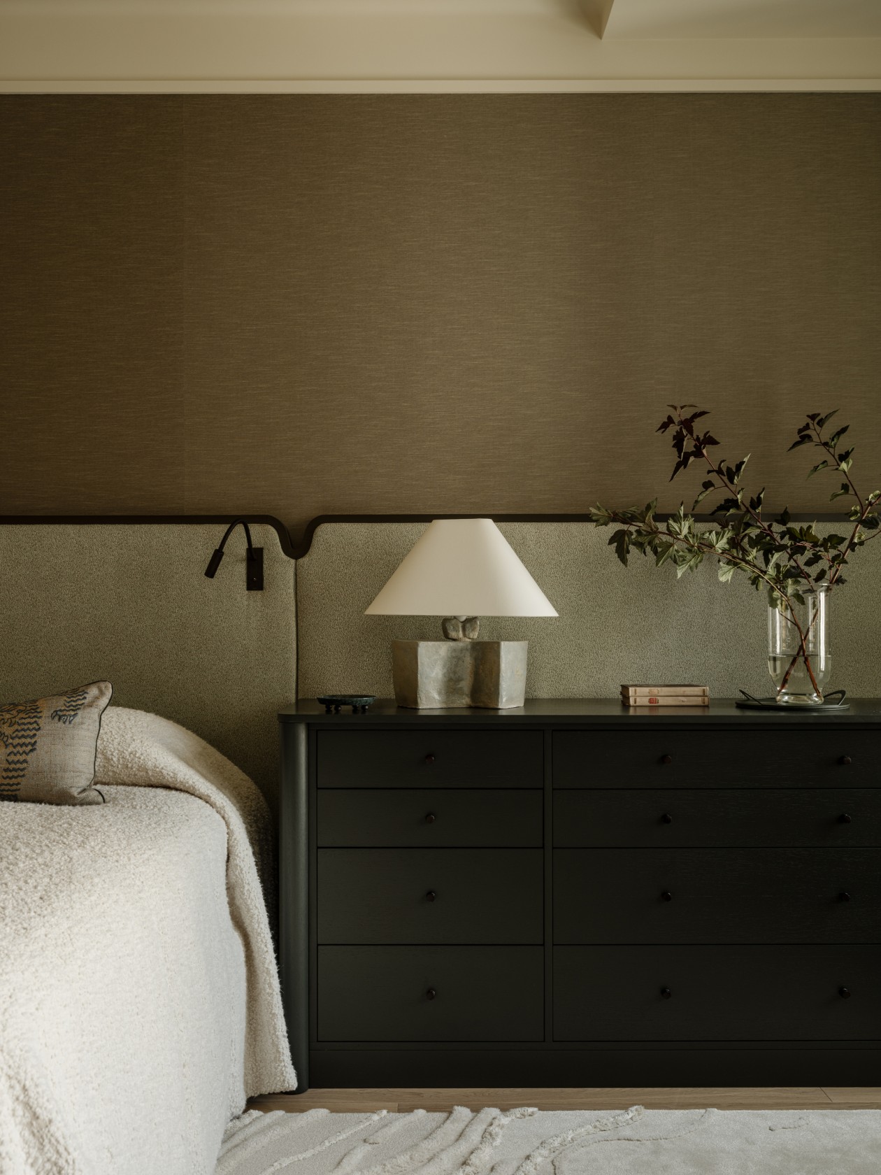 卧室白墙随光影产生丰富层次,抽象纹样似有若无地呼应着东方韵致。设计中融入的,远不止材料与色彩,更是那些仅为主人所懂的记忆与温情。