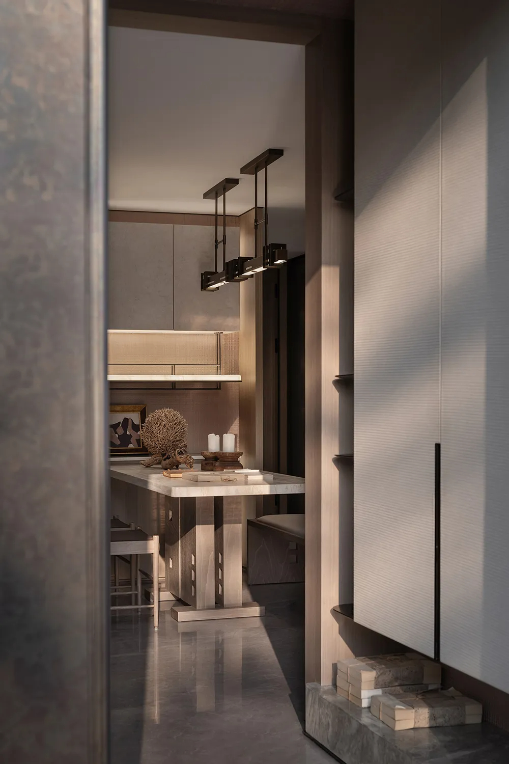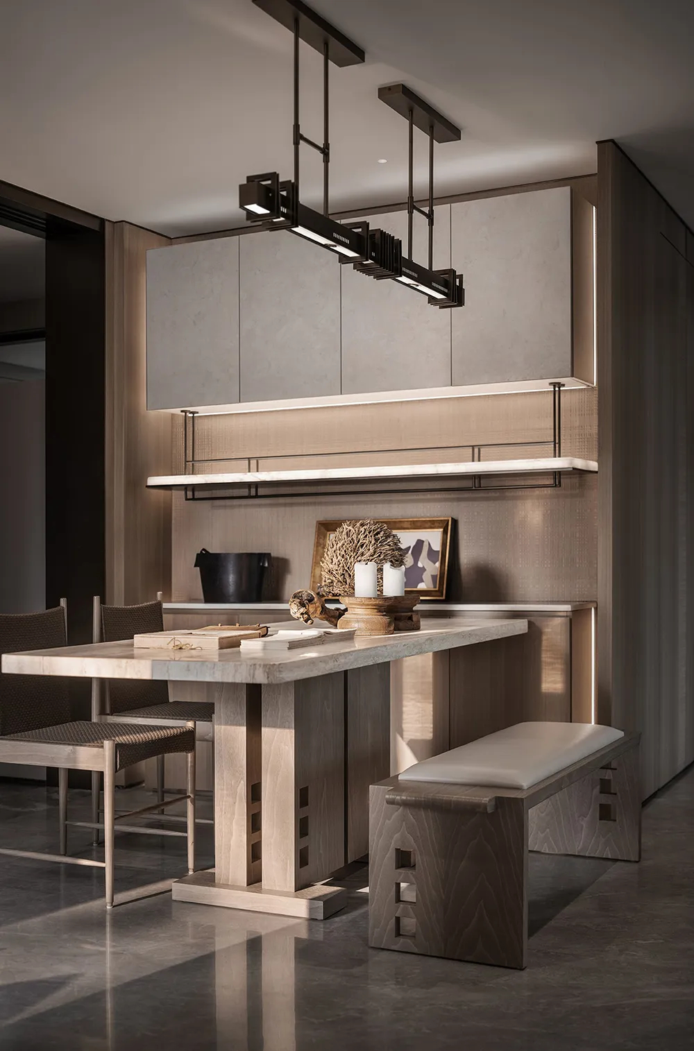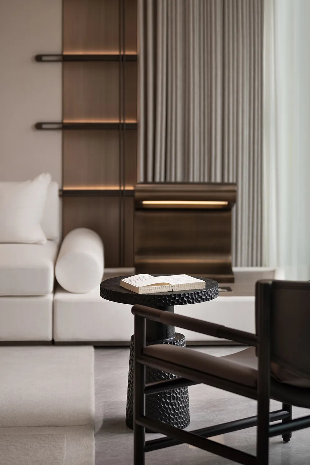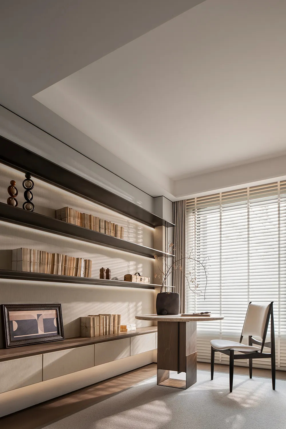 茶室静谧而富有气息,光影凸显材质肌理,从自然出发引导人沉浸其中,感悟生活真谛。书房陈设简约优雅,材质散发自然感,书香浸润空间,皮革与木质细腻交织,营造沉浸式氛围。
