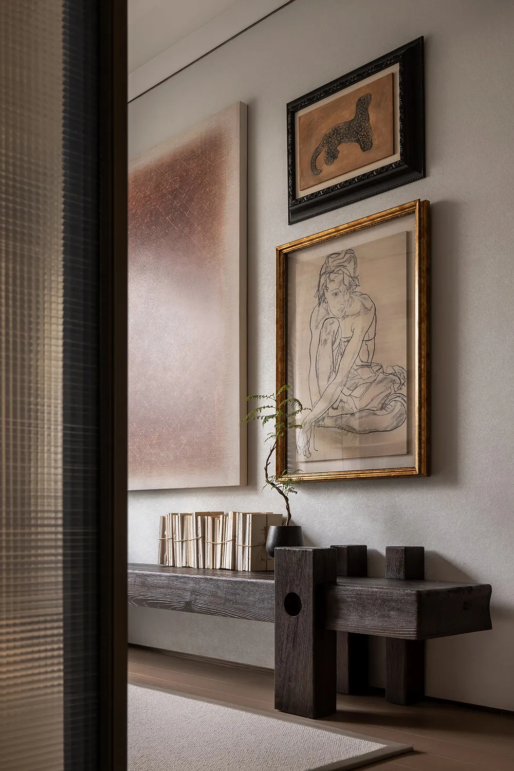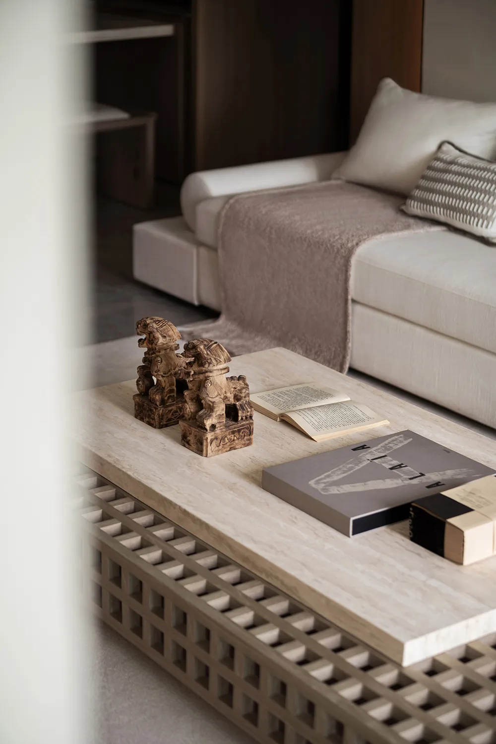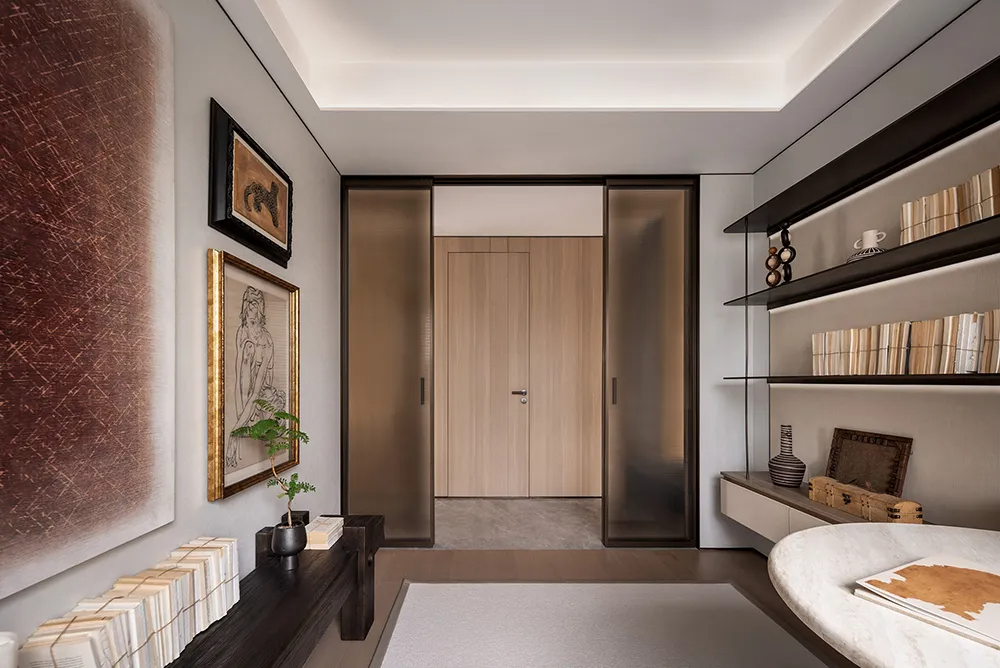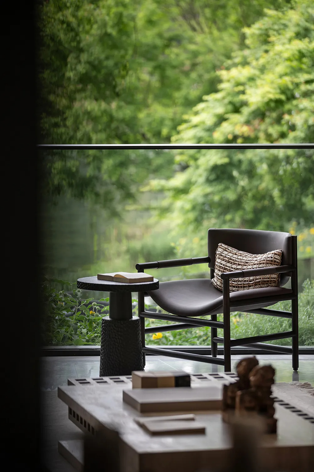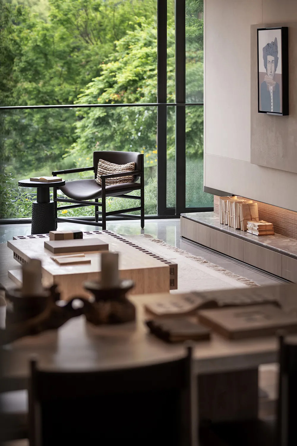茶室静谧而富有气息,光影凸显材质肌理,从自然出发引导人沉浸其中,感悟生活真谛。书房陈设简约优雅,材质散发自然感,书香浸润空间,皮革与木质细腻交织,营造沉浸式氛围。