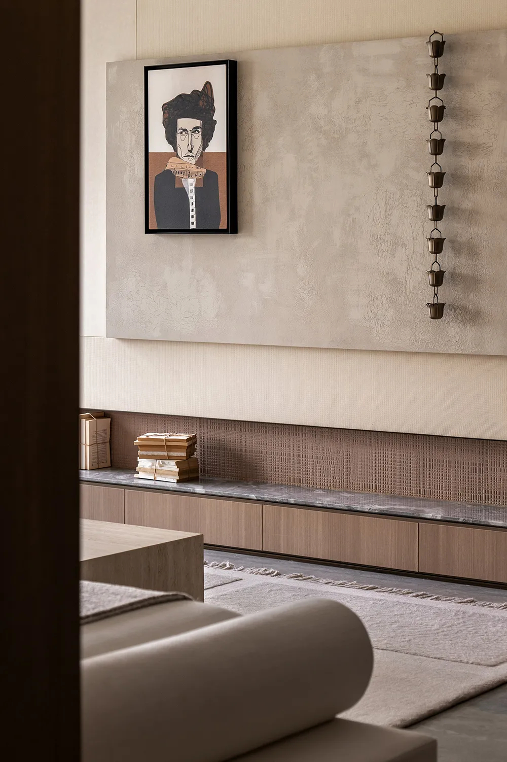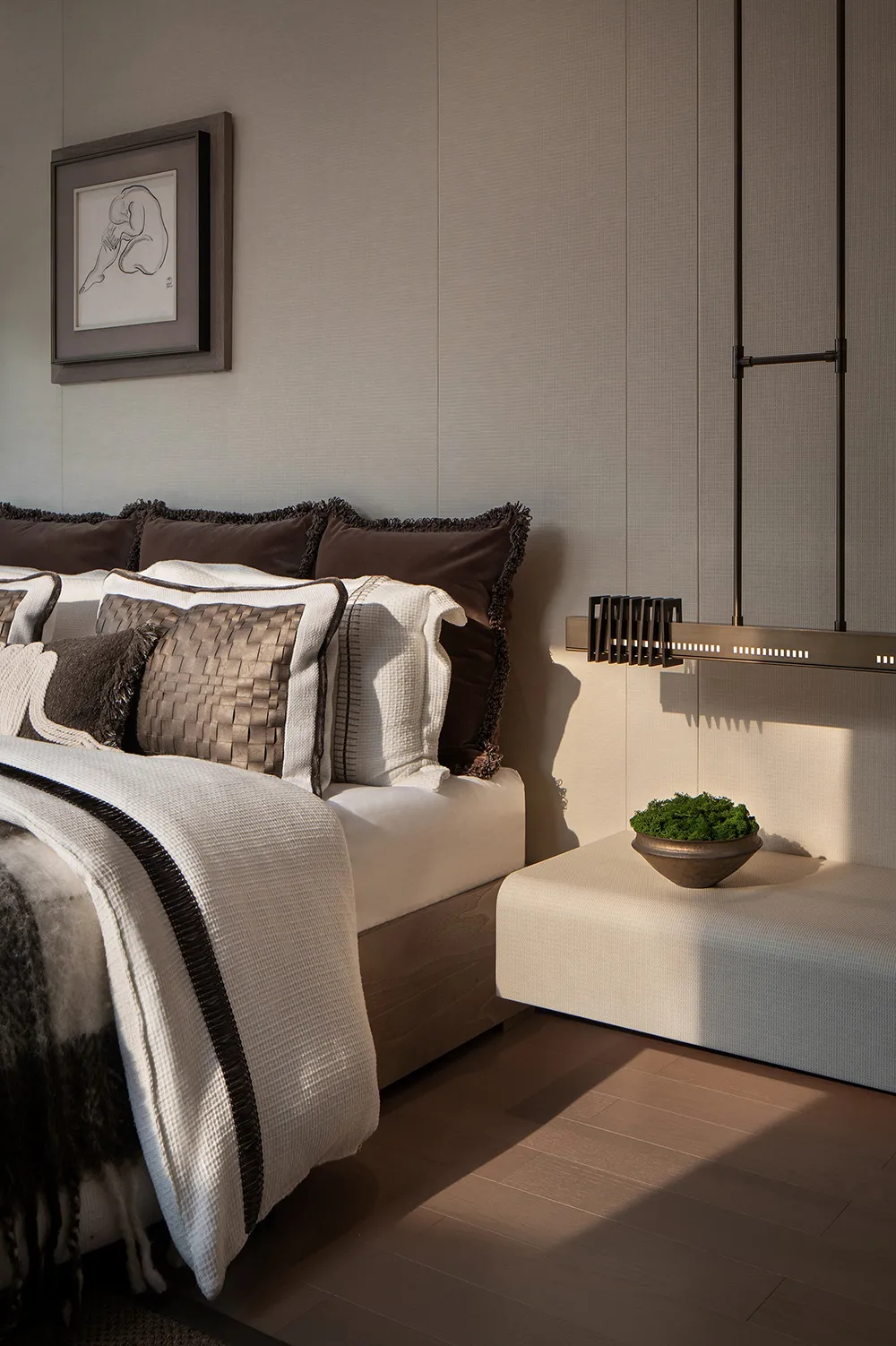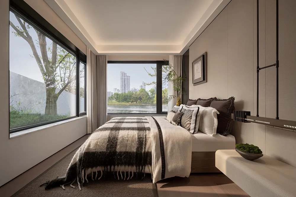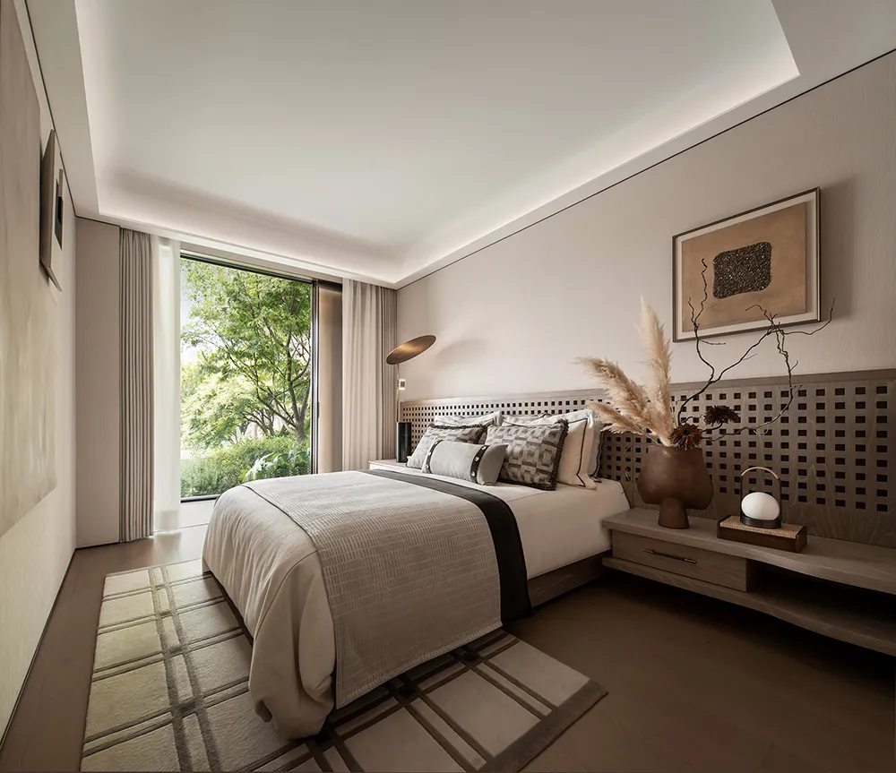 主卧室设双向窗口,实现立体观景效果,将四季变换引入室内。在空间与自然的互动中,内心归于平静,岁月静好之感油然而生。整个设计以自然温润空间,还原艺术本质,让人在光影与草木清香中安放生活,获得日常如度假般的能量。