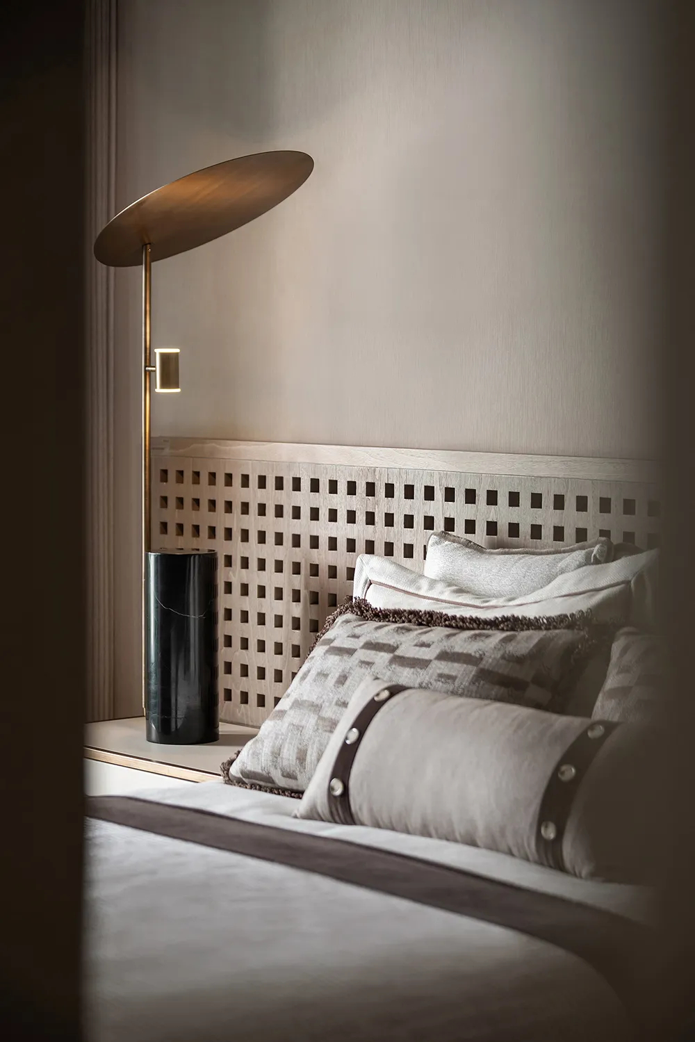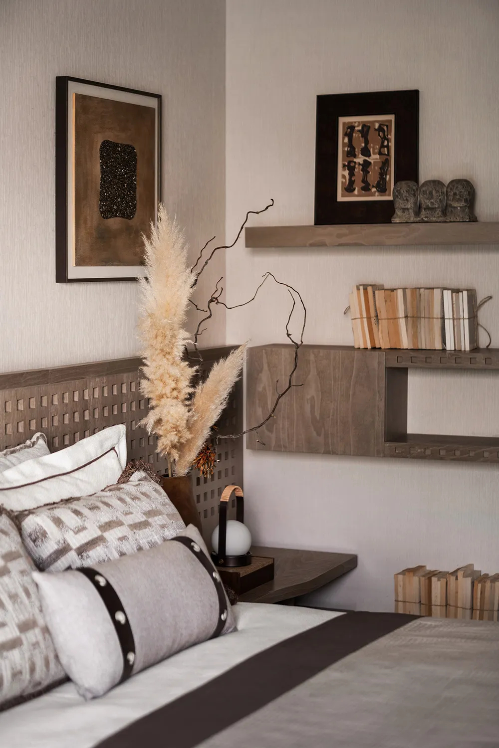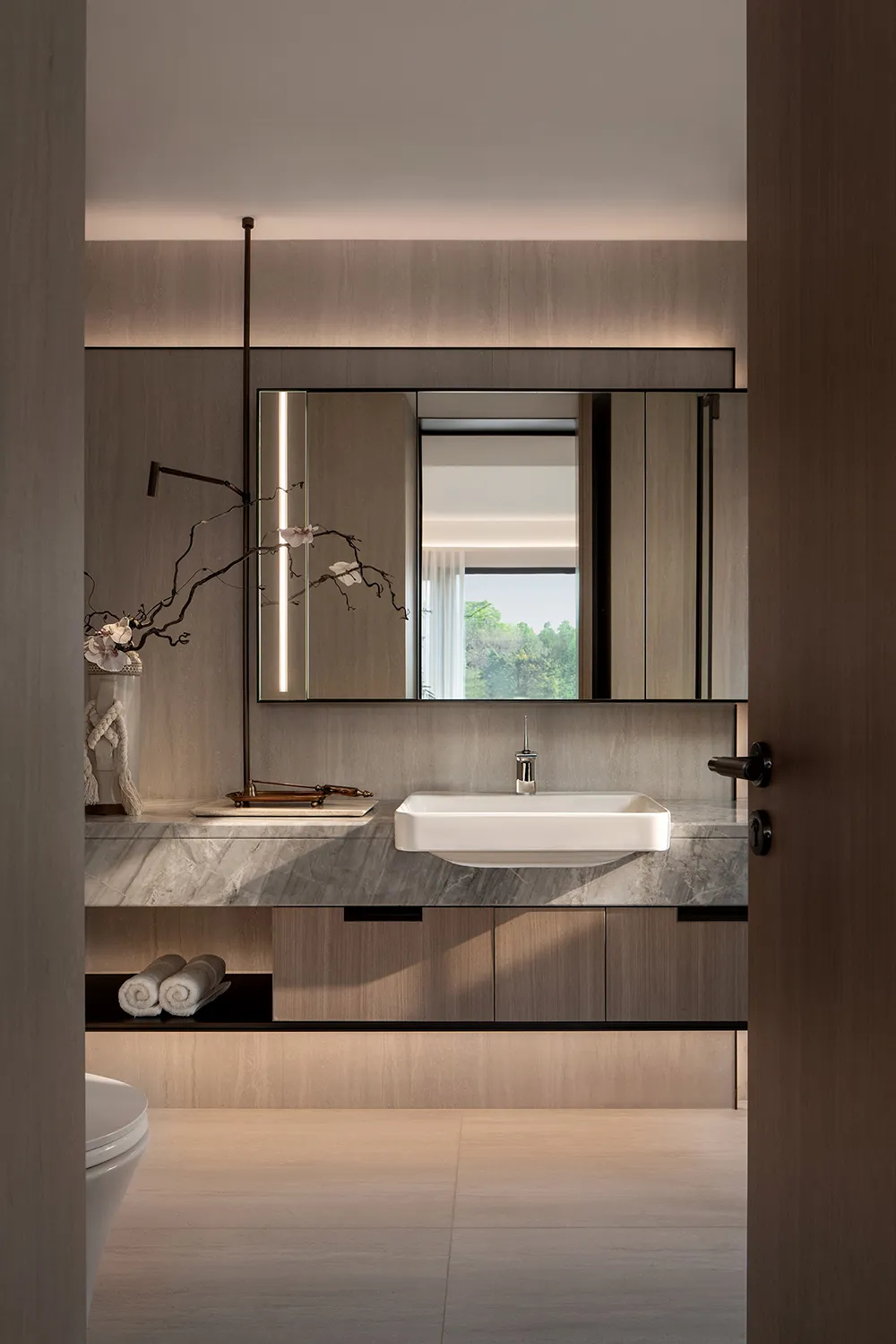 主卧室设双向窗口,实现立体观景效果,将四季变换引入室内。在空间与自然的互动中,内心归于平静,岁月静好之感油然而生。整个设计以自然温润空间,还原艺术本质,让人在光影与草木清香中安放生活,获得日常如度假般的能量。