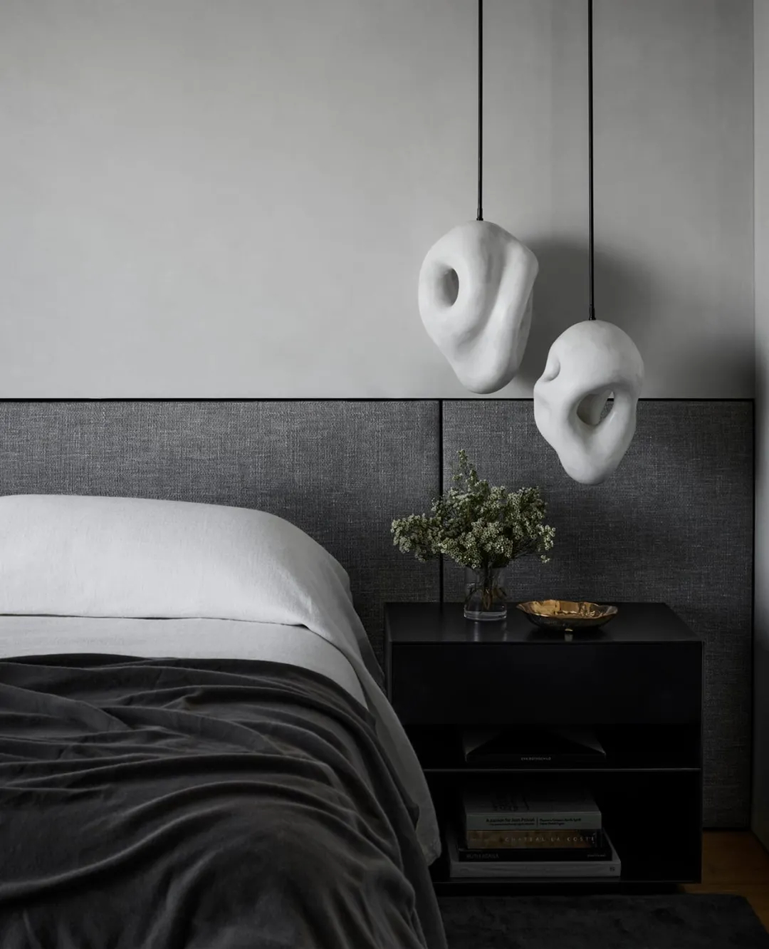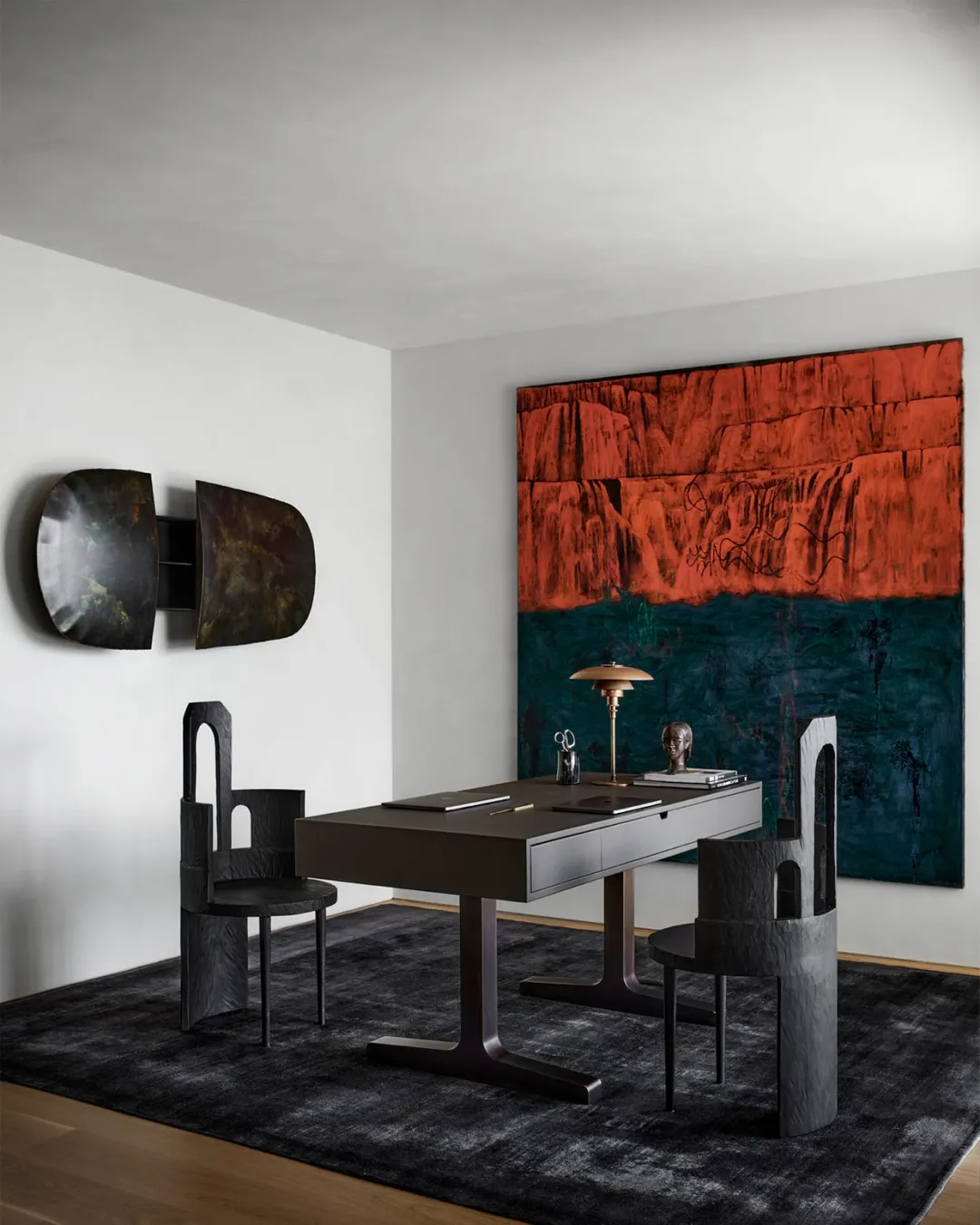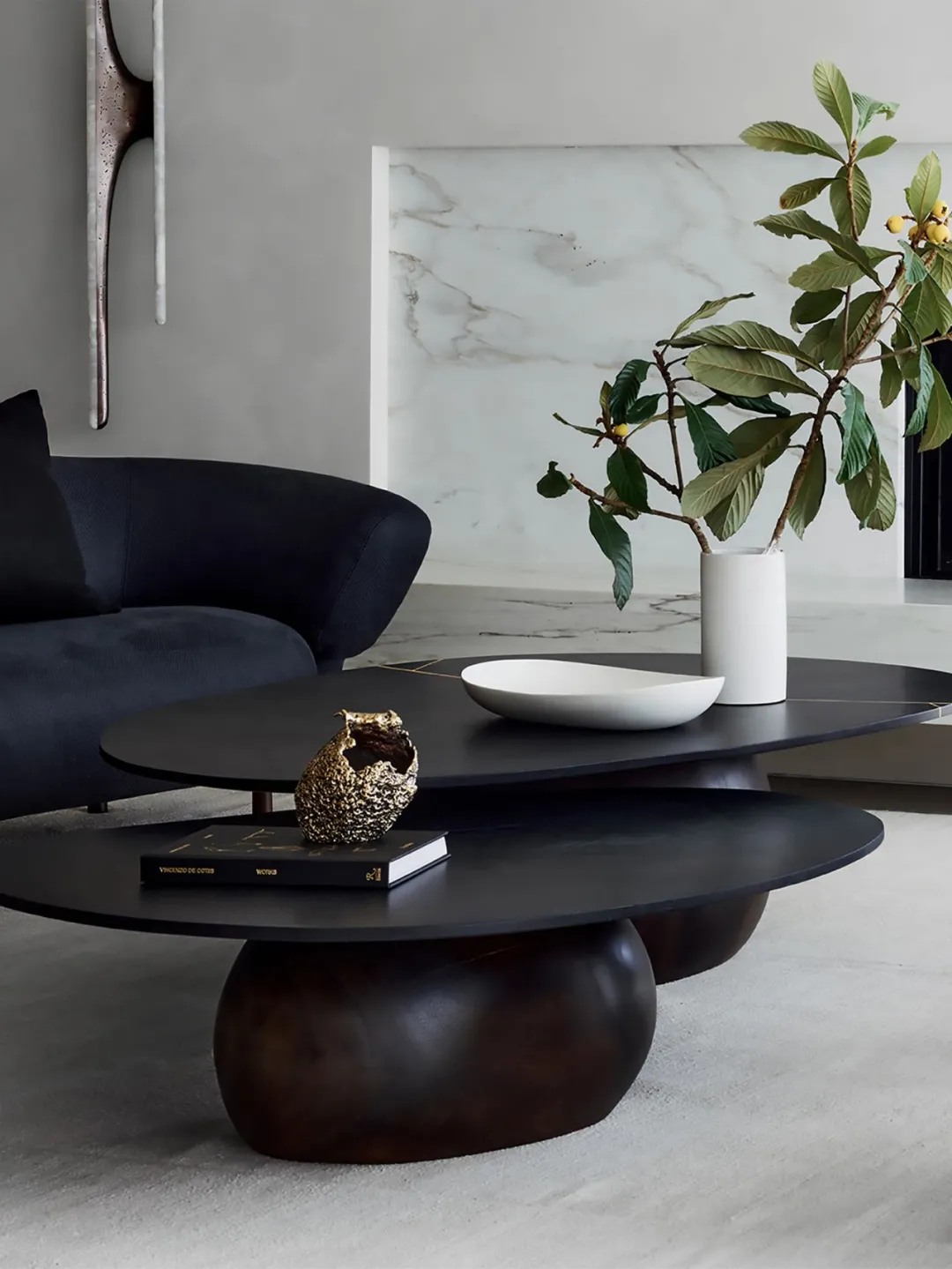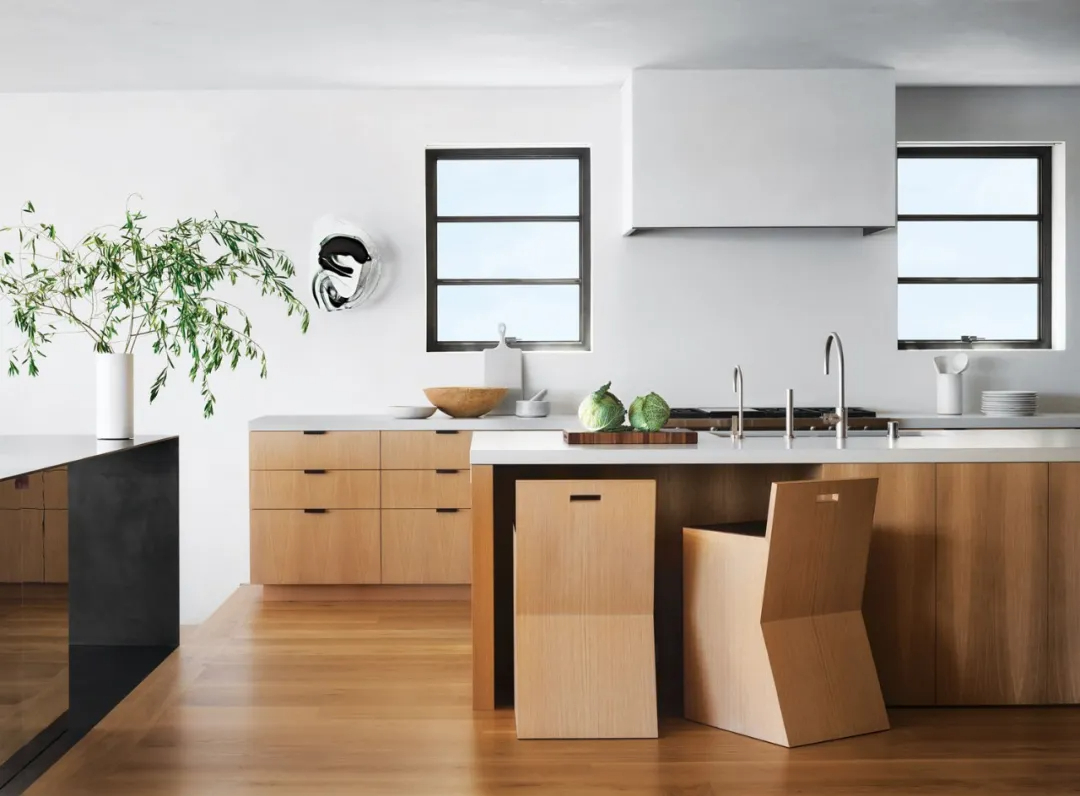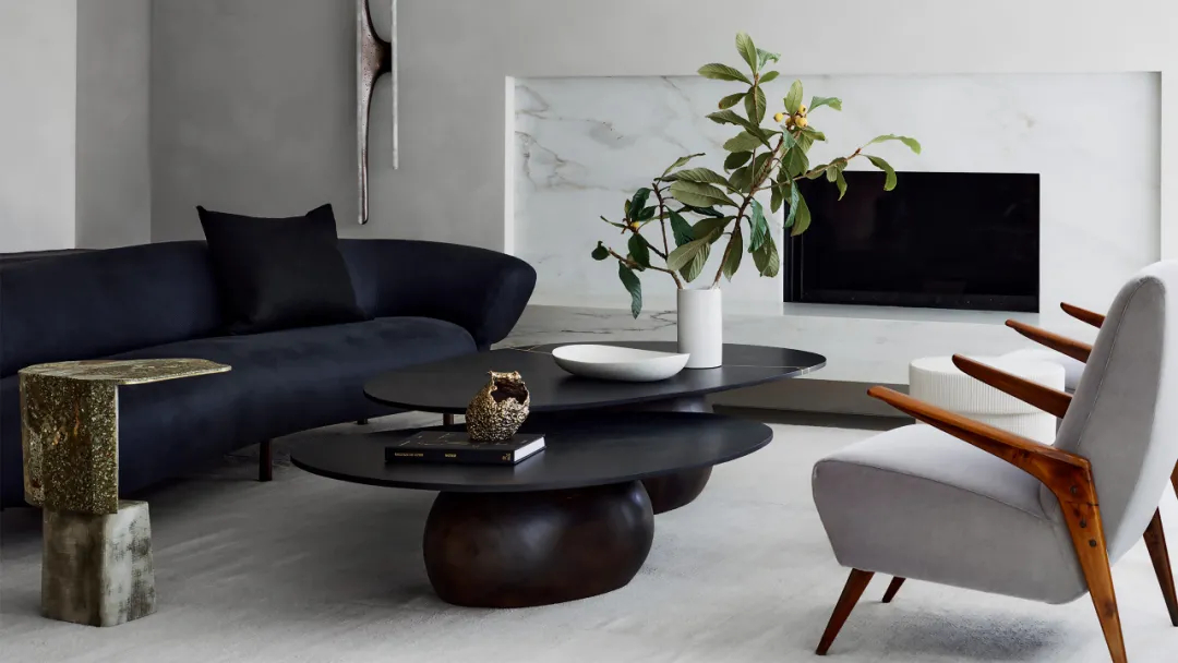 客厅里,Nakagawa Mokkouge设计的鸡尾酒桌位于Christophe Delcourt沙发和Vincenzo De Cotiis桌子之间,另一边是一对上世纪中叶的意大利躺椅,在极简主义的大理石壁炉旁边,一个Markus Haase的壁灯给人以视觉震撼。