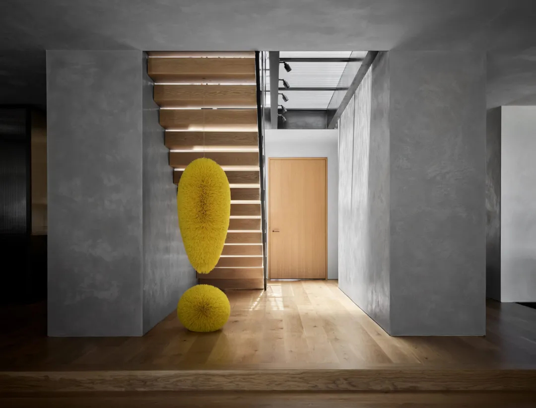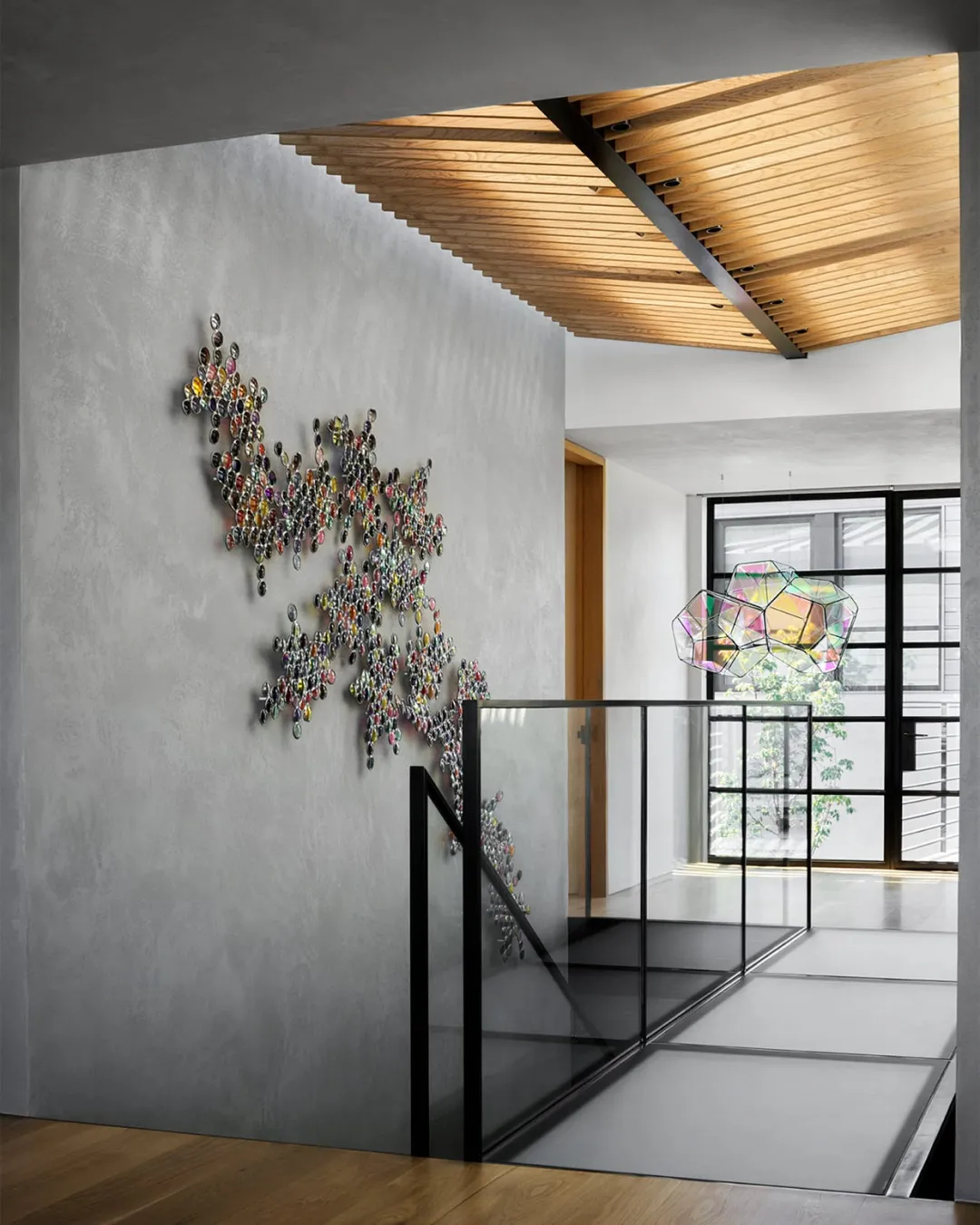 在二楼楼梯平台上方的天窗处,Nicole Hollis添加了一个屏幕,在Jim Lambie安装的彩色太阳镜墙上投射出条纹状的影子。走廊上悬挂着一座Tomás Saraceno的几何雕塑。