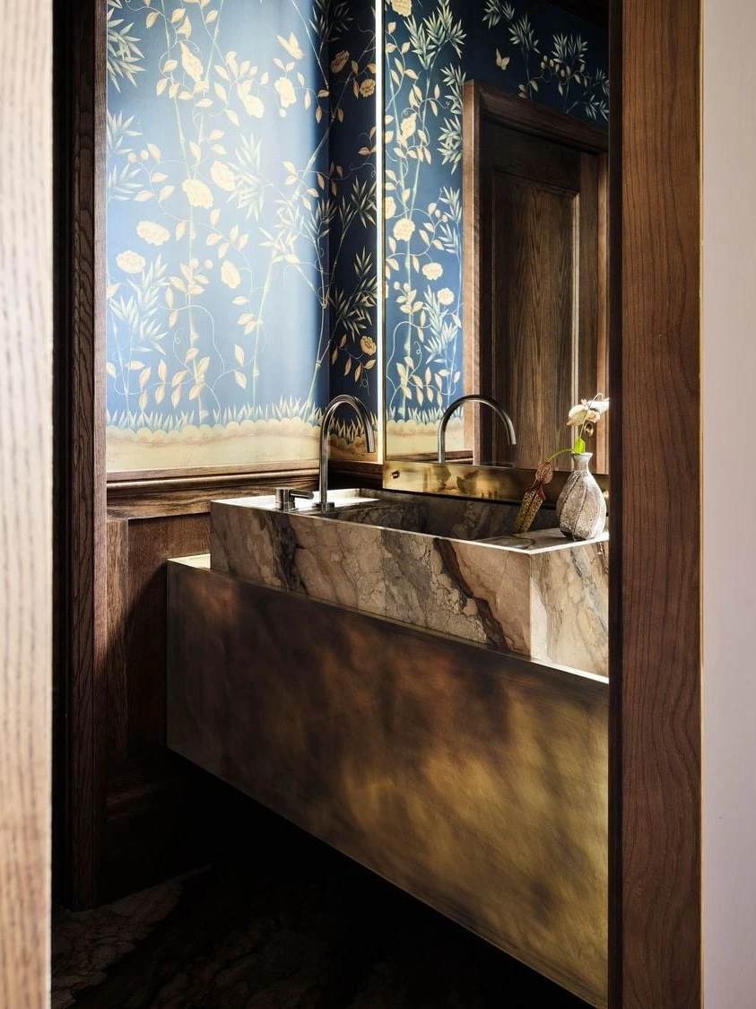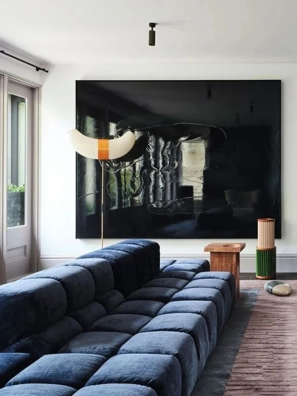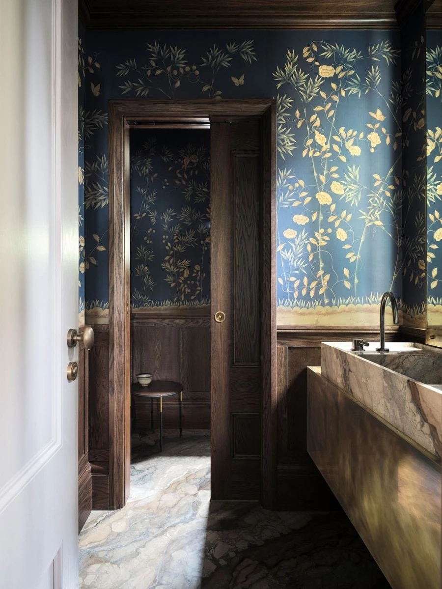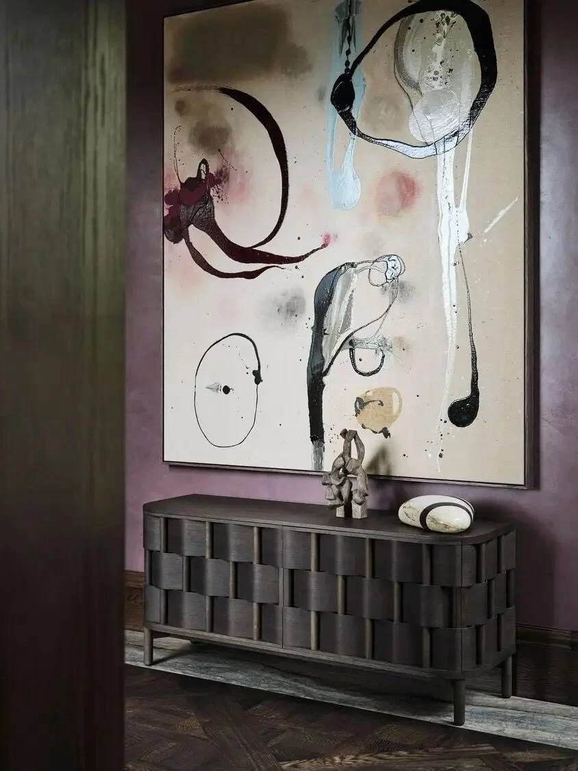 走进空间,最先被打动的是材质与色彩交织的氛围感。实心橡木的温润、天然石材的厚重、黄铜与钢材的冷冽,在深墨蓝、酒红与紫红色调的串联下,形成了极具电影感的视觉层次。这种搭配自带沉稳气场,却又因当代家具与艺术品的点缀,避免了复古风格的沉闷,让庄重与活力达成完美平衡。