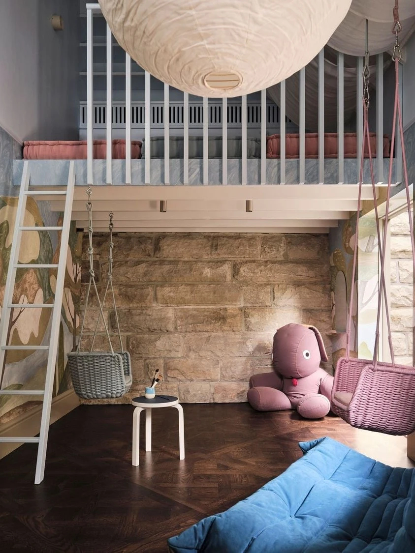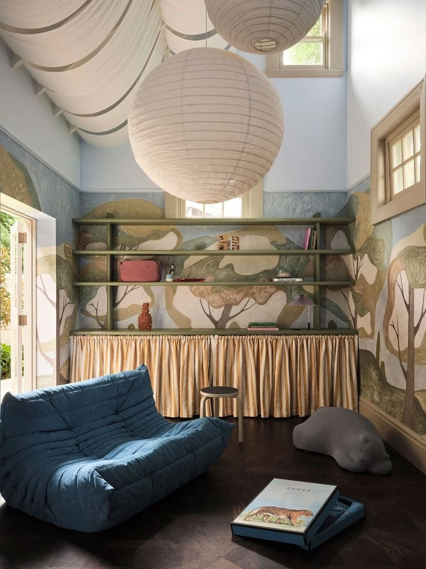 而住宅的惊喜,更藏在那些充满生活温度的角落。精致的化妆间满足日常精致需求,原卧室改造的普拉提室、艺术工作室,则为居住者预留了安放热爱的天地。最让人惊艳的莫过于游戏室,手绘森林壁画搭配柔软织物,将现代哥特的神秘与梦幻氛围融合,成为空间里最治愈的存在。