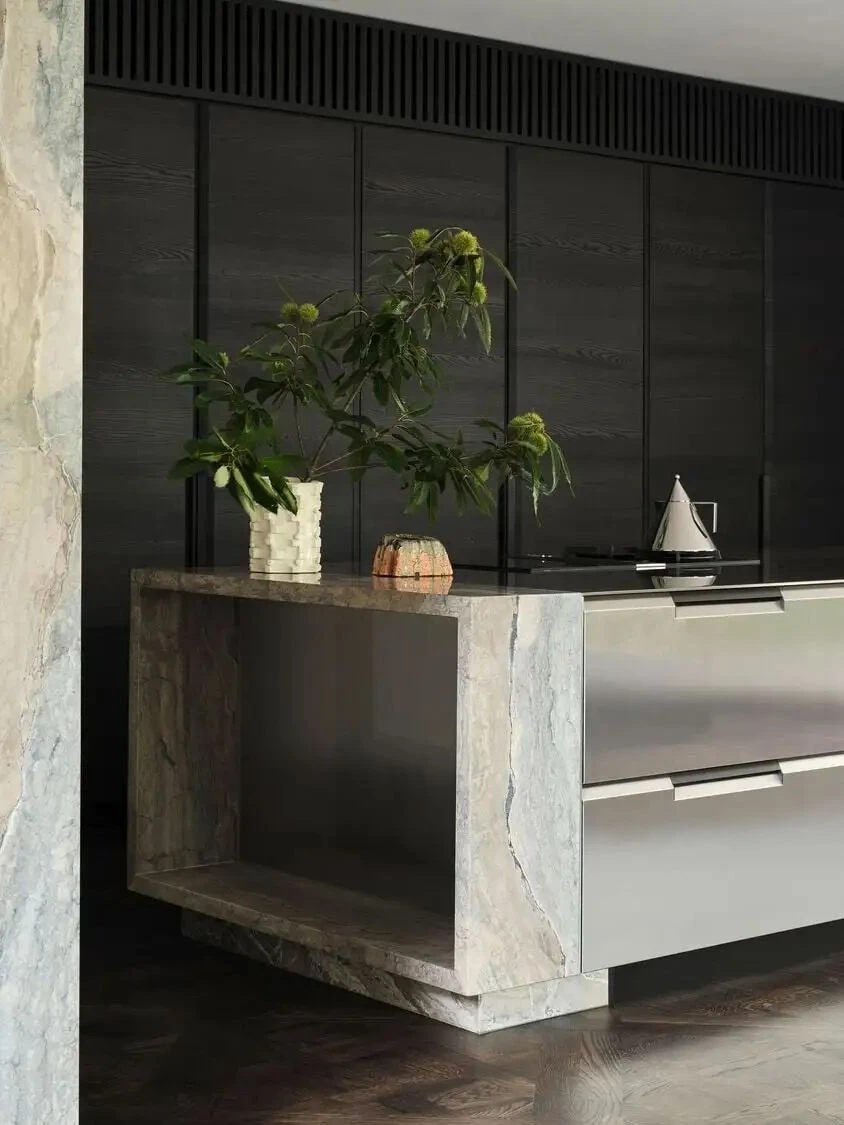 开放式起居空间以模块化沙发为核心,巧妙串联起露台与厨房,打破了空间的割裂感。无论是亲友小聚的欢声笑语,还是独自静享的午后时光,这里都能完美承接——毕竟真正的豪宅设计,从来都是以生活场景为核心。