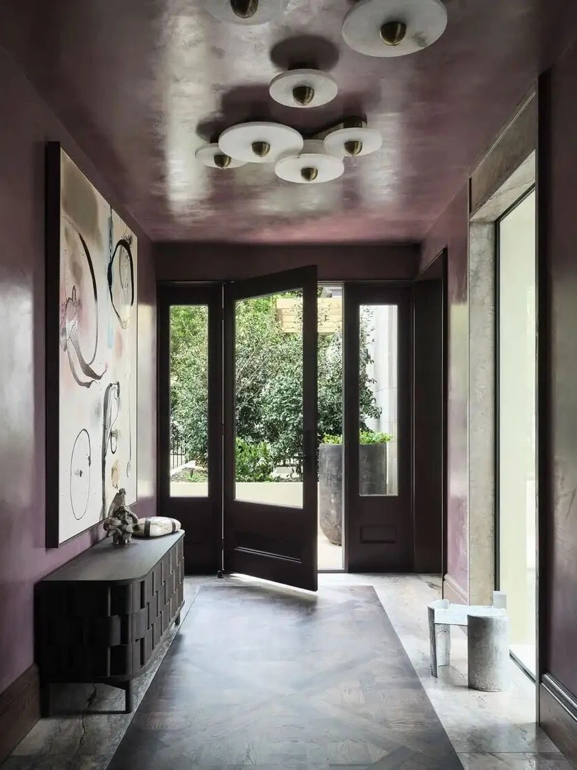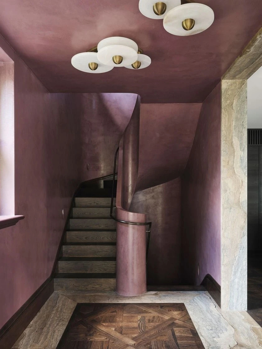 入口门厅堪称整个空间的“风格序章”。威尼斯灰泥墙面的细腻肌理、雕塑感十足的旋转楼梯,再搭配一盏雪花石膏吊灯,光线透过材质漫射开来,瞬间奠定了优雅而神秘的整体基调。