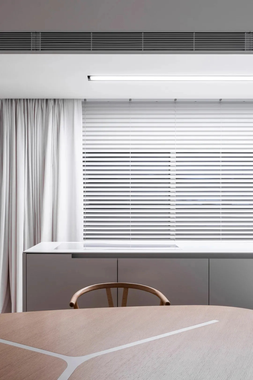 厨房延续整体白色主调,采用极简一体化设计。白色定制橱柜内嵌各类电器,兼顾实用收纳与空间整洁度;搭配同色系简约窗帘,色调统一和谐。用餐区选用原木餐桌,与白色柜体形成冷暖平衡,打造清新自然的用餐环境。