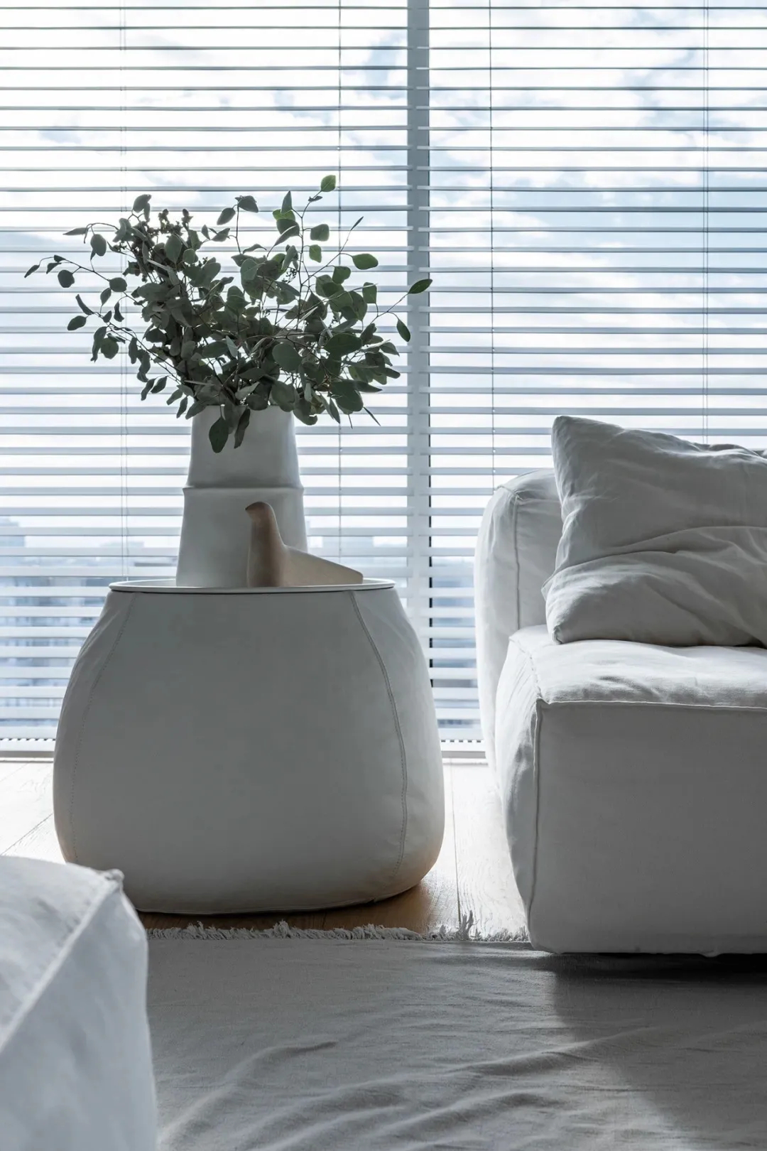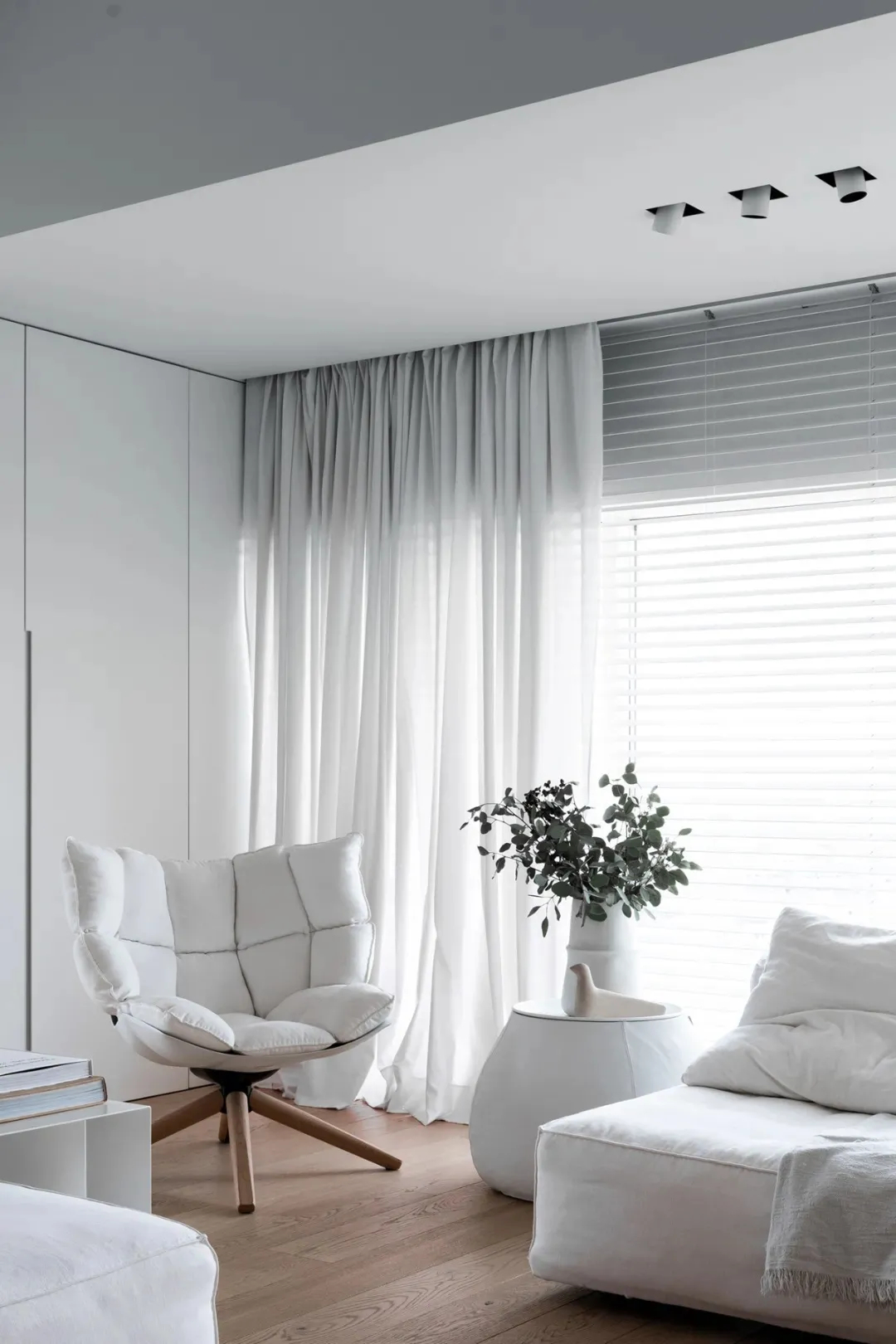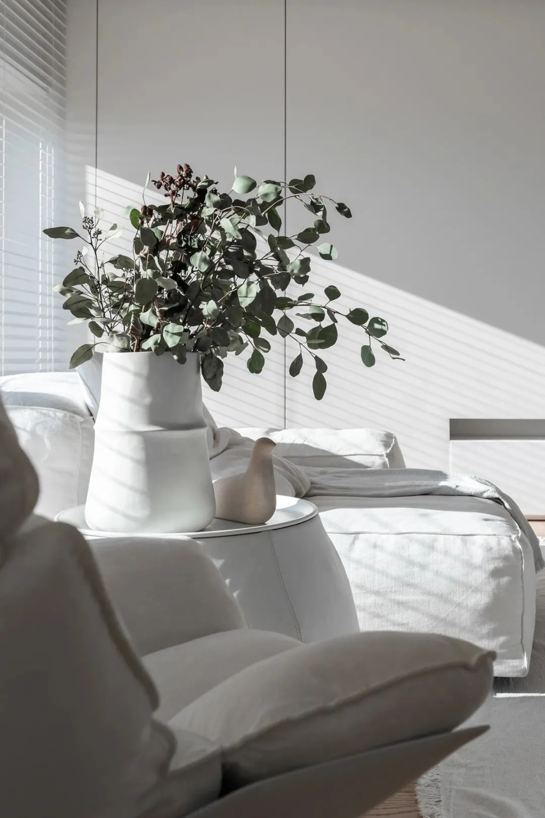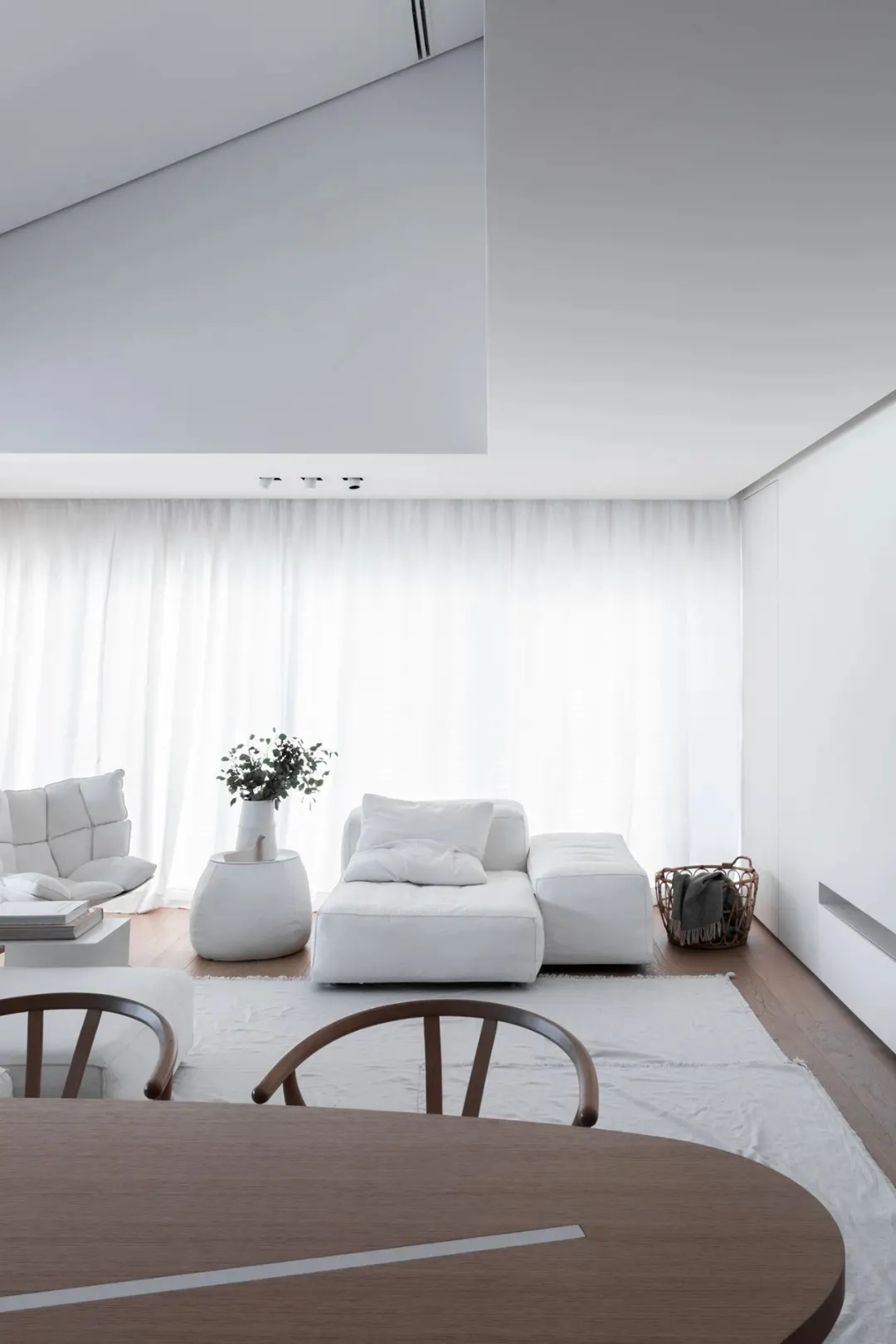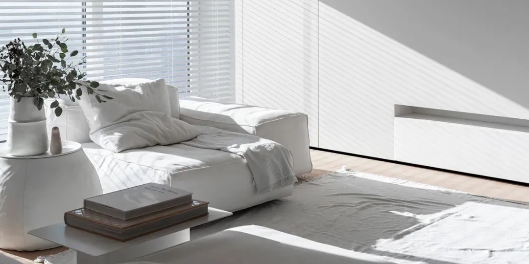 客厅以通透感为核心,摆放 Piero Lissoni 设计的 Extrasoft 白色沙发,形态柔和,触感舒适,为家人提供放松的休憩区域。自然光透过百叶窗均匀漫入,提亮整个白色空间,营造柔和明亮的氛围。角落点缀绿植,在极简底色中增添自然生气,还原现代简约的生活本真。