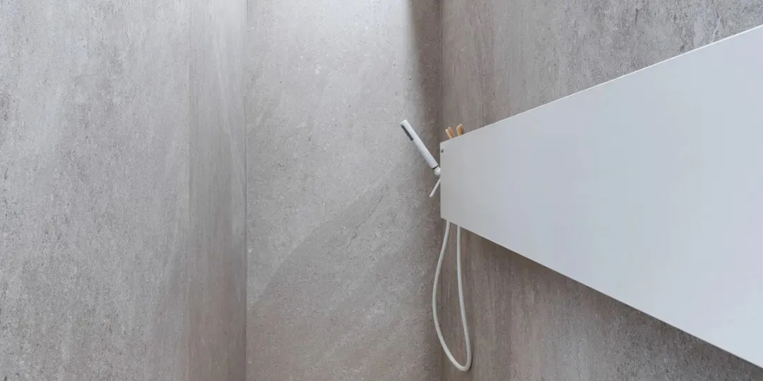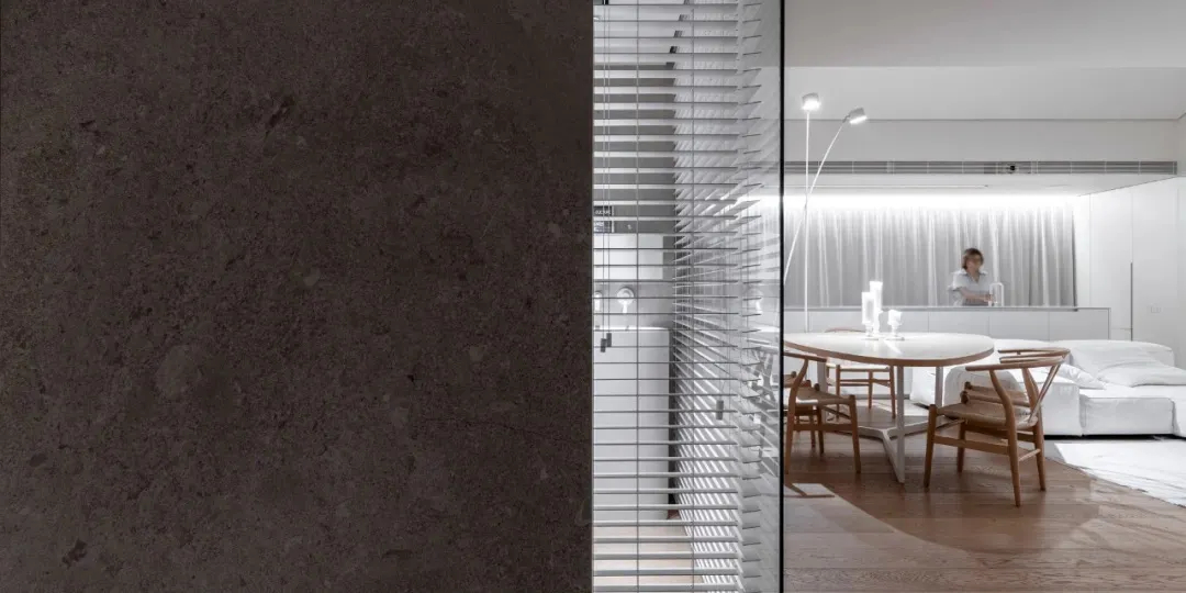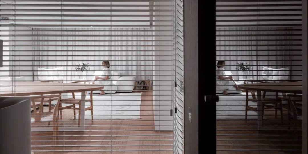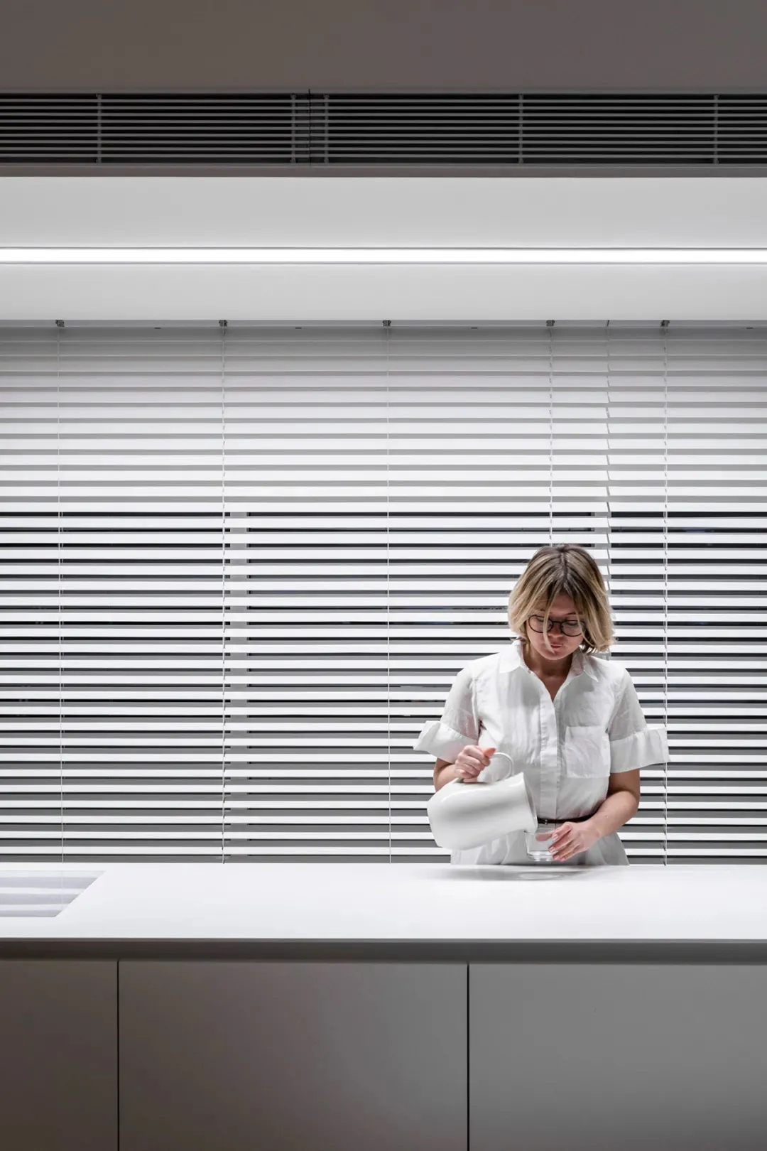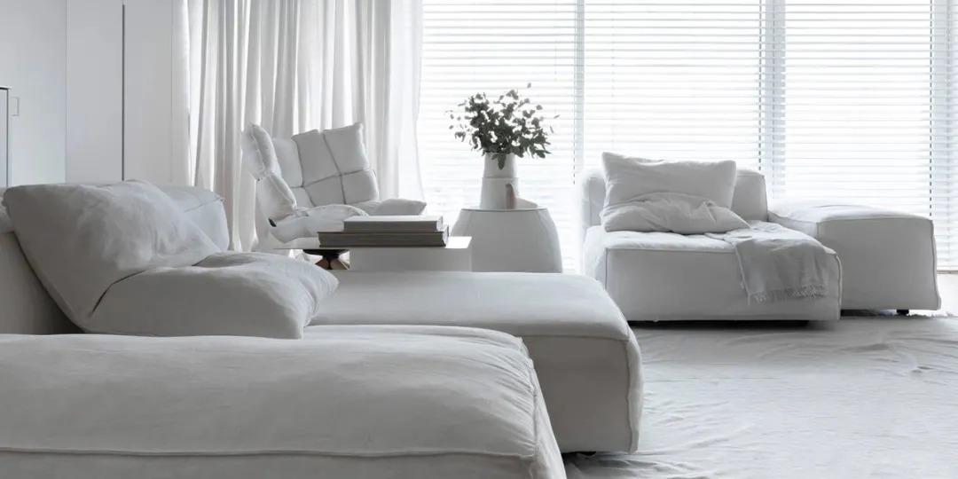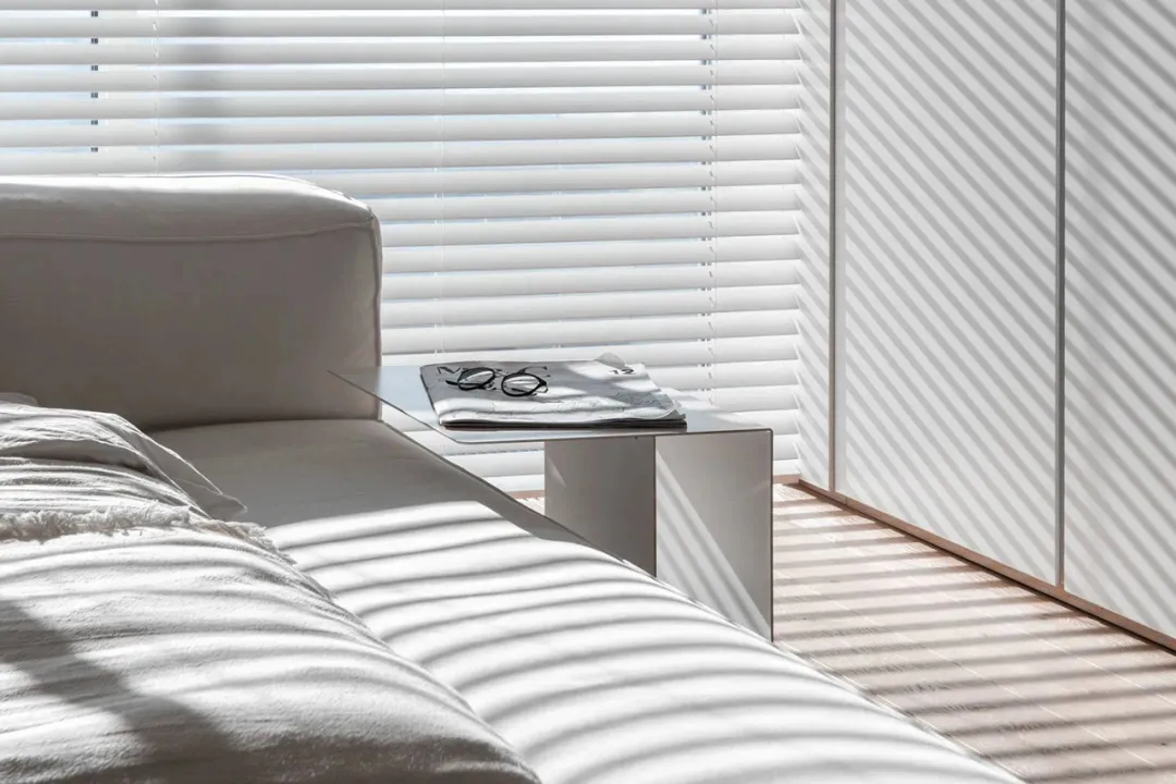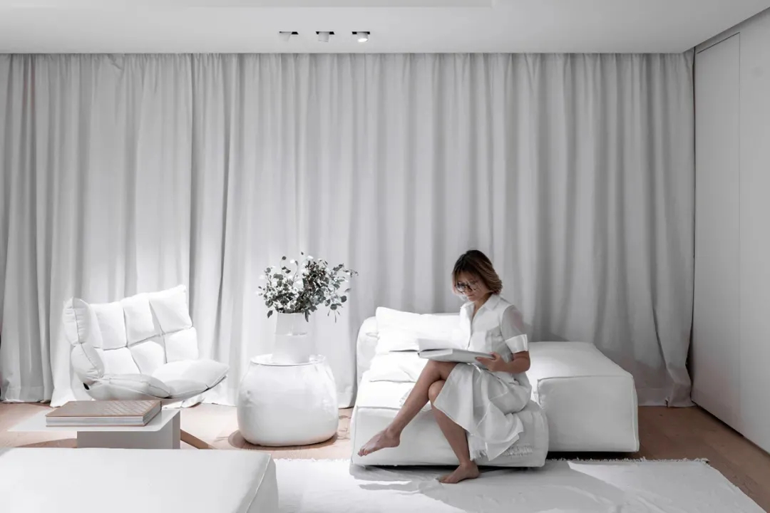 客厅以通透感为核心,摆放 Piero Lissoni 设计的 Extrasoft 白色沙发,形态柔和,触感舒适,为家人提供放松的休憩区域。自然光透过百叶窗均匀漫入,提亮整个白色空间,营造柔和明亮的氛围。角落点缀绿植,在极简底色中增添自然生气,还原现代简约的生活本真。