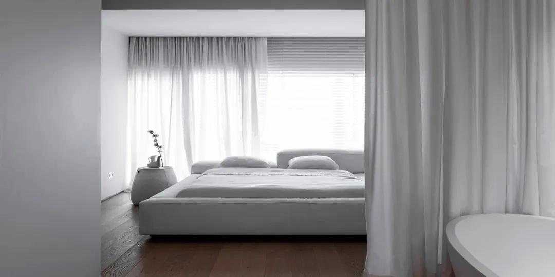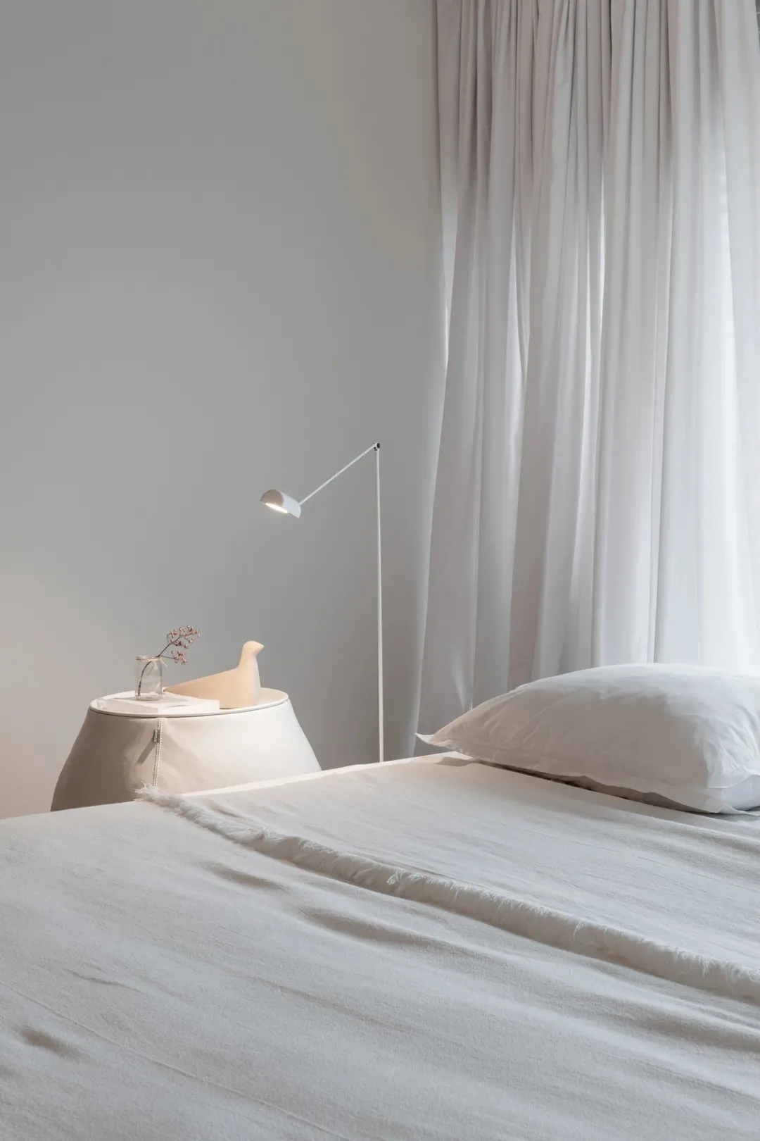 卧室以纯粹与舒适为设计重点,床品同样选用 Piero Lissoni 系列,质感柔软亲肤。大幅落地窗搭配白色纱帘,保证光线柔和入室,减少视觉压迫。空间无多余装饰,仅以极简暖色台灯作为辅助照明,营造安静、松弛的睡眠氛围。