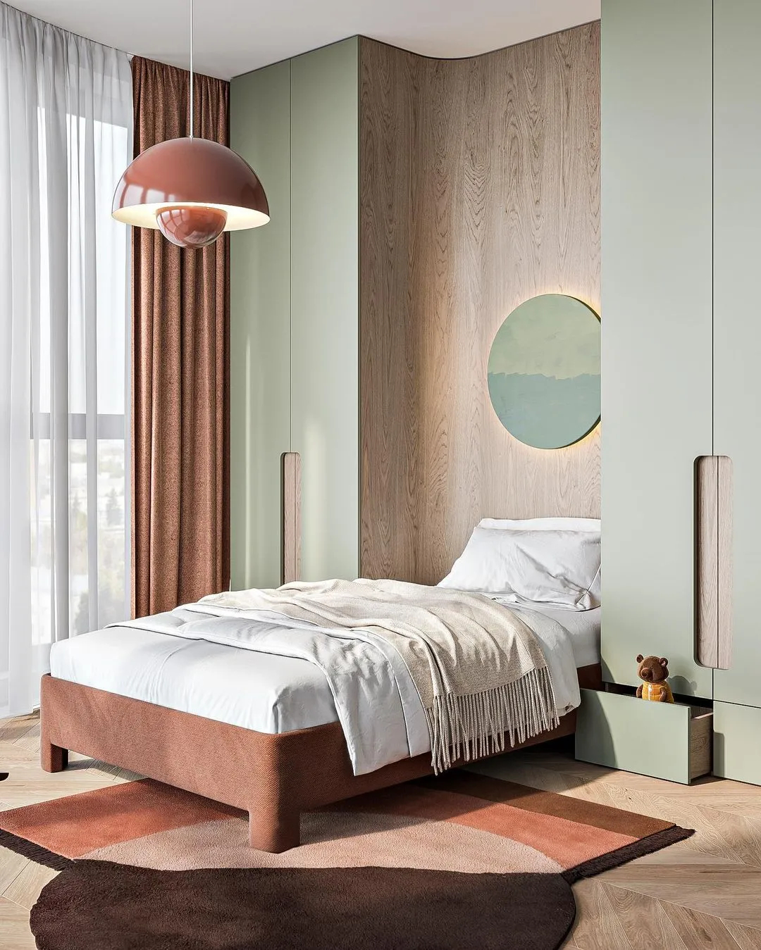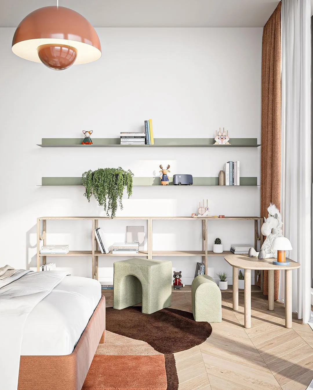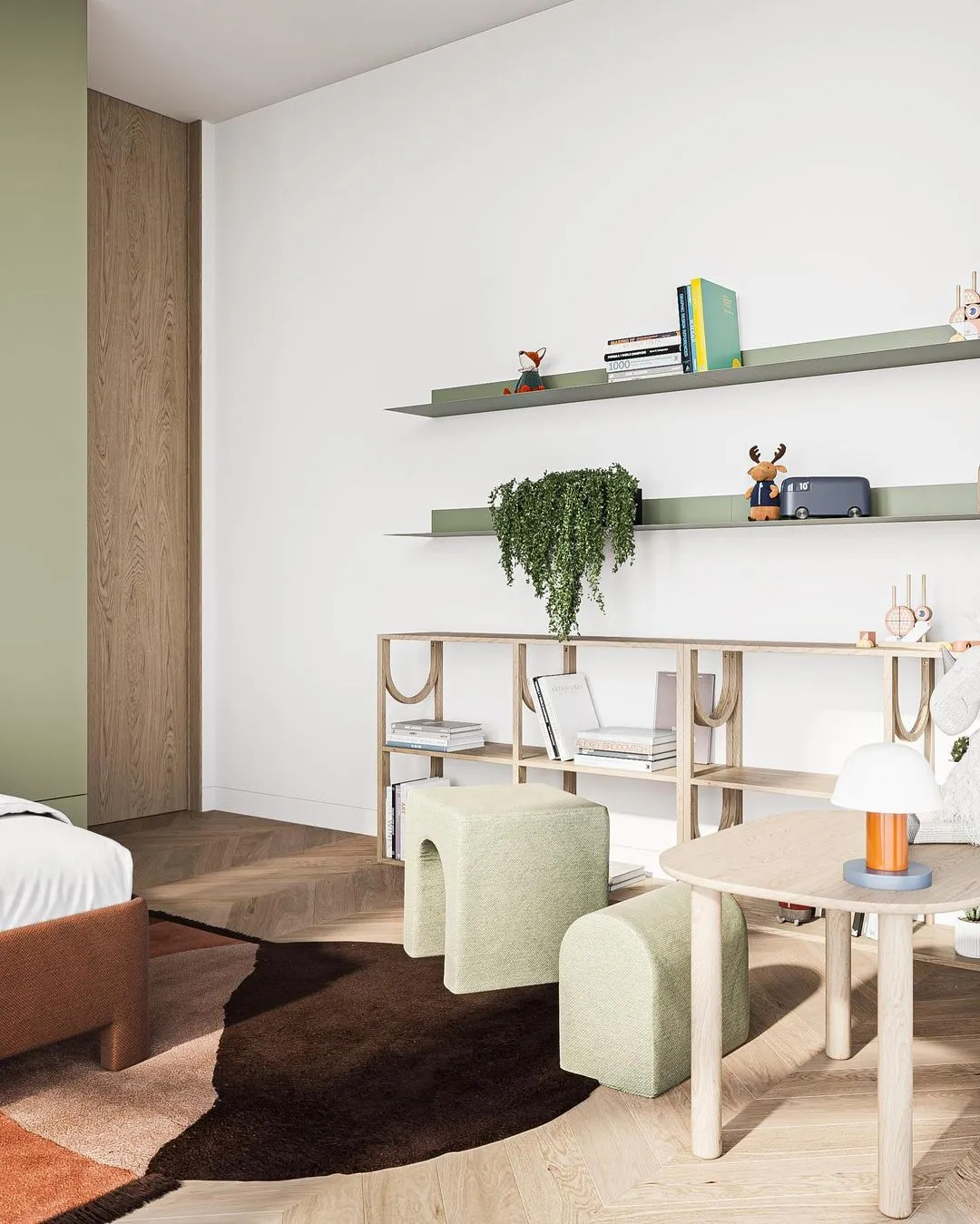 私密卧室区域兼顾风格统一与功能适配,每个空间都各具特色又相互关联。主卧以浅绿色床头与客厅形成风格呼应,简约的装饰元素让空间干净整洁;窄边框玻璃门的运用增添轻奢质感,窗边精心设置的书桌打造出专属办公区,满足主人居家办公的需求,绿植的点缀则为空间注入自然生机。另一间卧室选用清爽蓝色调,搭配精致摆件,同样嵌入办公功能区,让空间利用率大幅提升,适配不同居住需求。次卧也融入绿色元素呼应全屋风格,浅红色系与浅绿色系的碰撞搭配出高级质感,再辅以实木元素点缀,延续了整体温馨舒适的居家氛围。