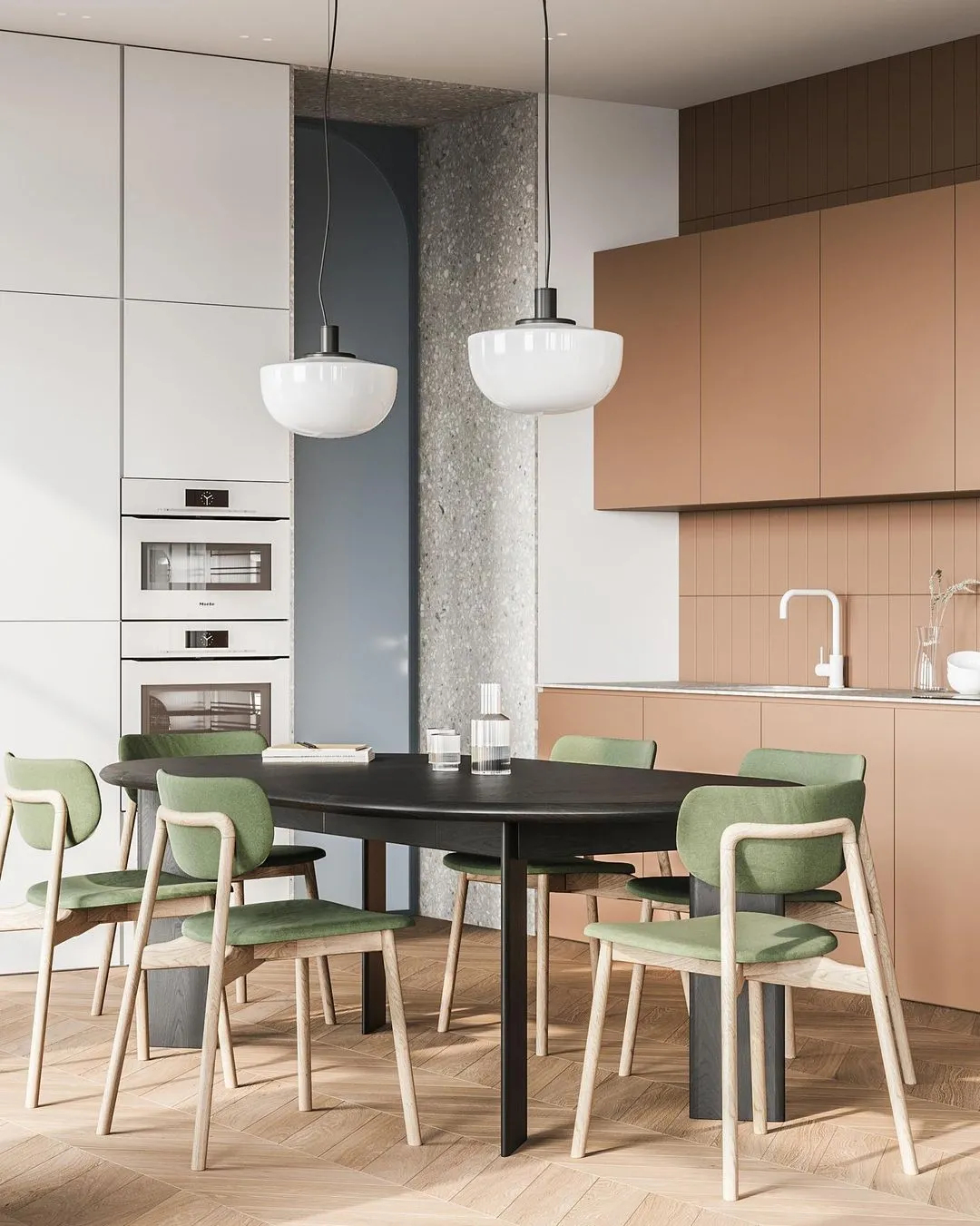 餐厅空间延续整体简约风格,同时通过细节设计强化温馨质感。浅绿色餐椅与客厅沙发形成巧妙呼应,让全屋色调更具连贯性;浅白色墙面干净明快,搭配餐椅、墙面装饰及柜体采用的质朴实木材质,温润的木质感扑面而来,让用餐场景充满家庭温情,成为凝聚家人情感的重要场所。